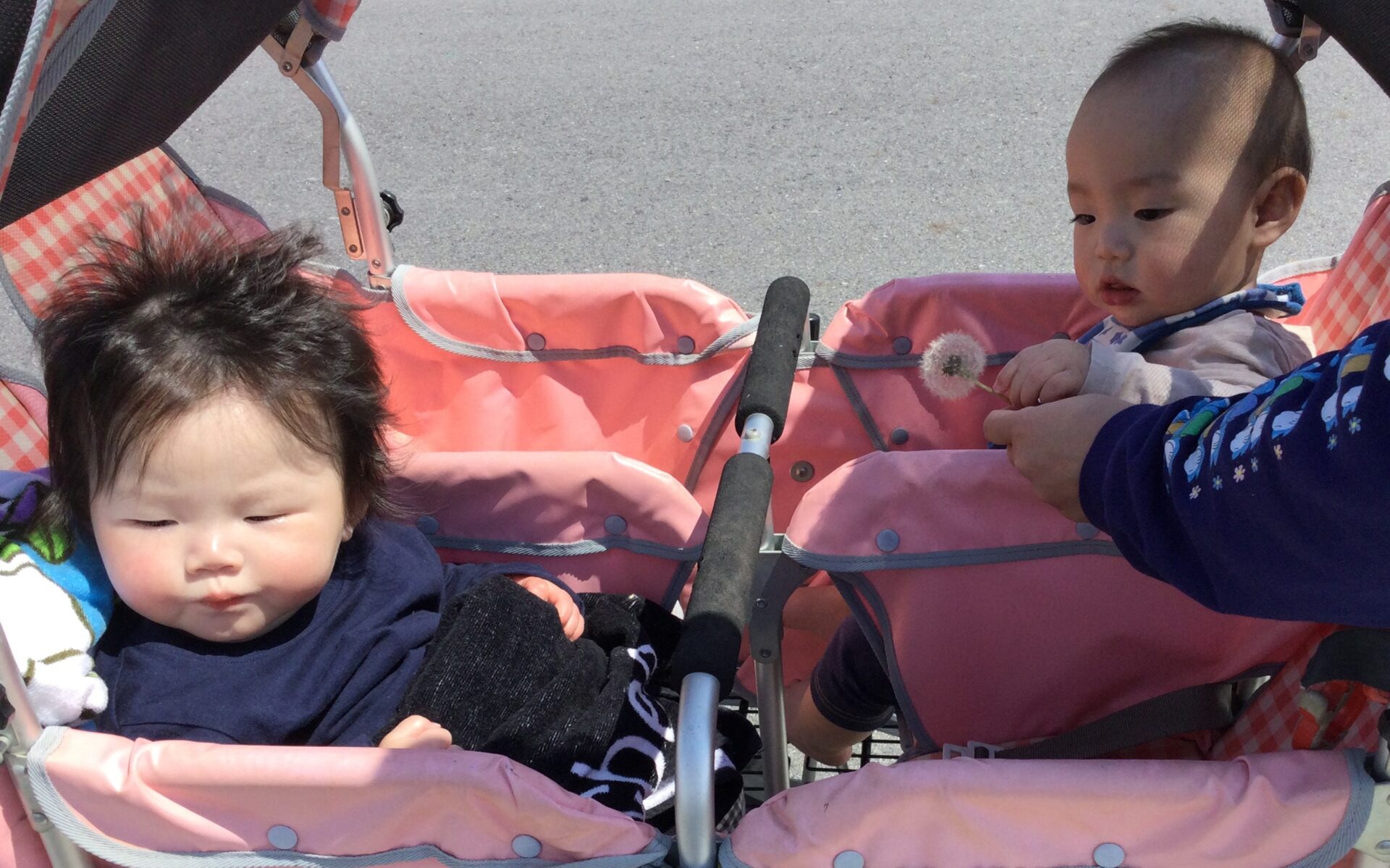 散歩車に揺られて気持ち良さそうな子どもたち。