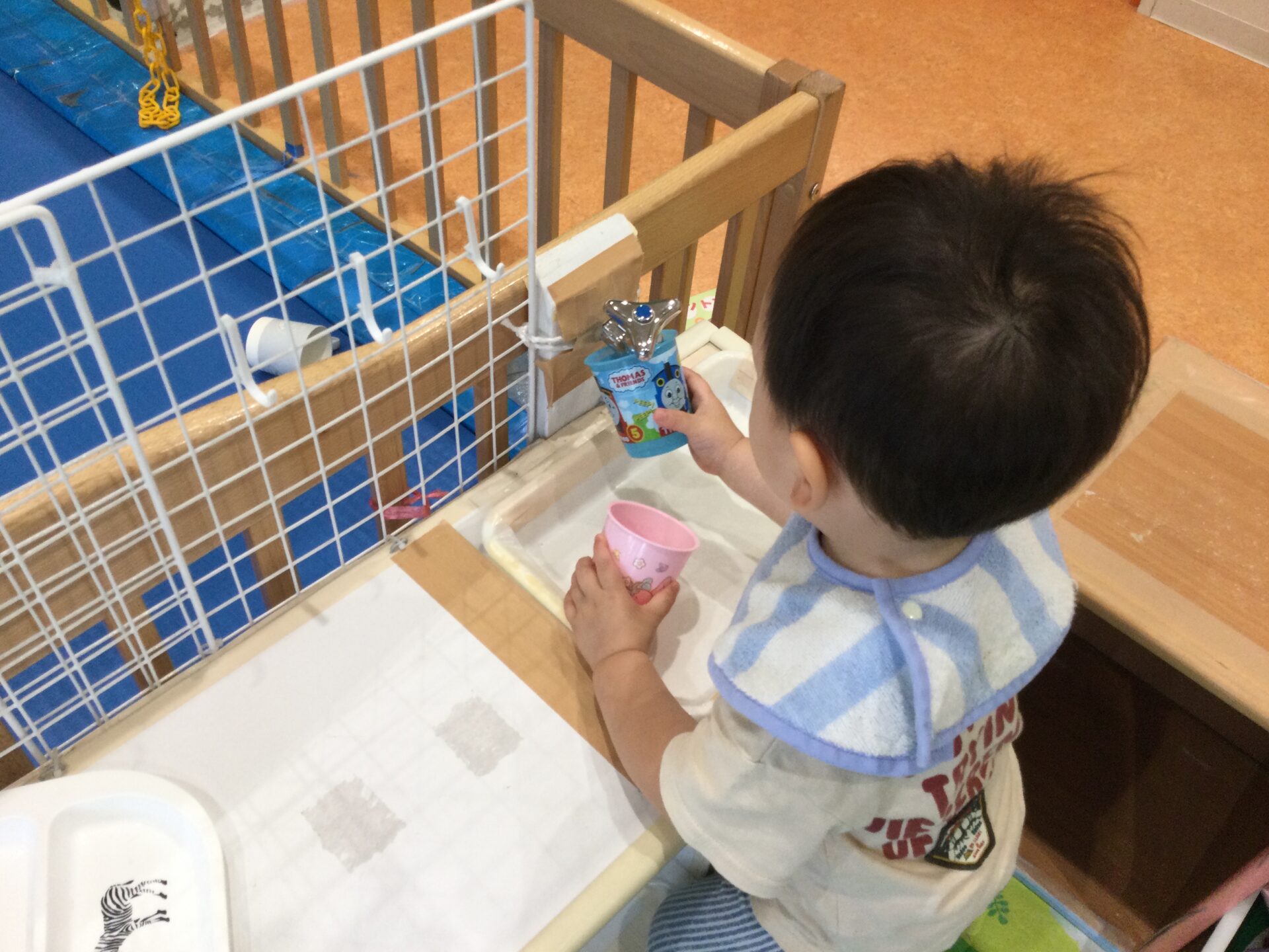 おままごとのキッチン台の蛇口をひねり、コップに水を入れるマネをしたり、