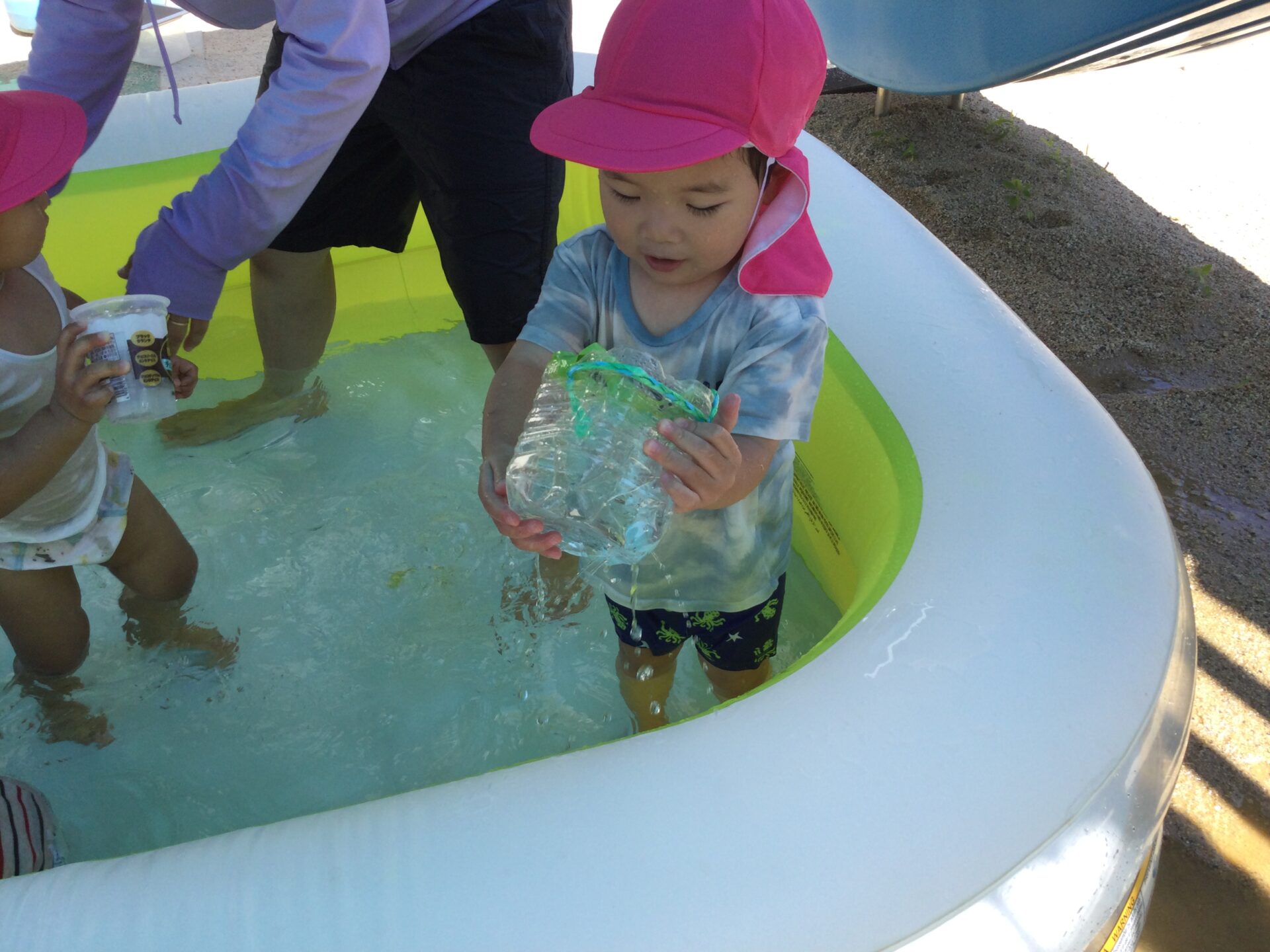 その後はカップで水をすくったり、ペットボトルのシャワーで遊びました。