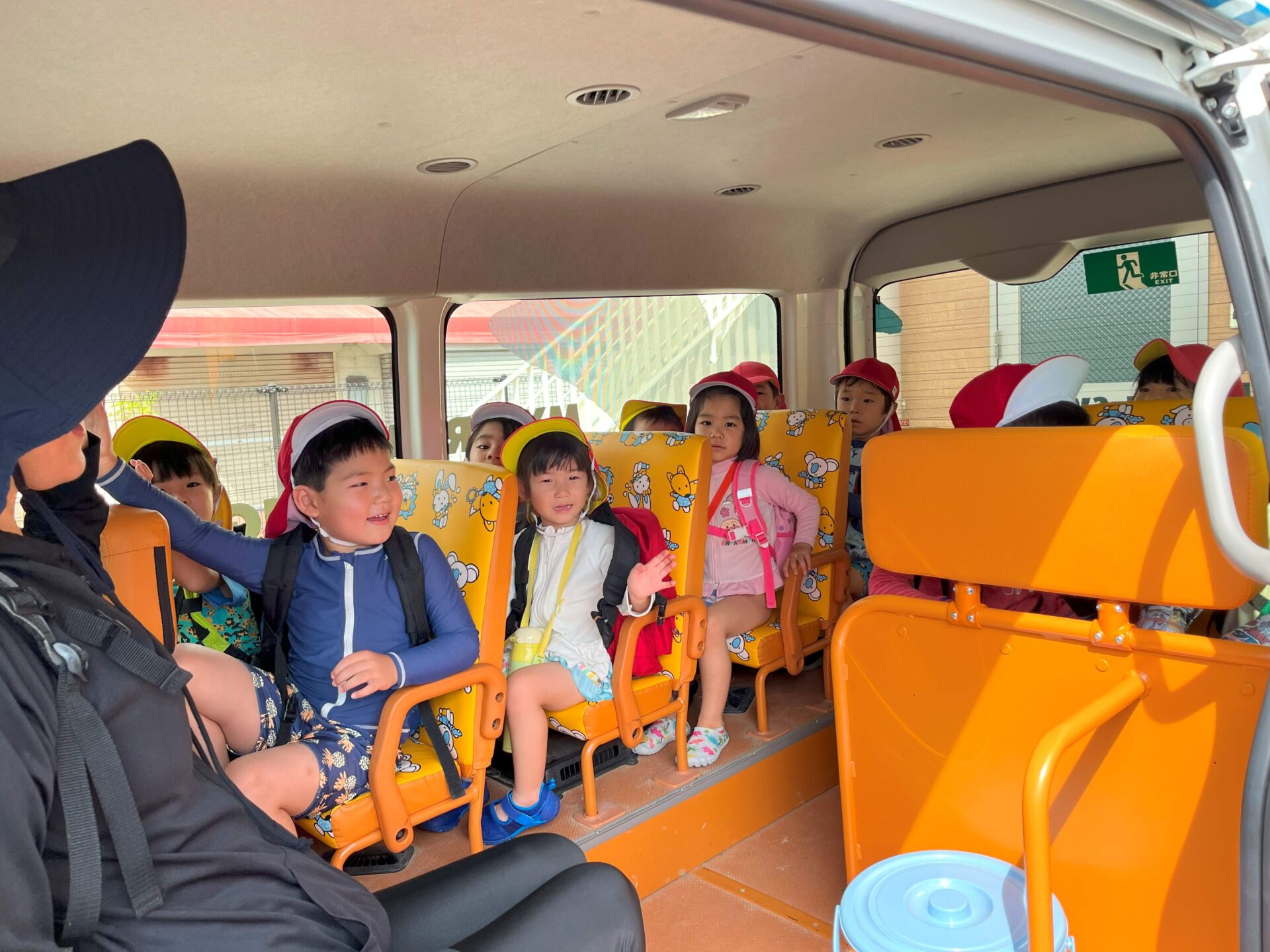 「いってきま~す」と他のチームの友だちに手を振り、園バスに乗って出発です。