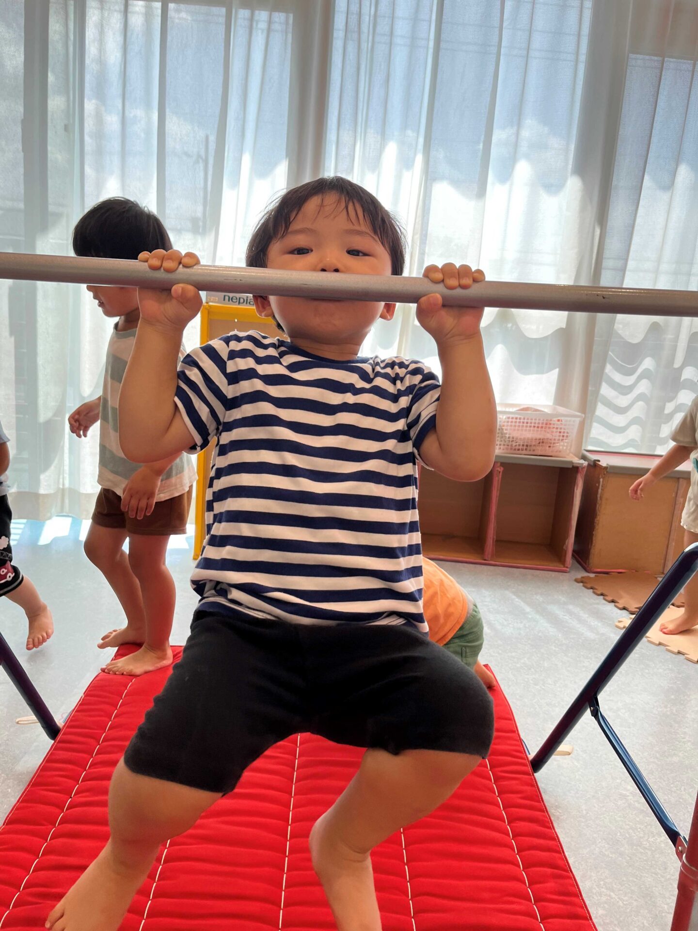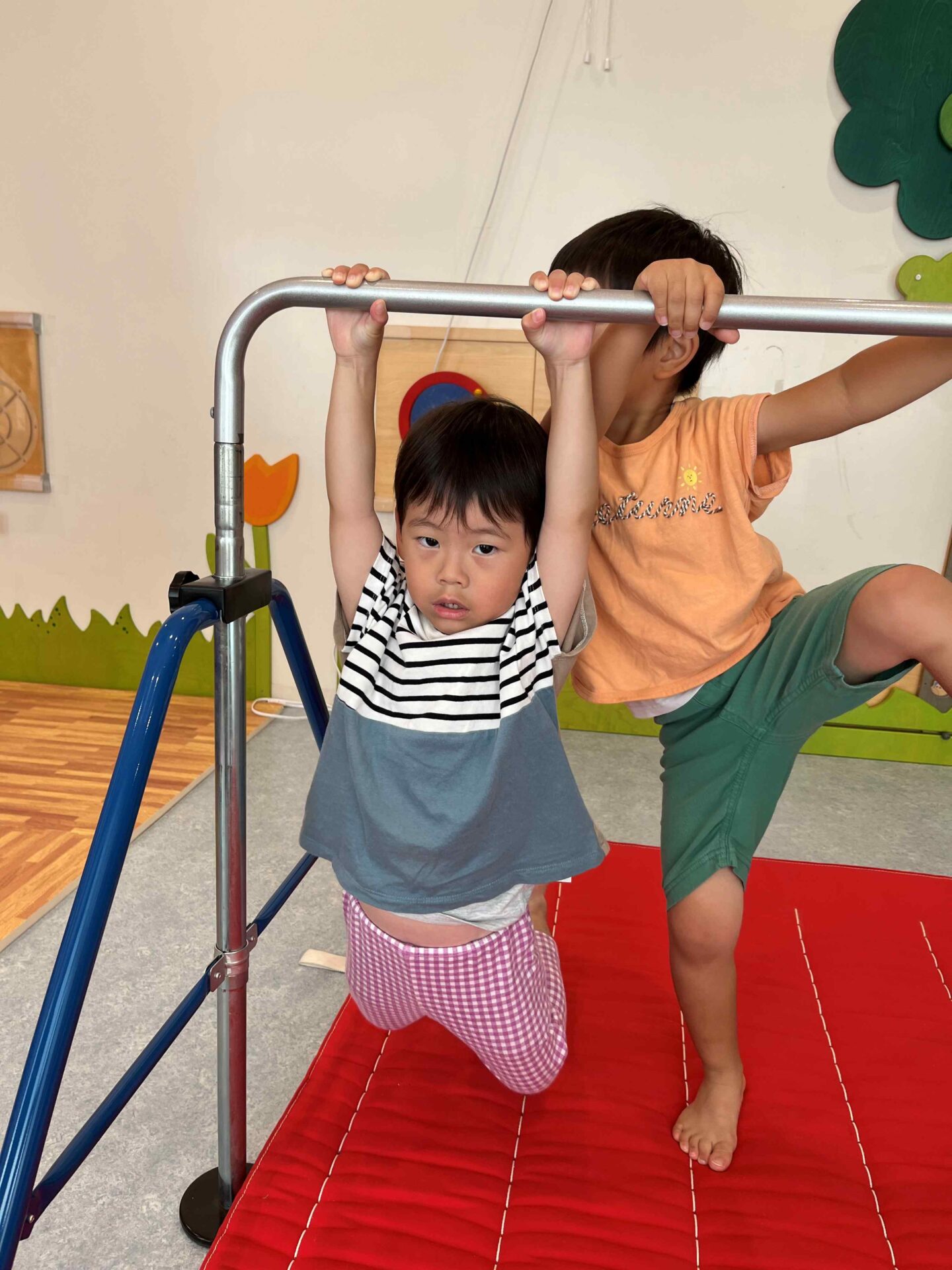 鉄棒をしっかり掴んでぶら下がります(*^-^*)