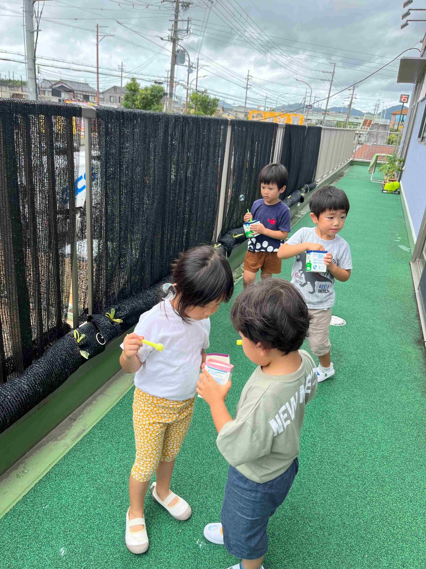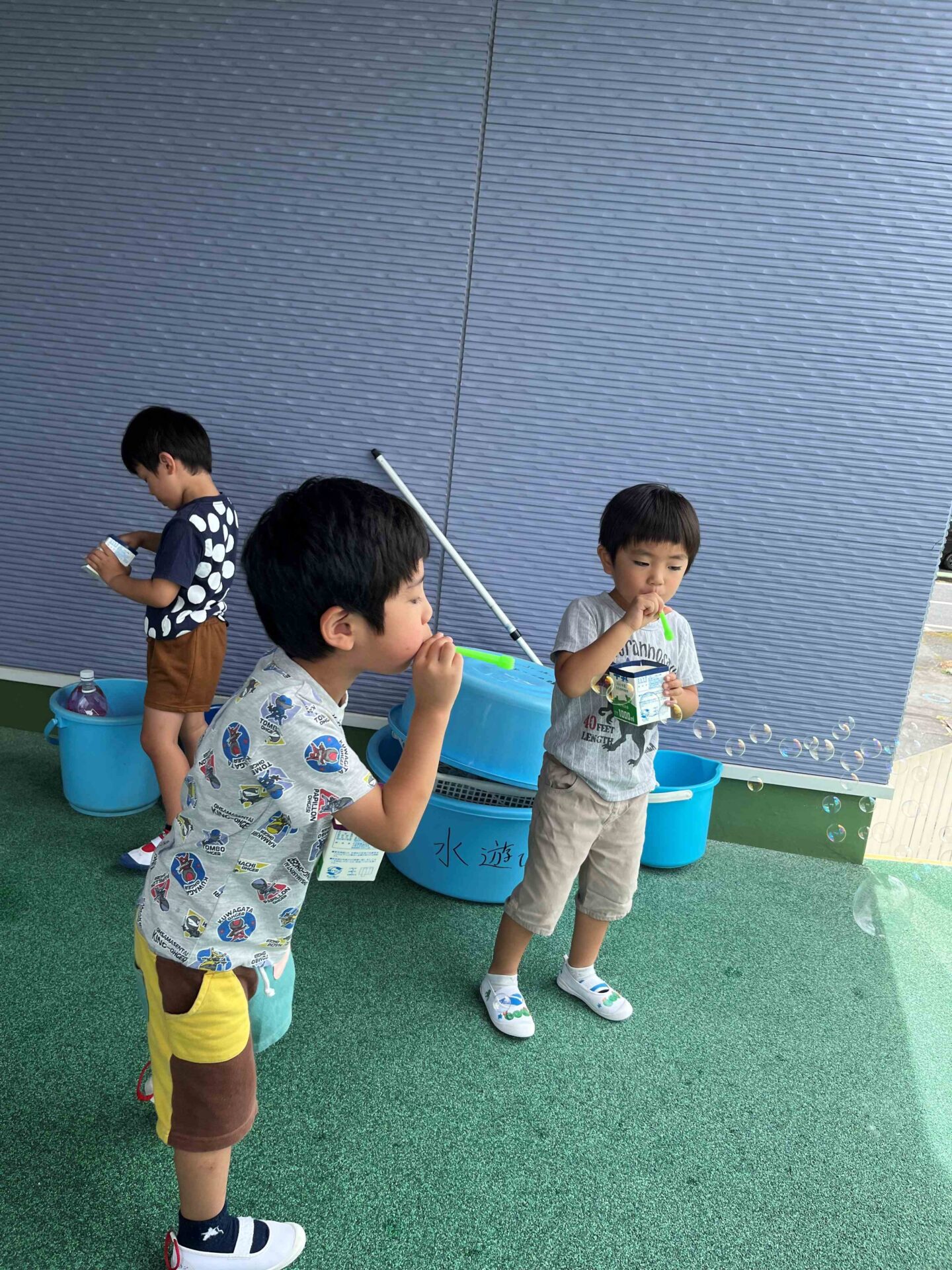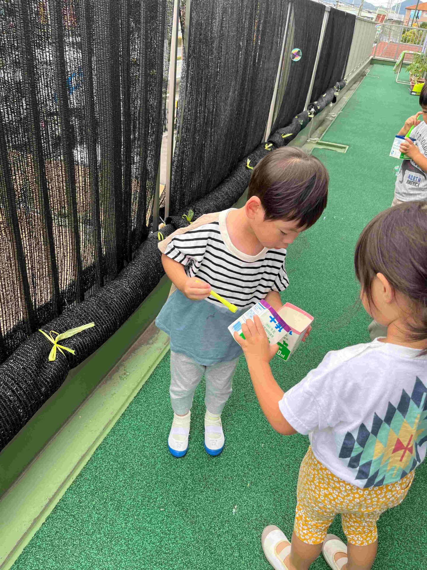 シャボン玉液みんなで分けわけして遊んでね(^^♪と声をかけると