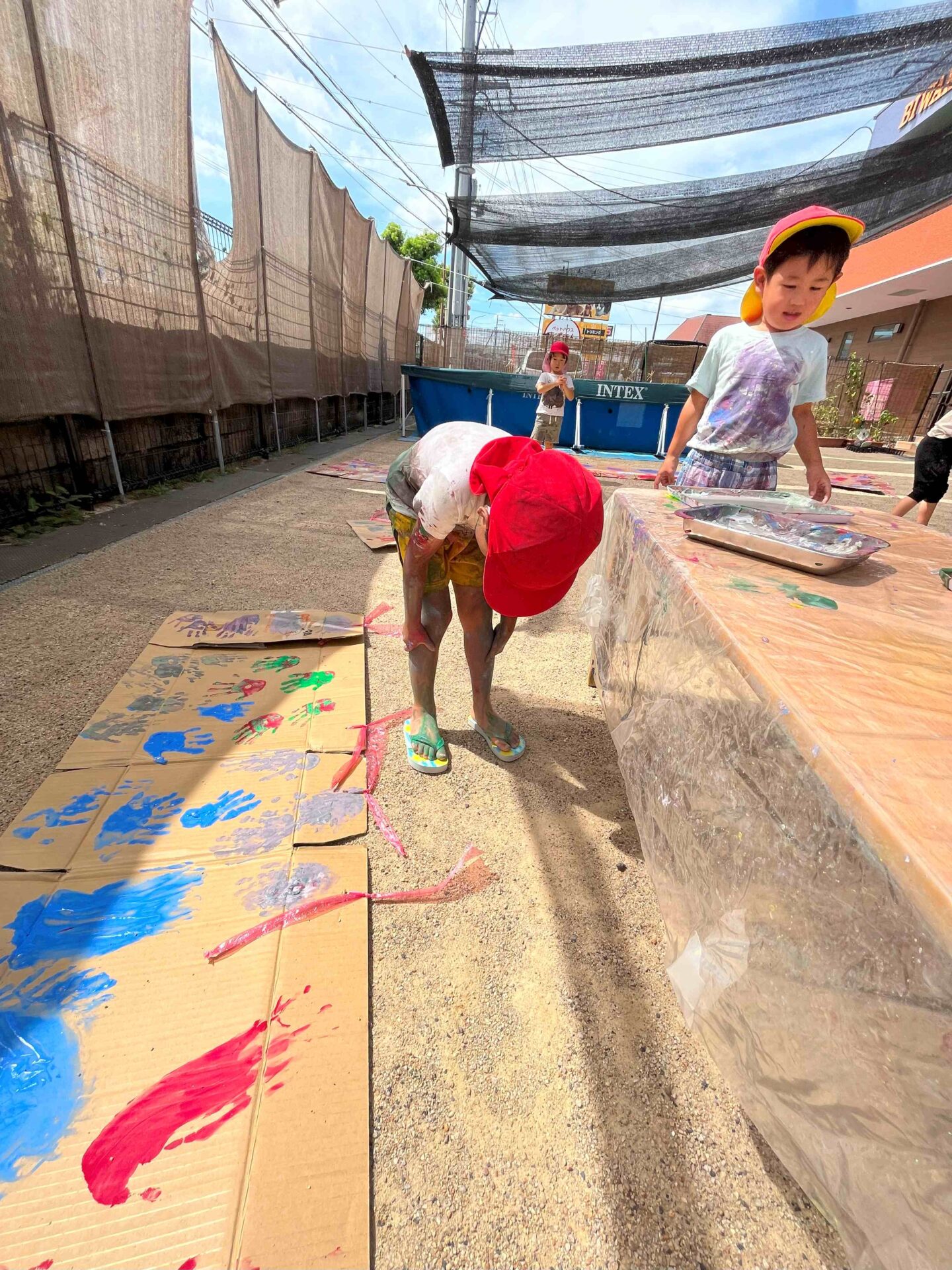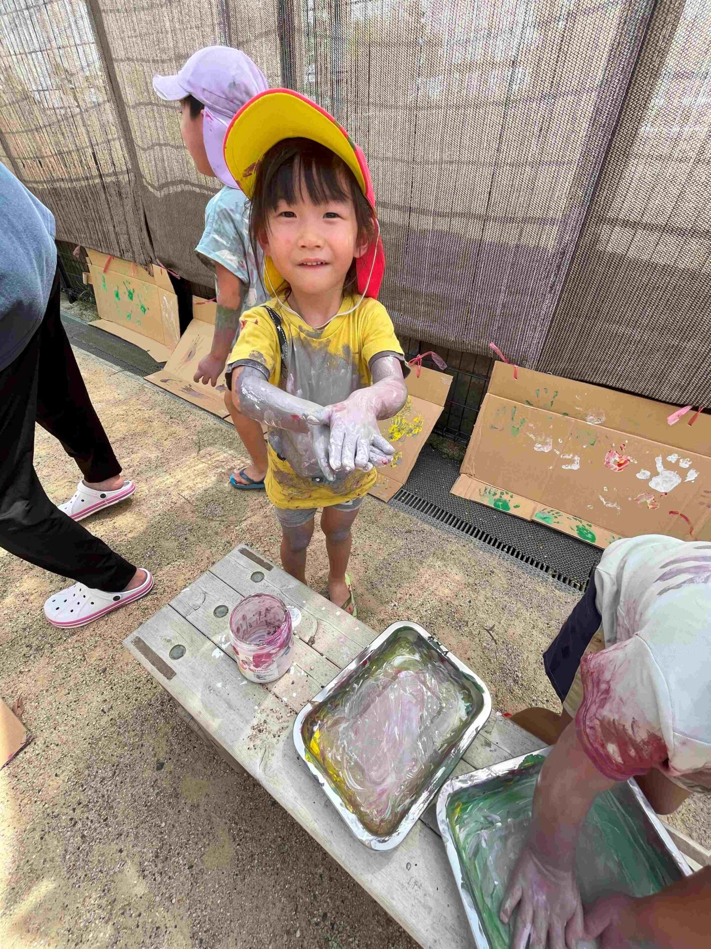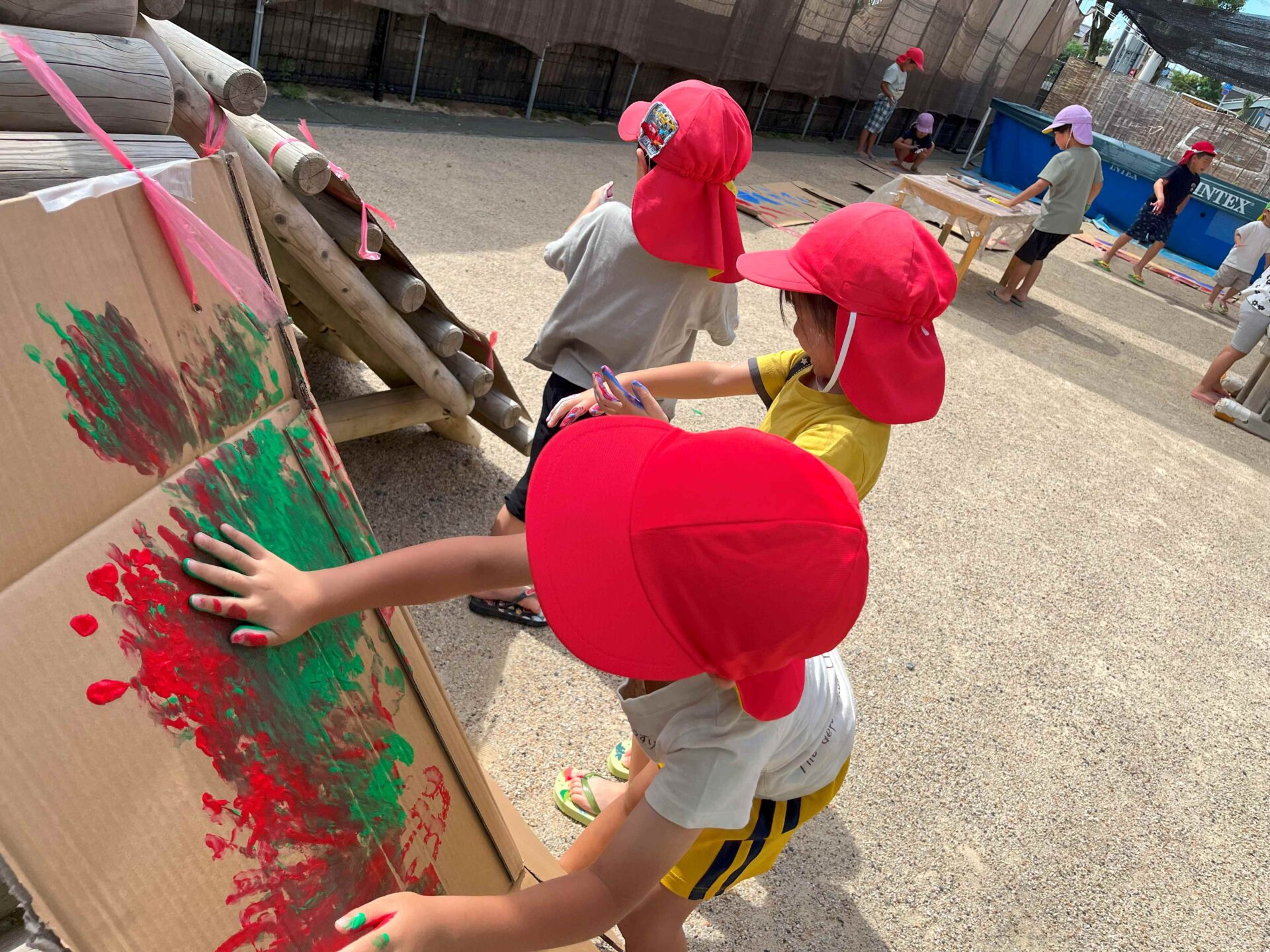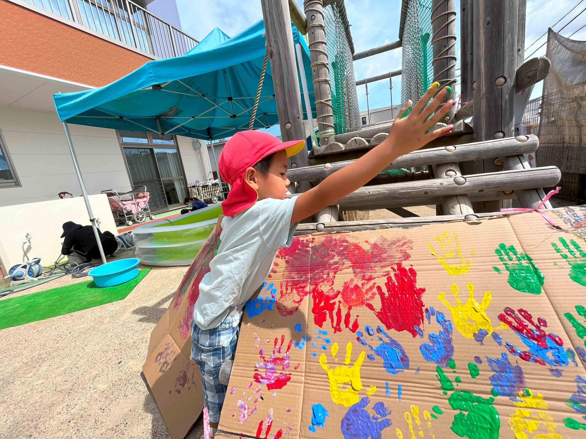 手形スタンプがおもしろくて、もっとペタペタ♪ 腕を大きく動かして、段ボール全体に絵の具をつけていました😆