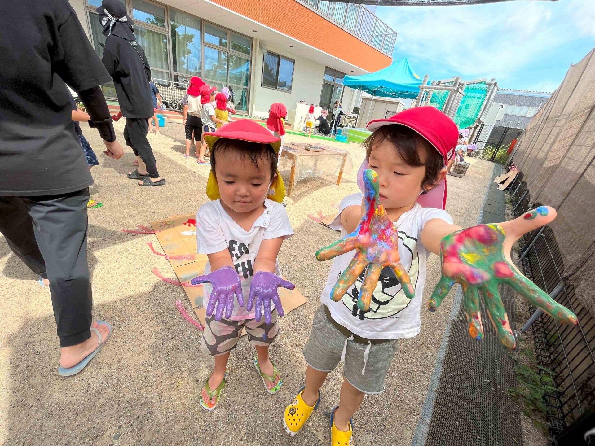 絵の具を手足、腕、顔、服にもつけて、友だちと見せ合いっこして、楽しそうに笑う姿がたくさんみられました😊