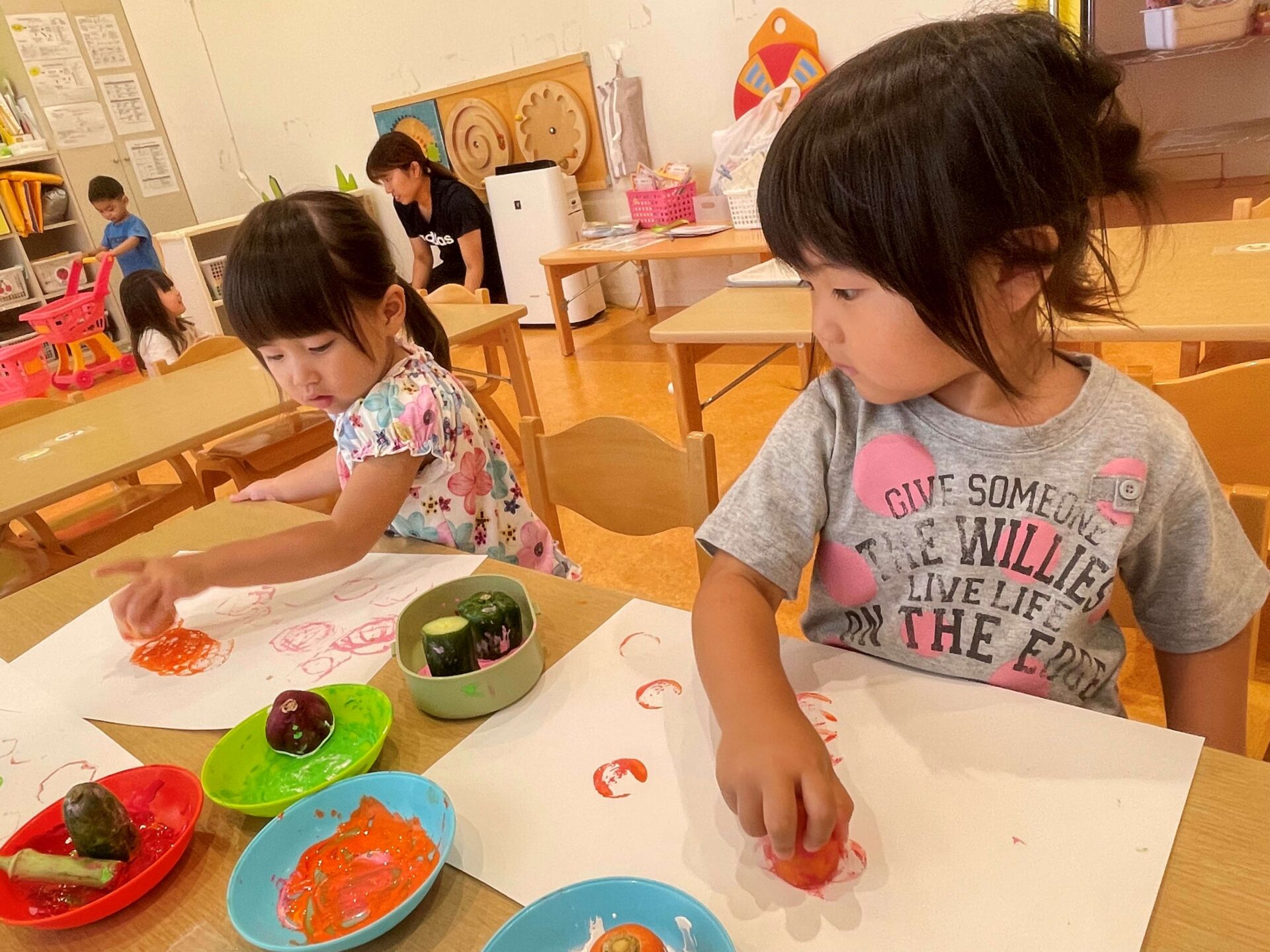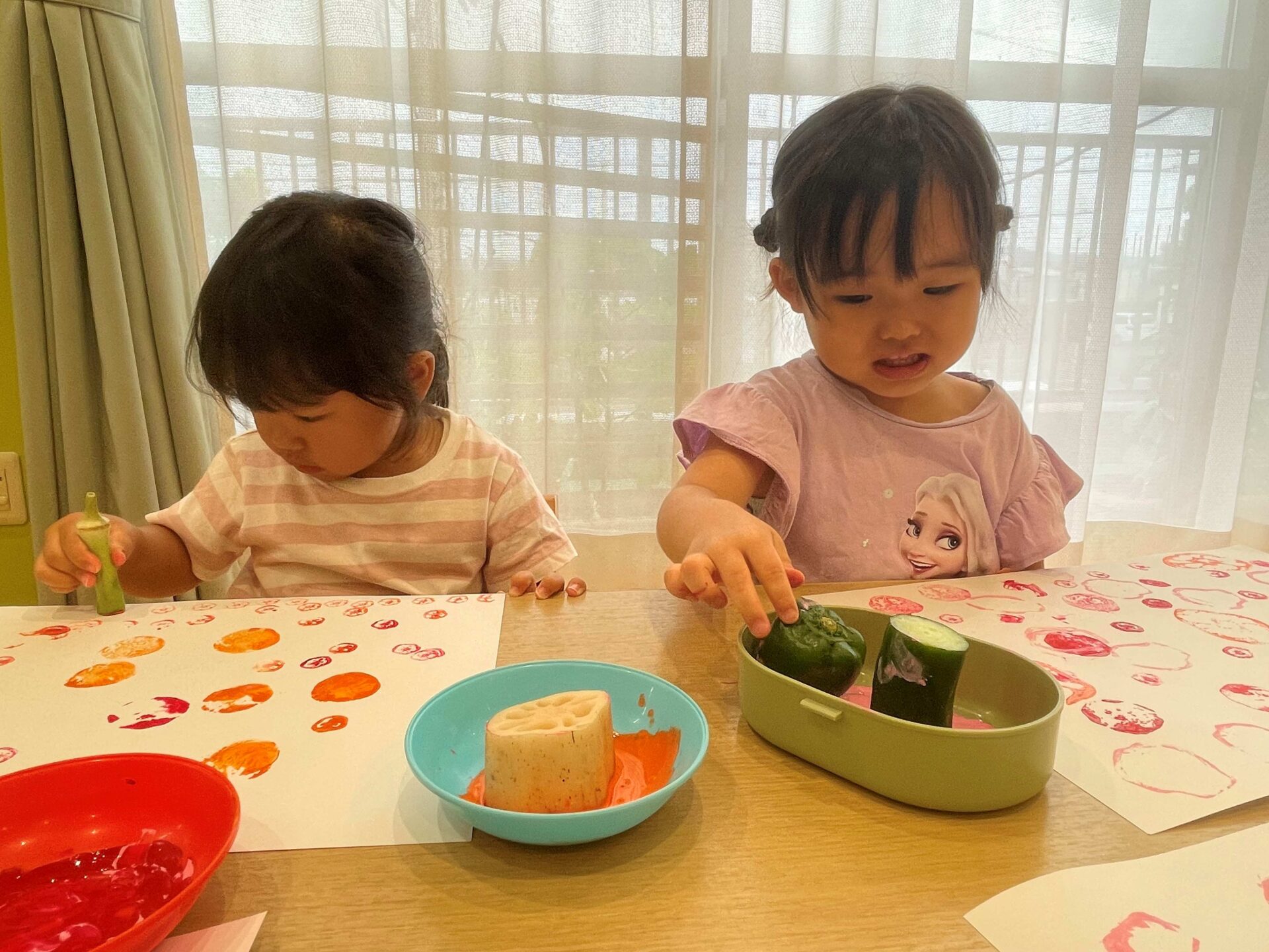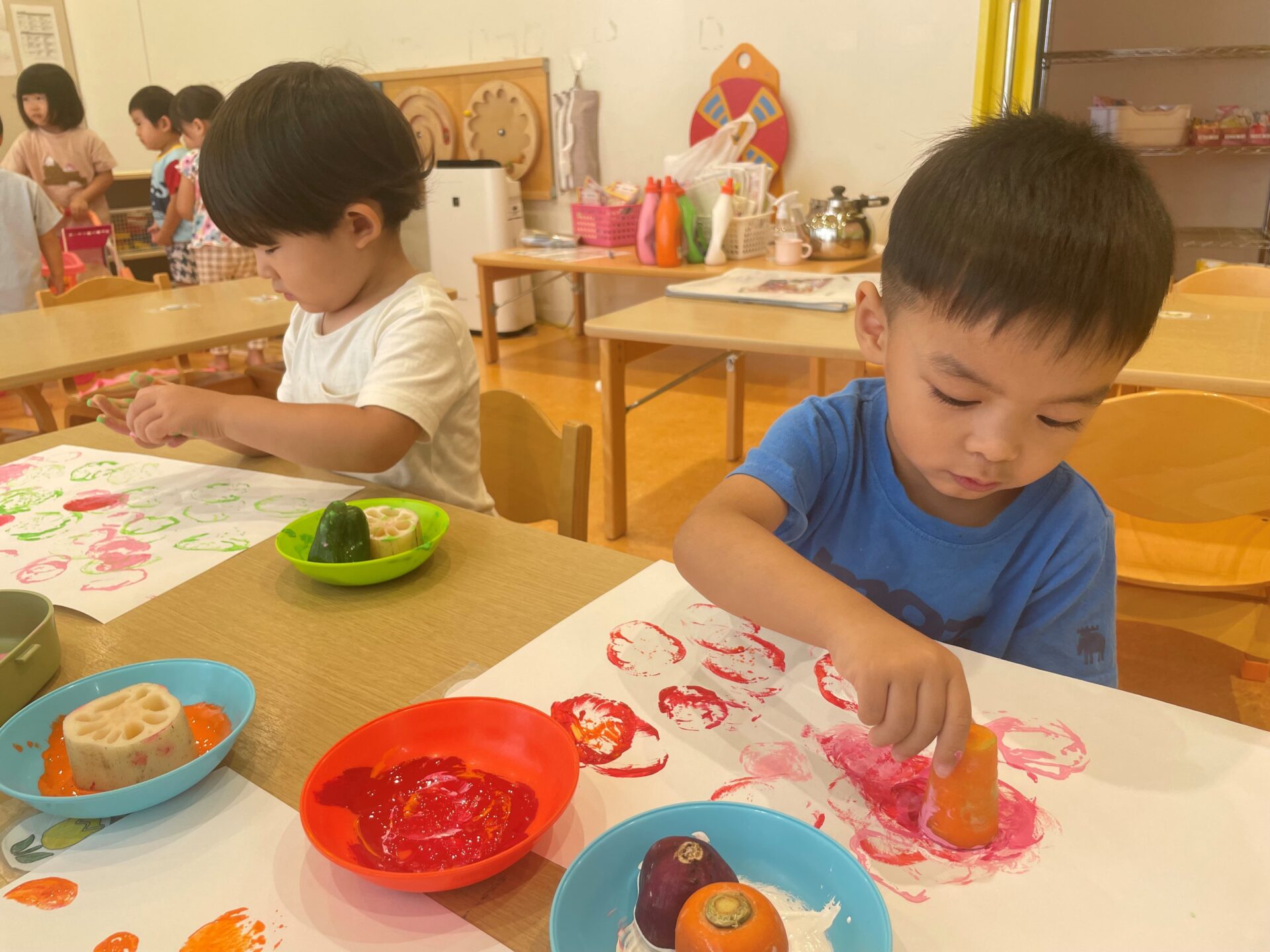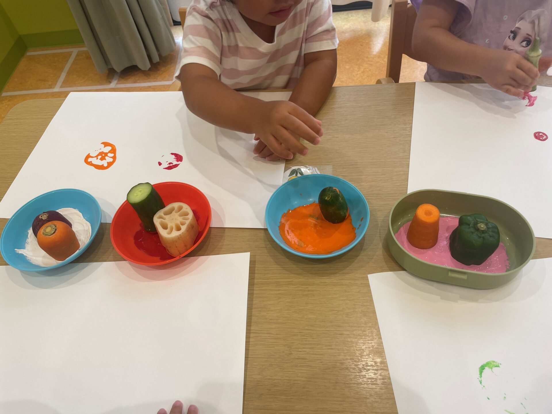 色々な野菜を重ねてスタンプしたり、絵の具の色を