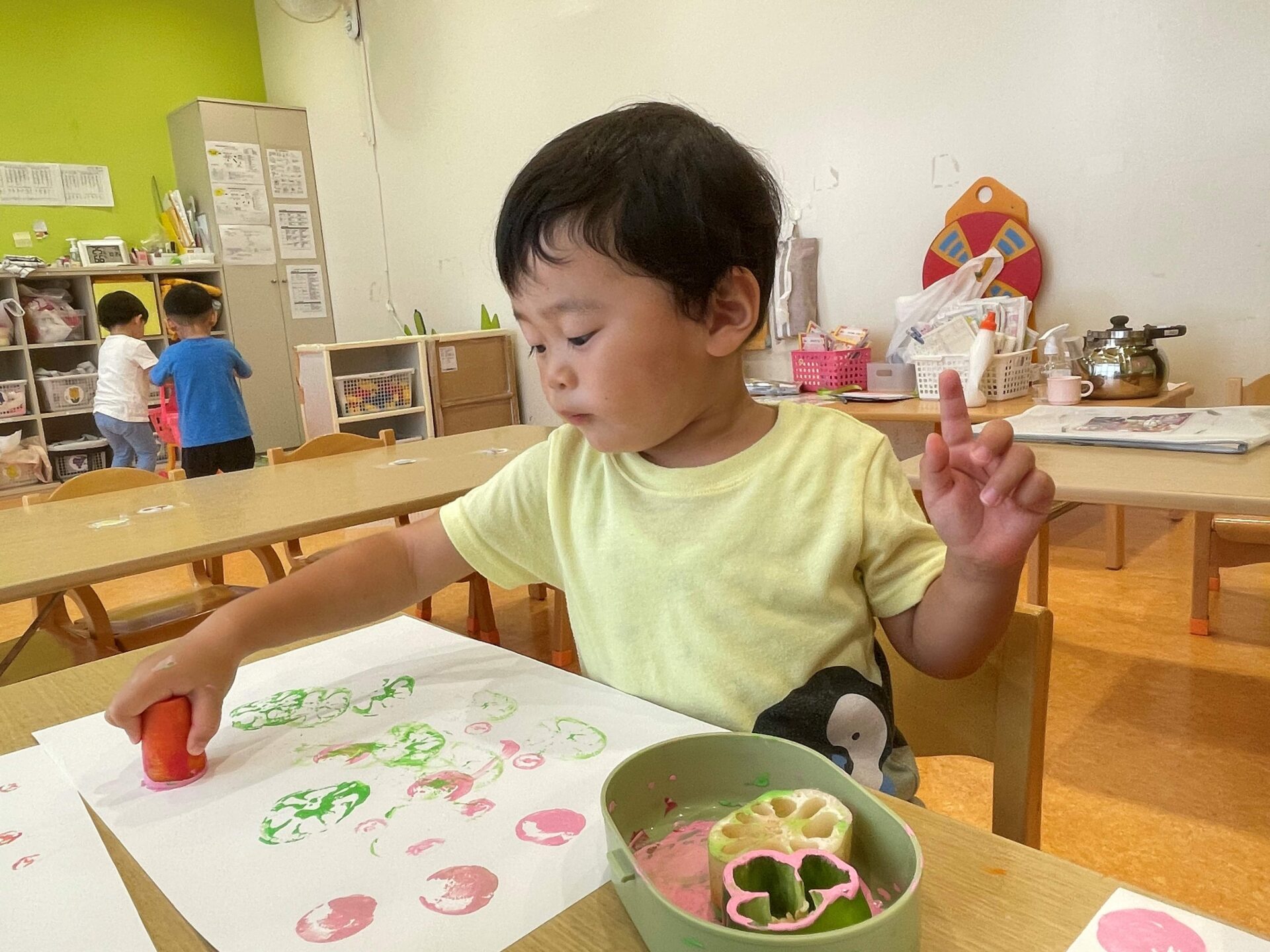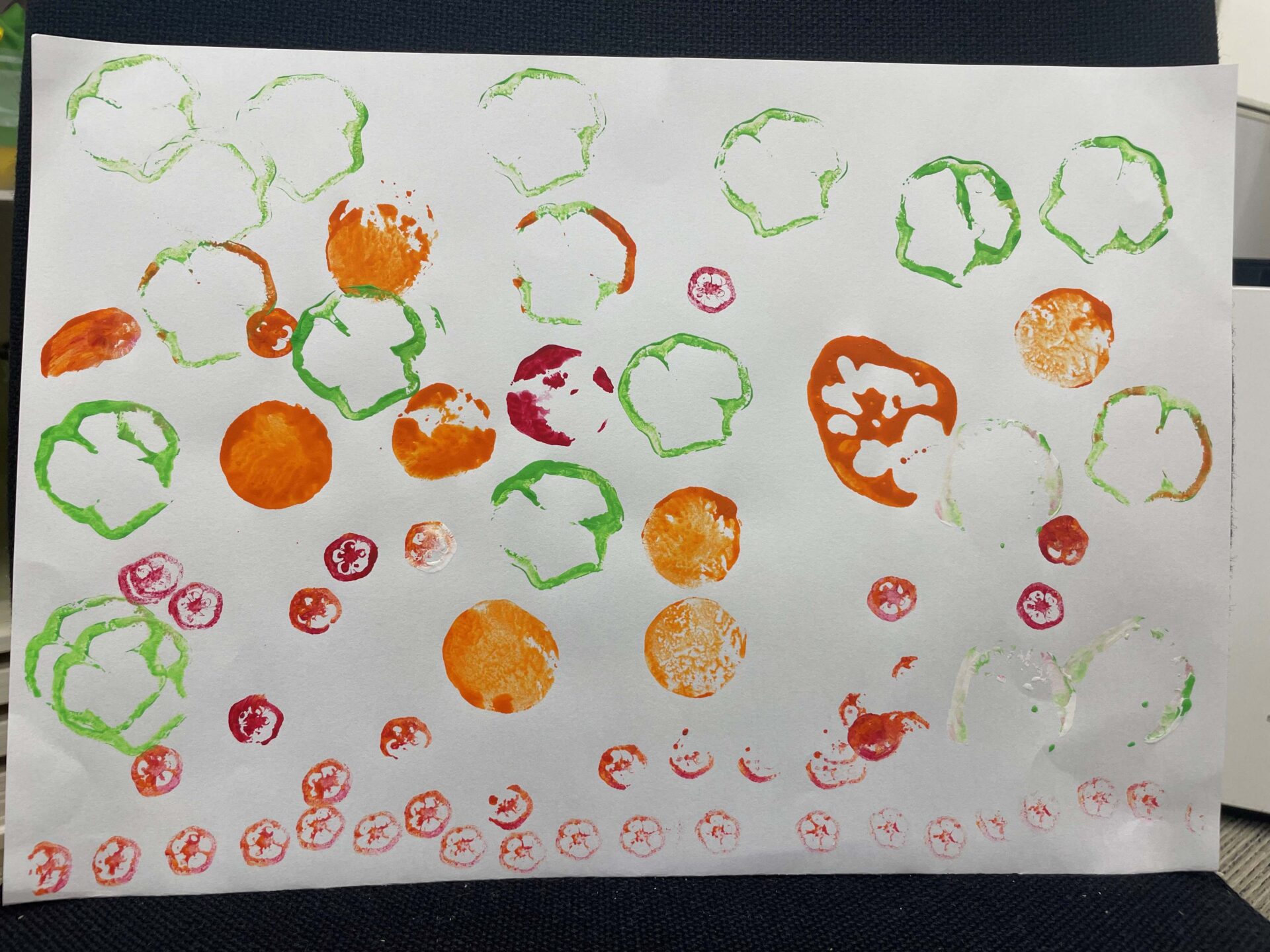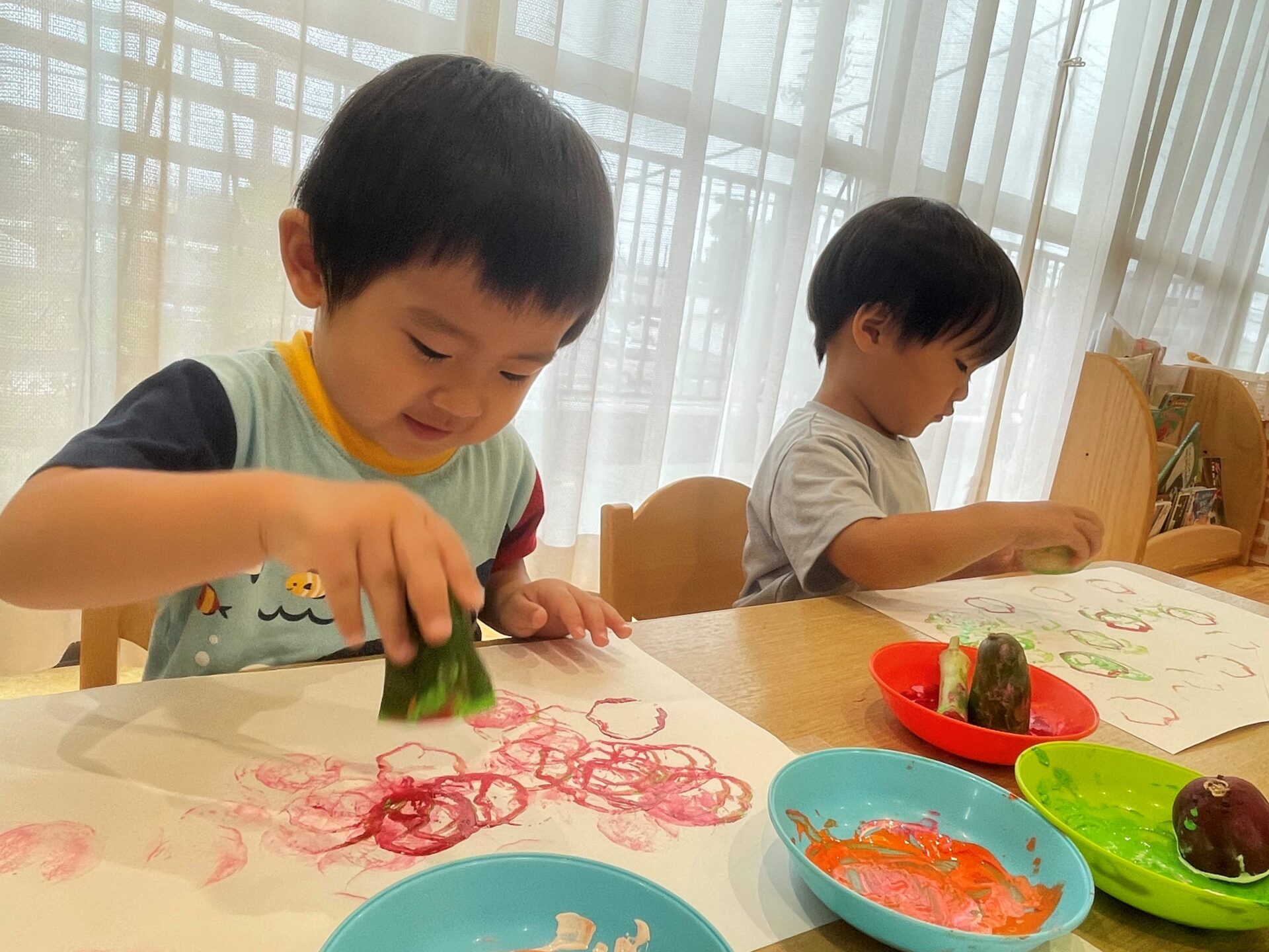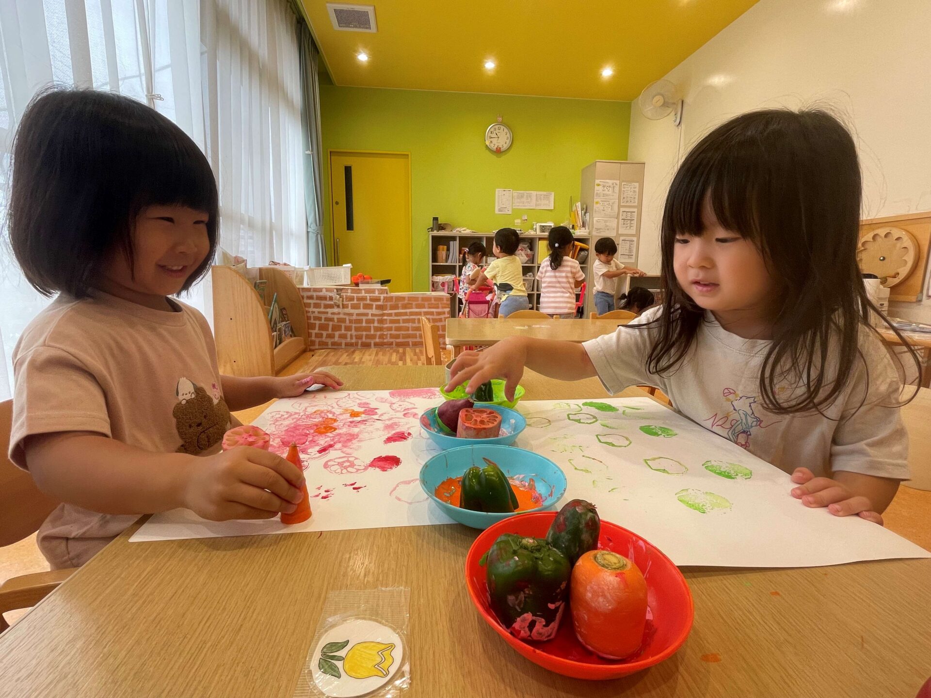 色々な野菜を重ねてスタンプしたり、絵の具の色を