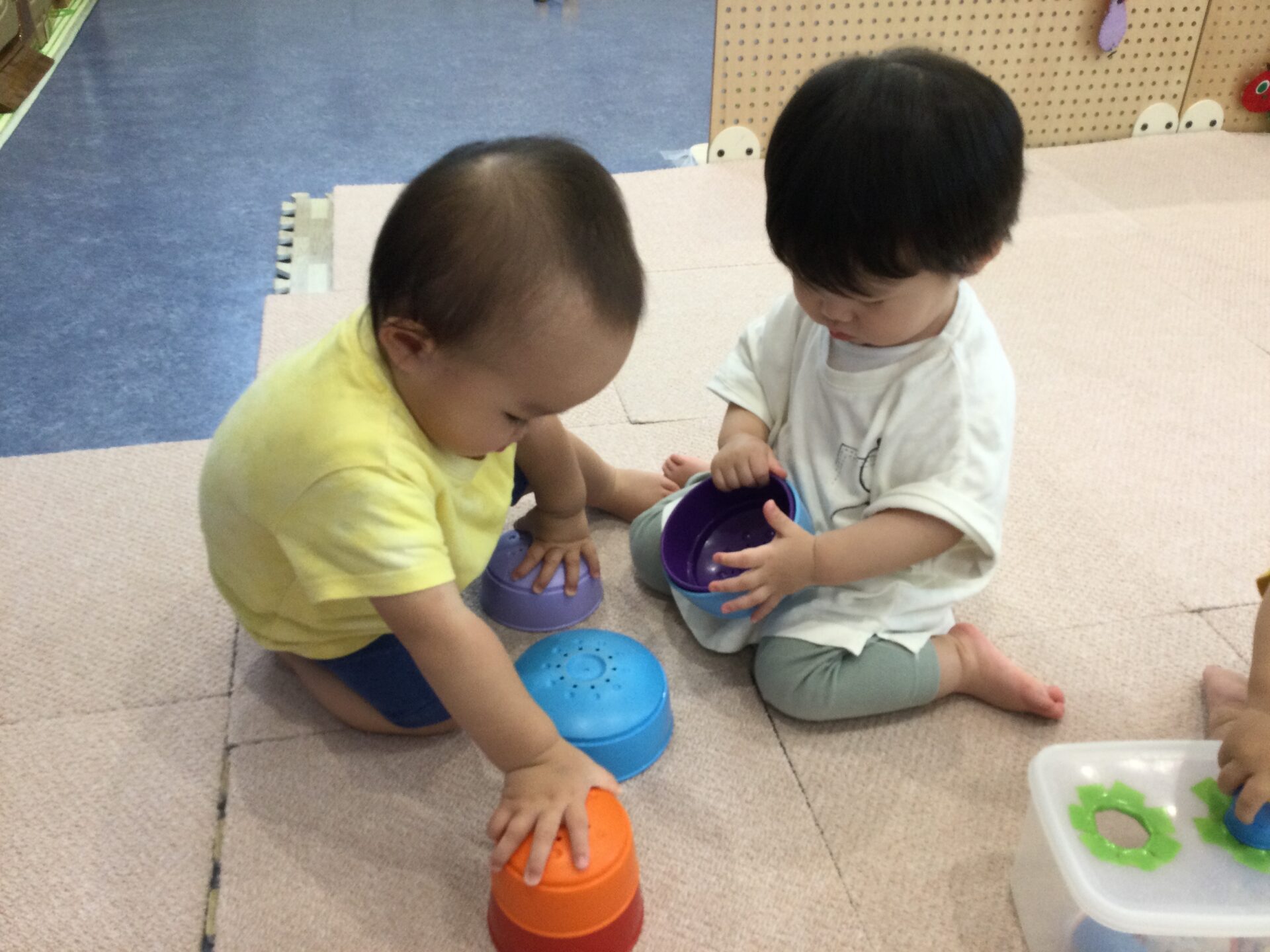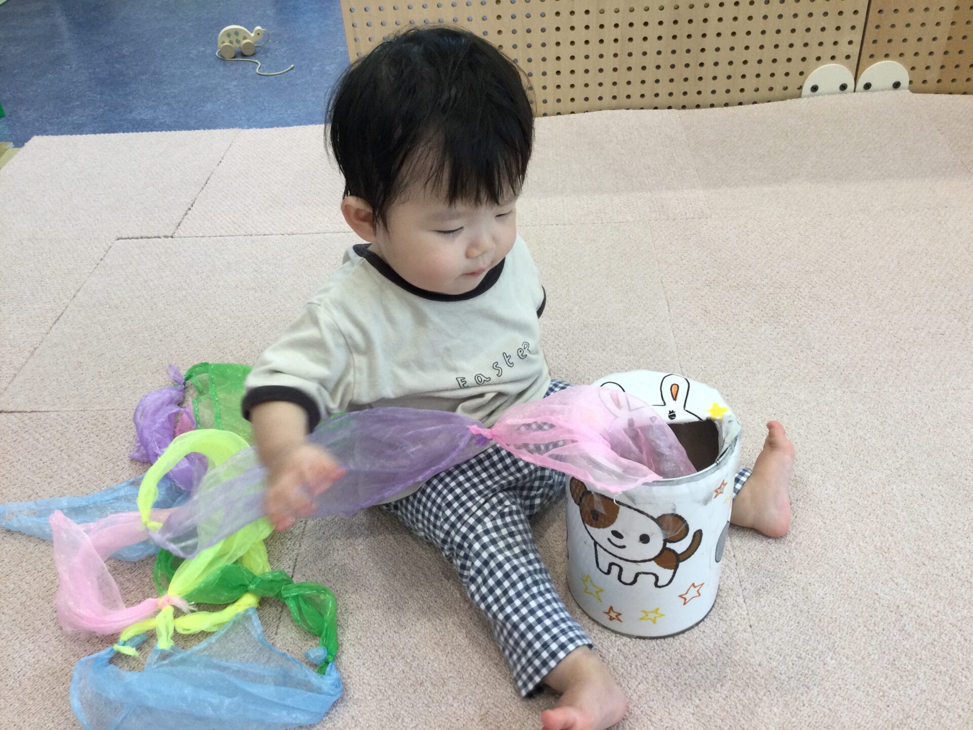 ポットン落としはみんな大好きで、とても集中して入れています。いっぱいになると蓋を開けてほしいことを保育者に訴えて、何回も遊んでいます。