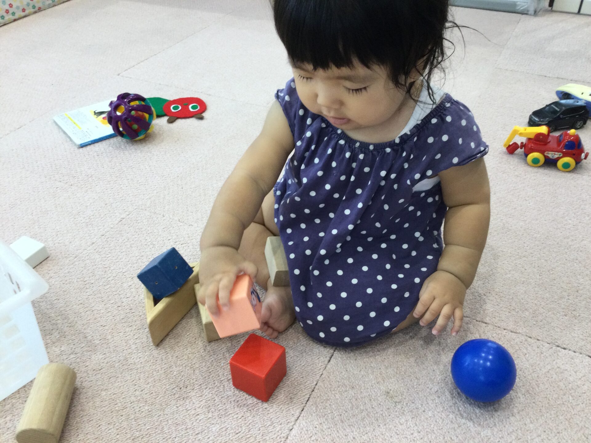 保育者が積んだ積み木を倒すのが好きな子どもたち。自分で積もうとすることもあります♪よいしょっ!・・・積めた時には「できた~!」と嬉しそうな表情で保育者の方をみてくれます😊