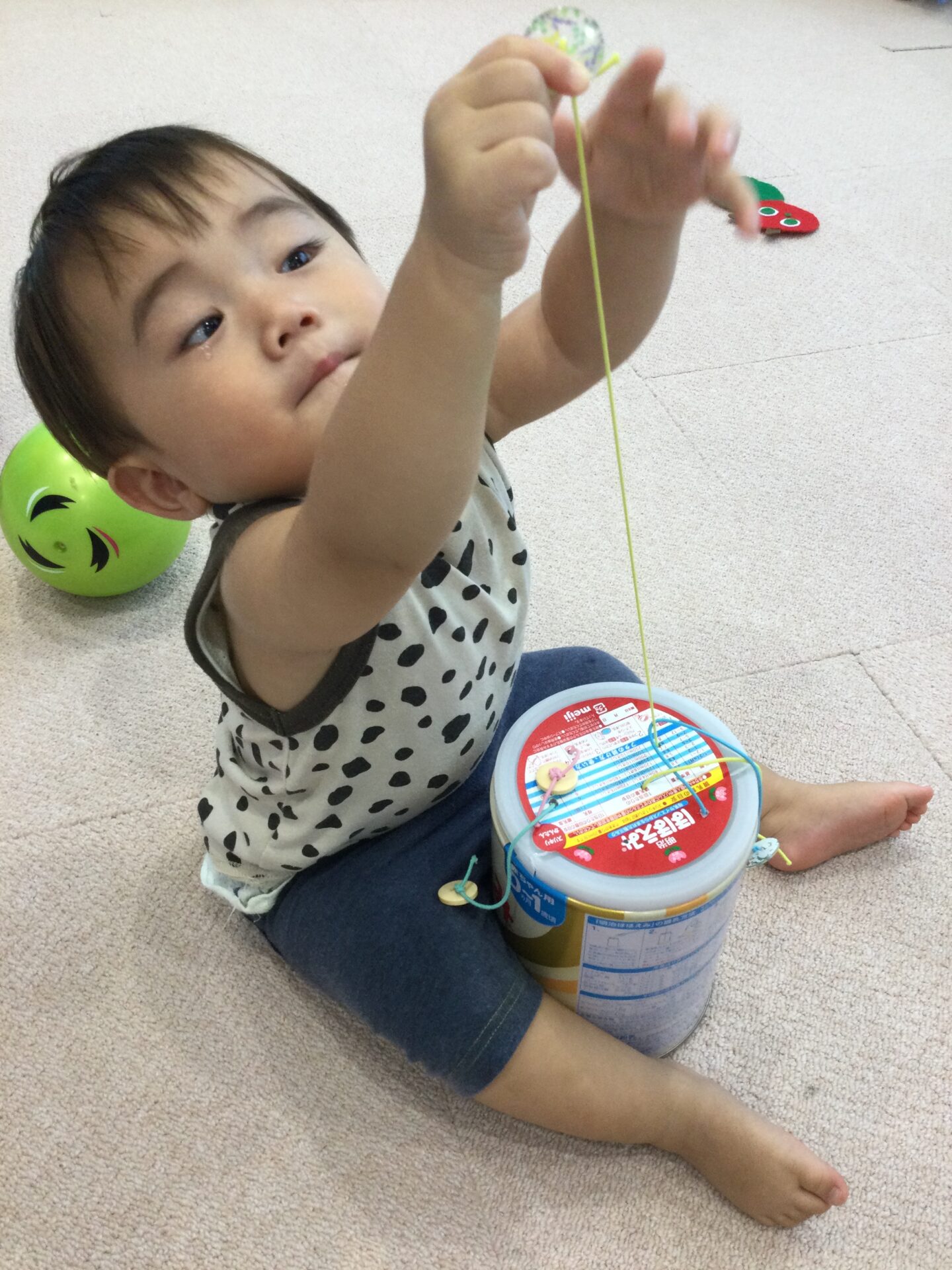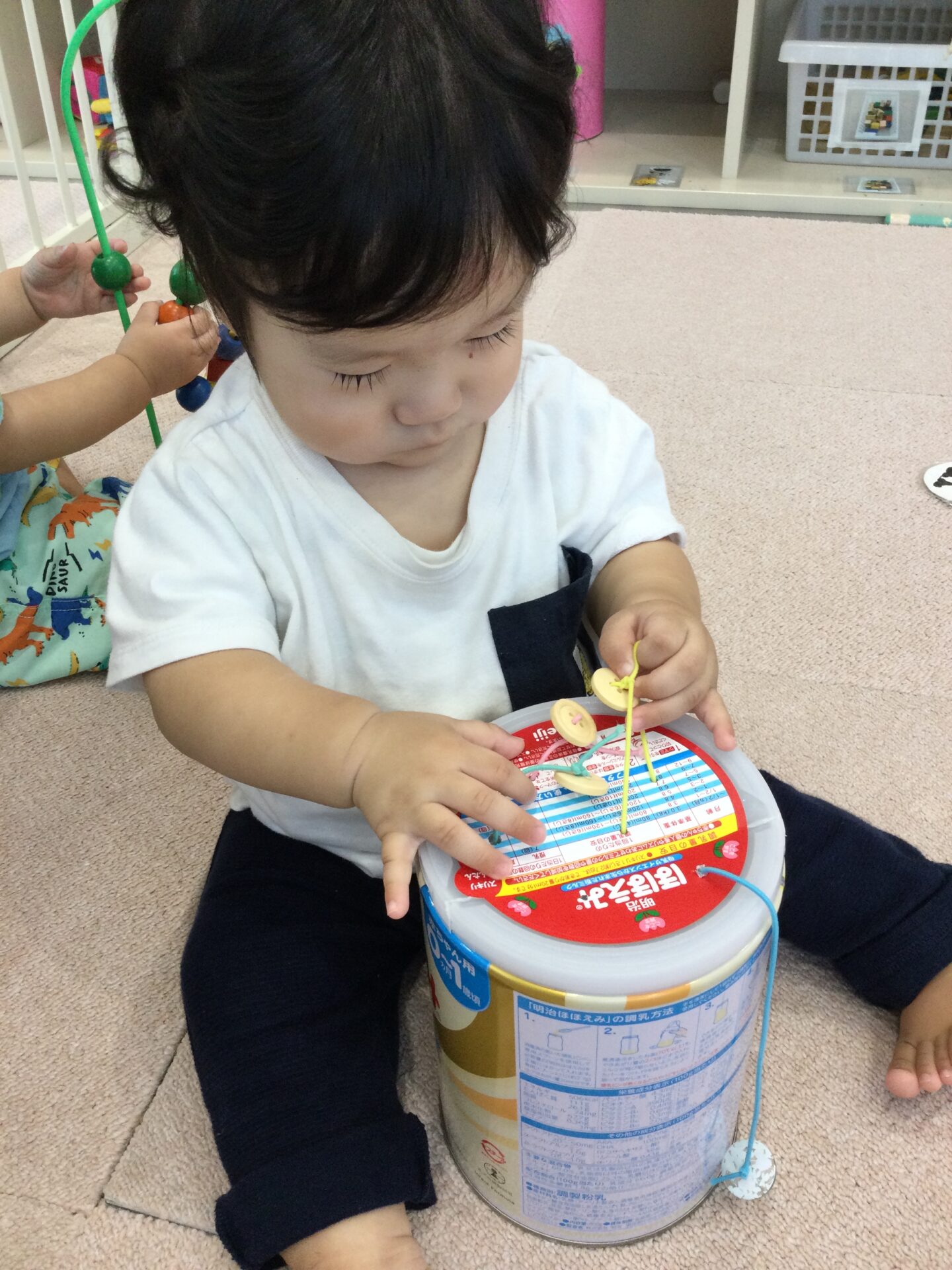 ボタンを引っ張る玩具では指でつまんで引っ張ります。指先を使うので集中しています✨