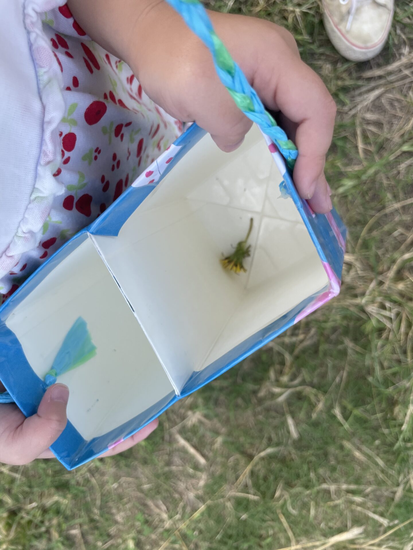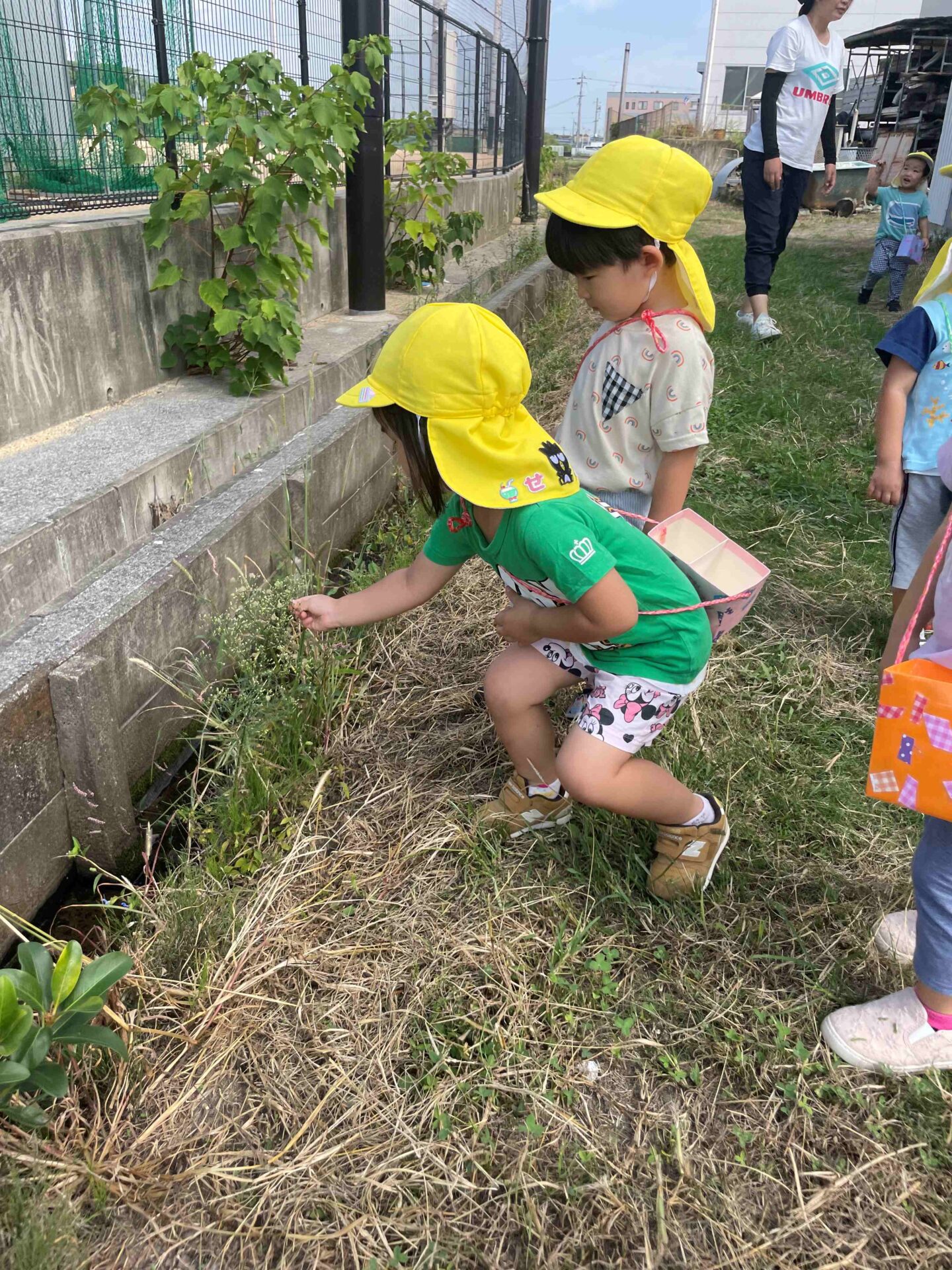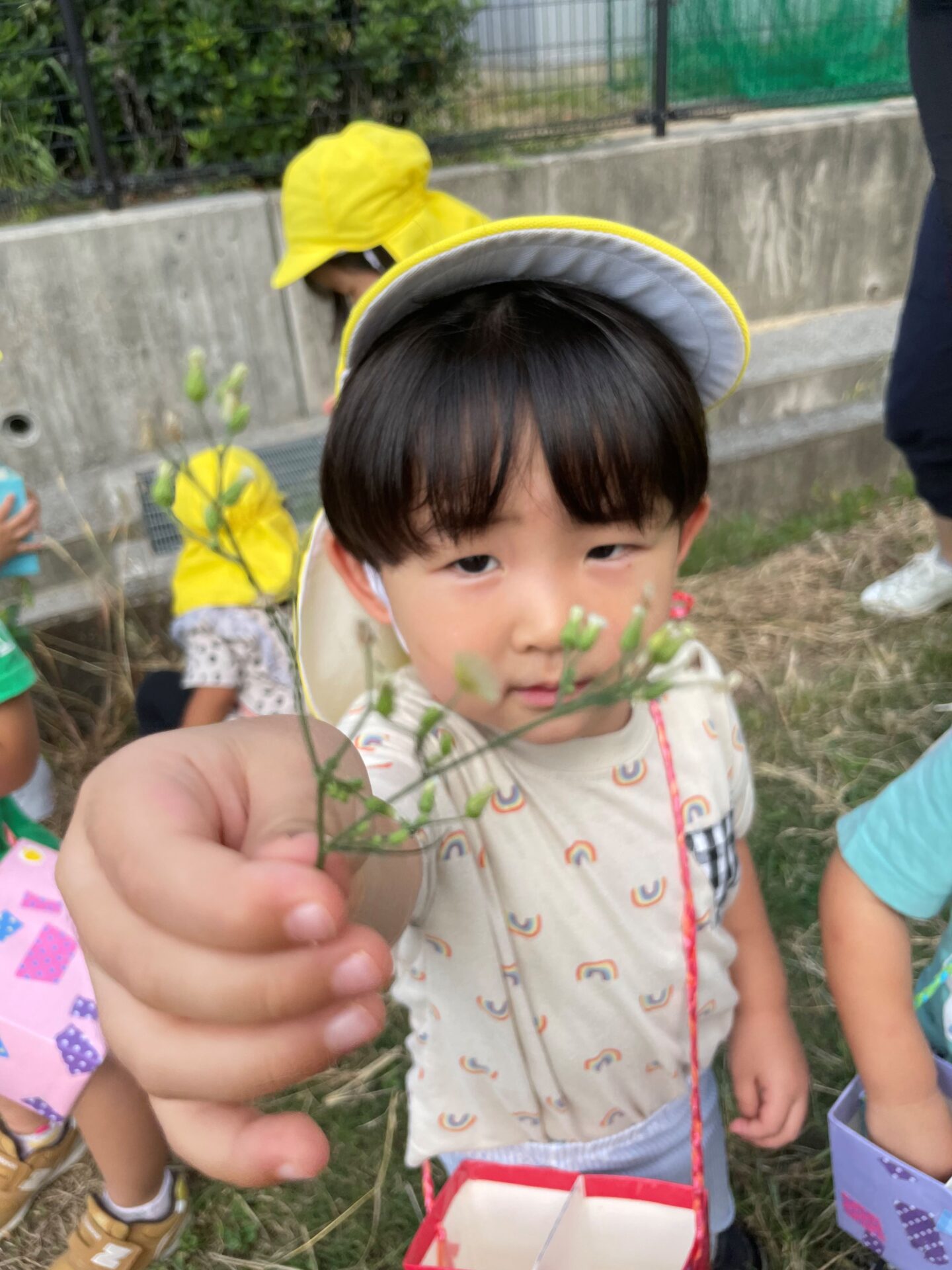 摘んだお花を大事にお散歩バックに入れて