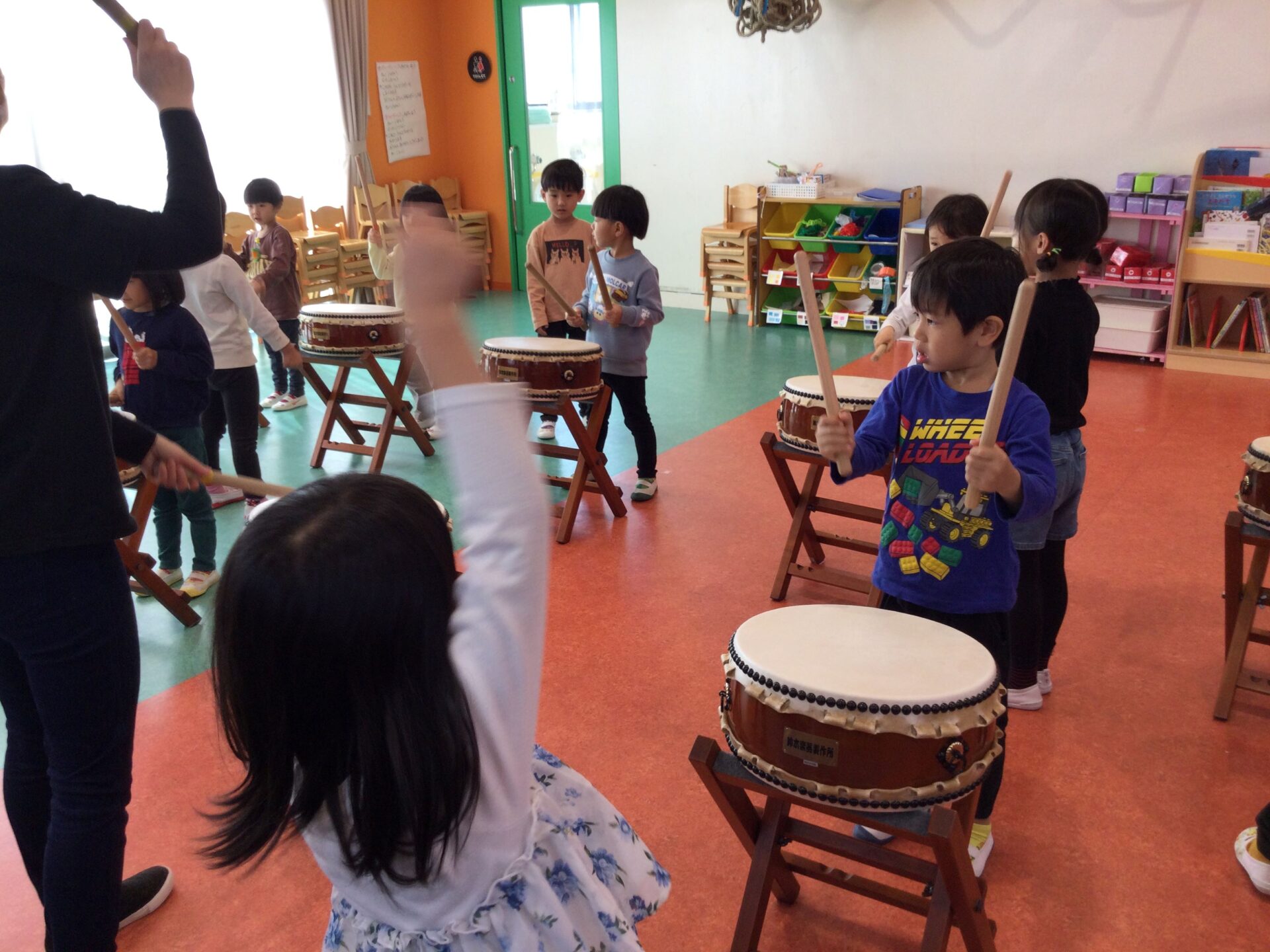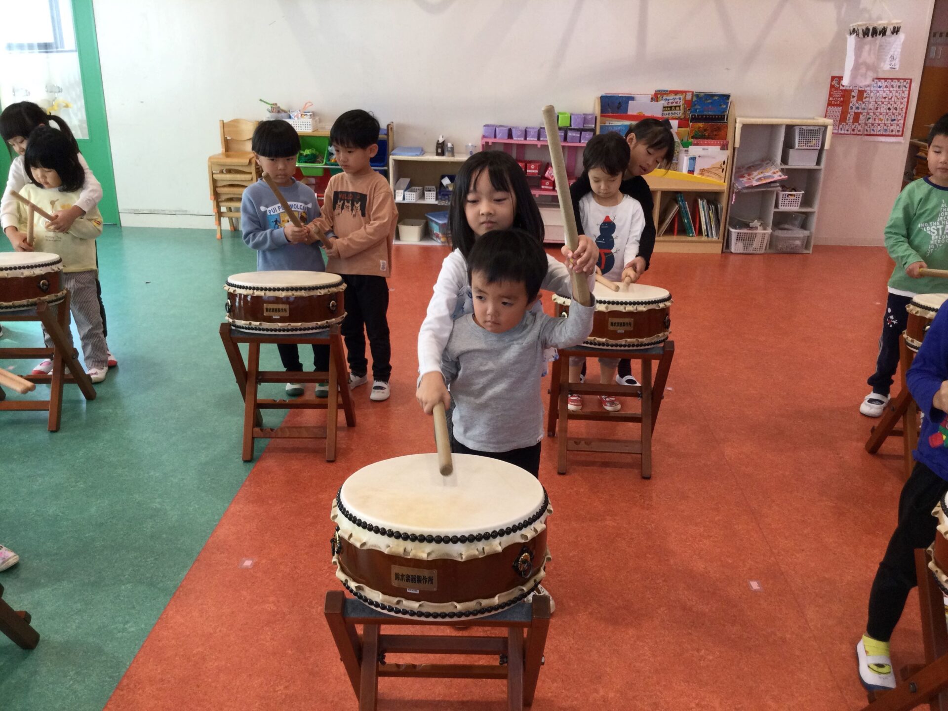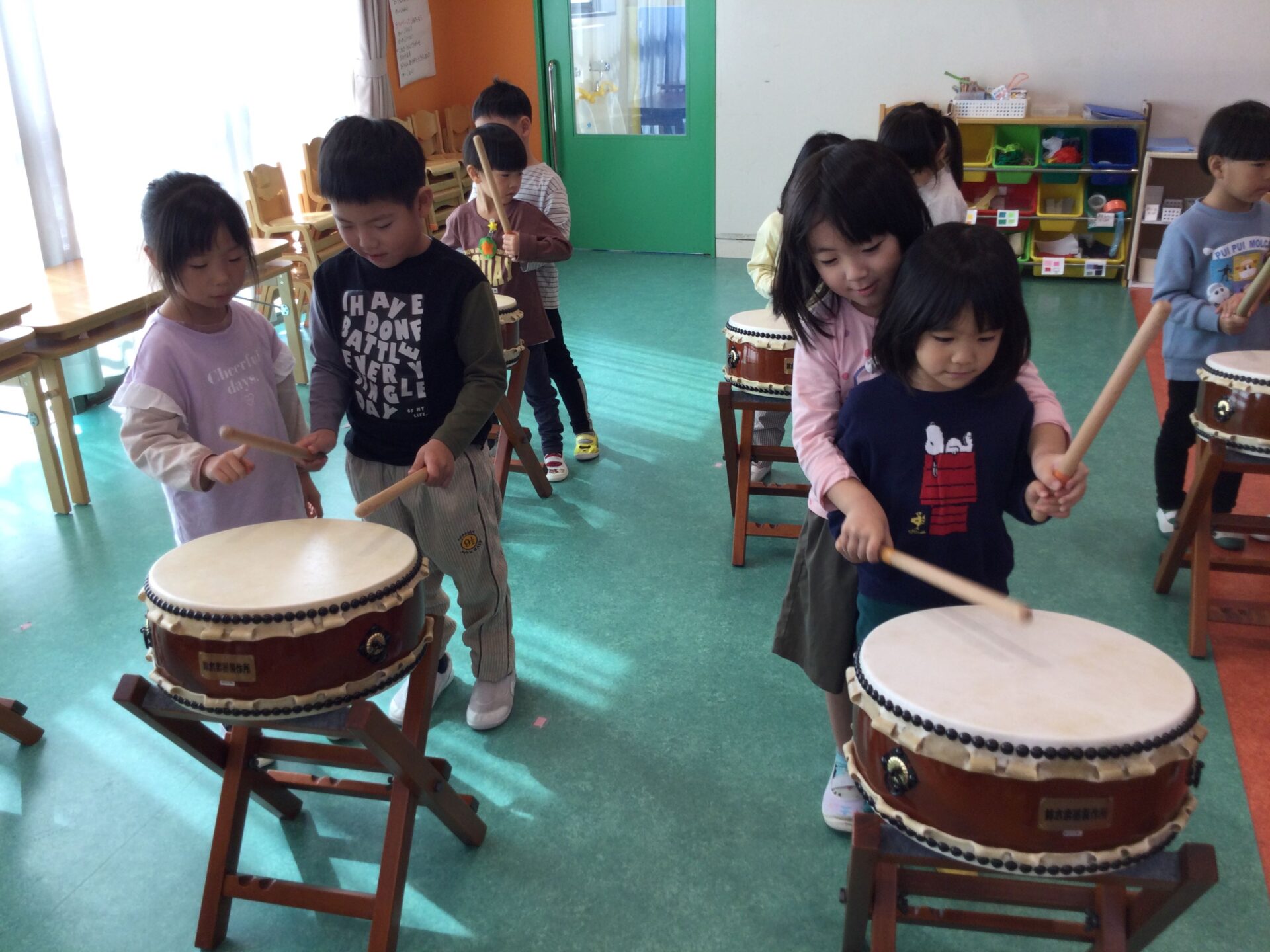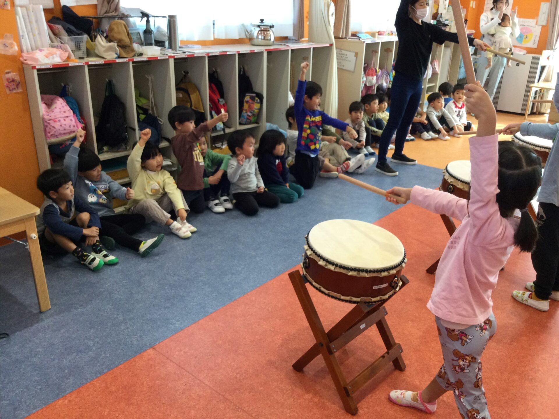 次は、和太鼓です。初めに5歳児がお手本を見せてくれました✨ 5歳児のお手本を見ながら、自然と手足が動いていました😆