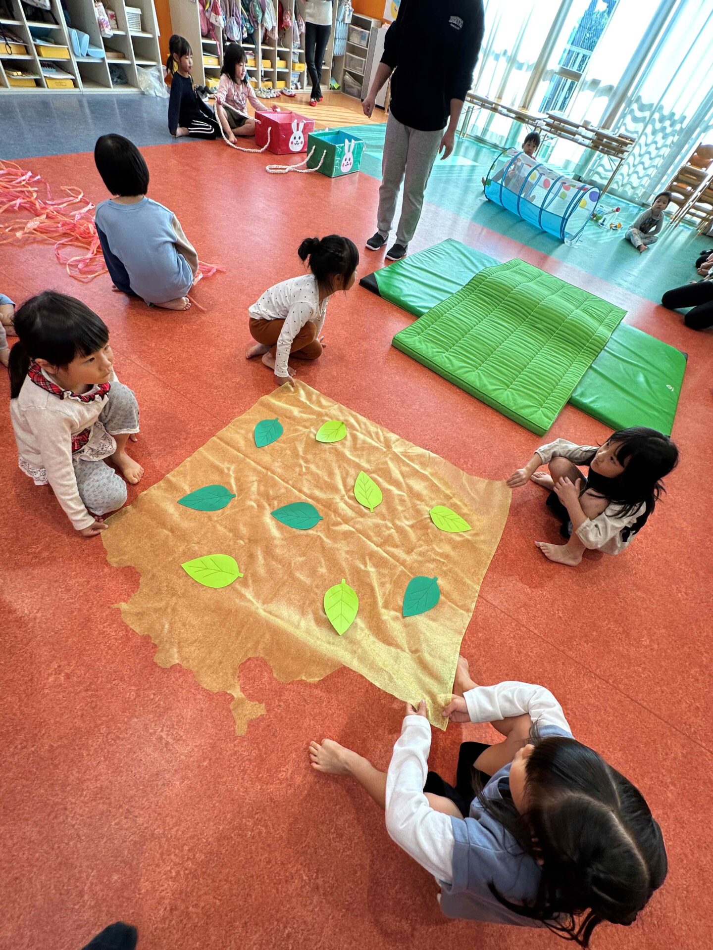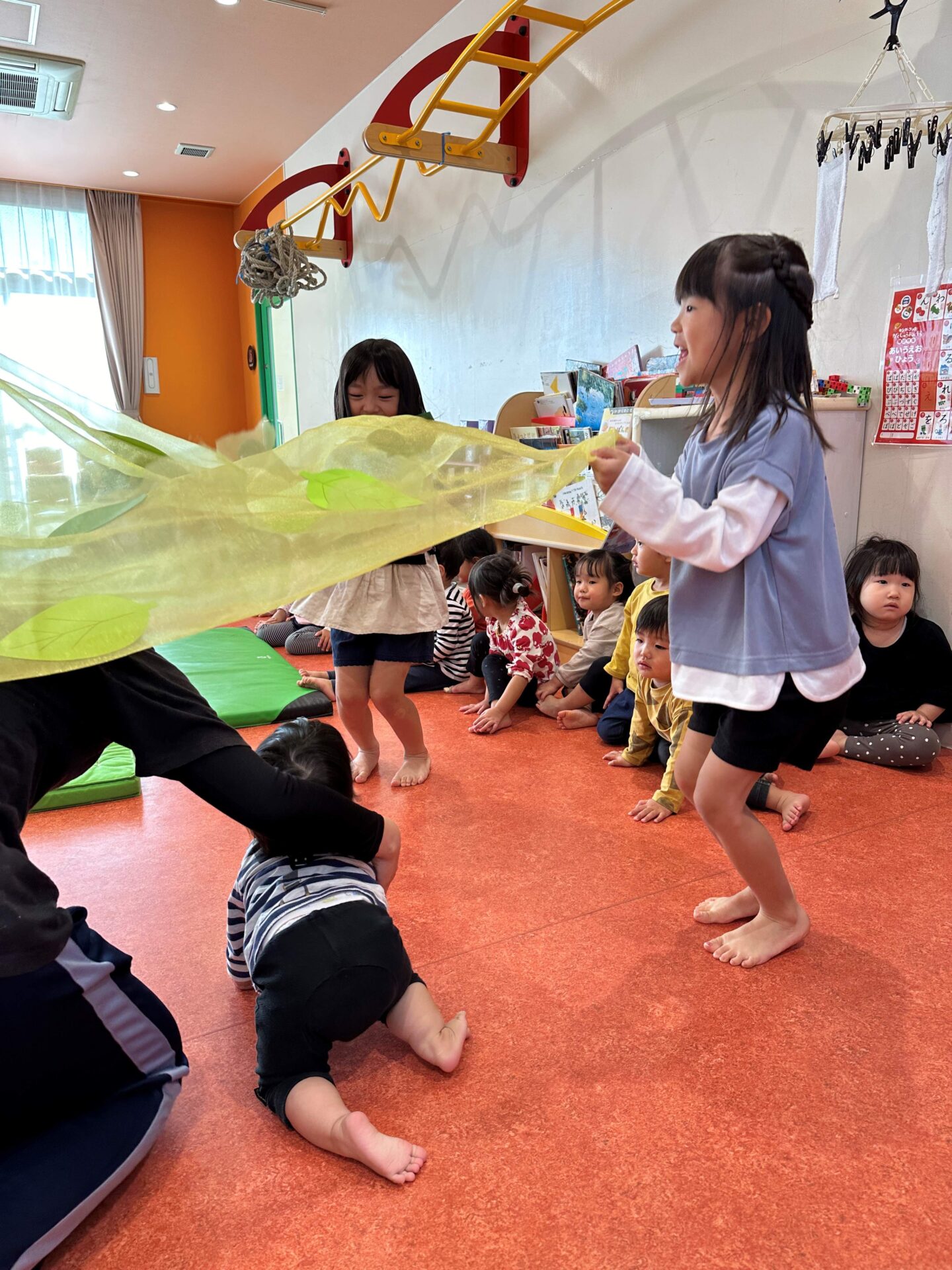 ふんわり布をかけてあげると、とっても喜んでくれた0歳児さん!「かわい〜」っと赤ちゃんの笑顔にメロメロです!