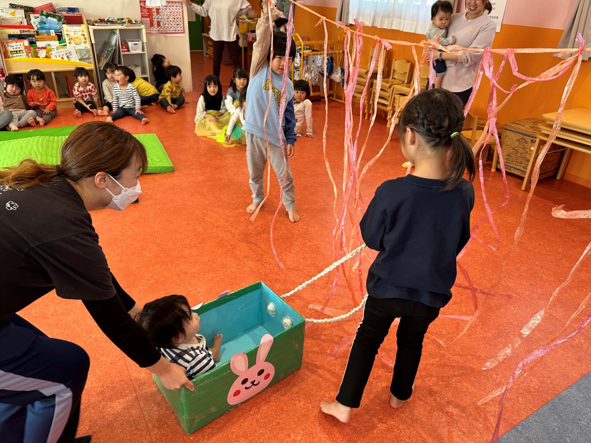 「こっちだよ〜」っと呼んでも、来てくれなかったり、反対に進んでいったり、自分達とは違い、さぁスタート!っといってもなかなか進まない赤ちゃん達に困ってしまいながらも、何度も「こっちだよ~」を呼んでくれました!