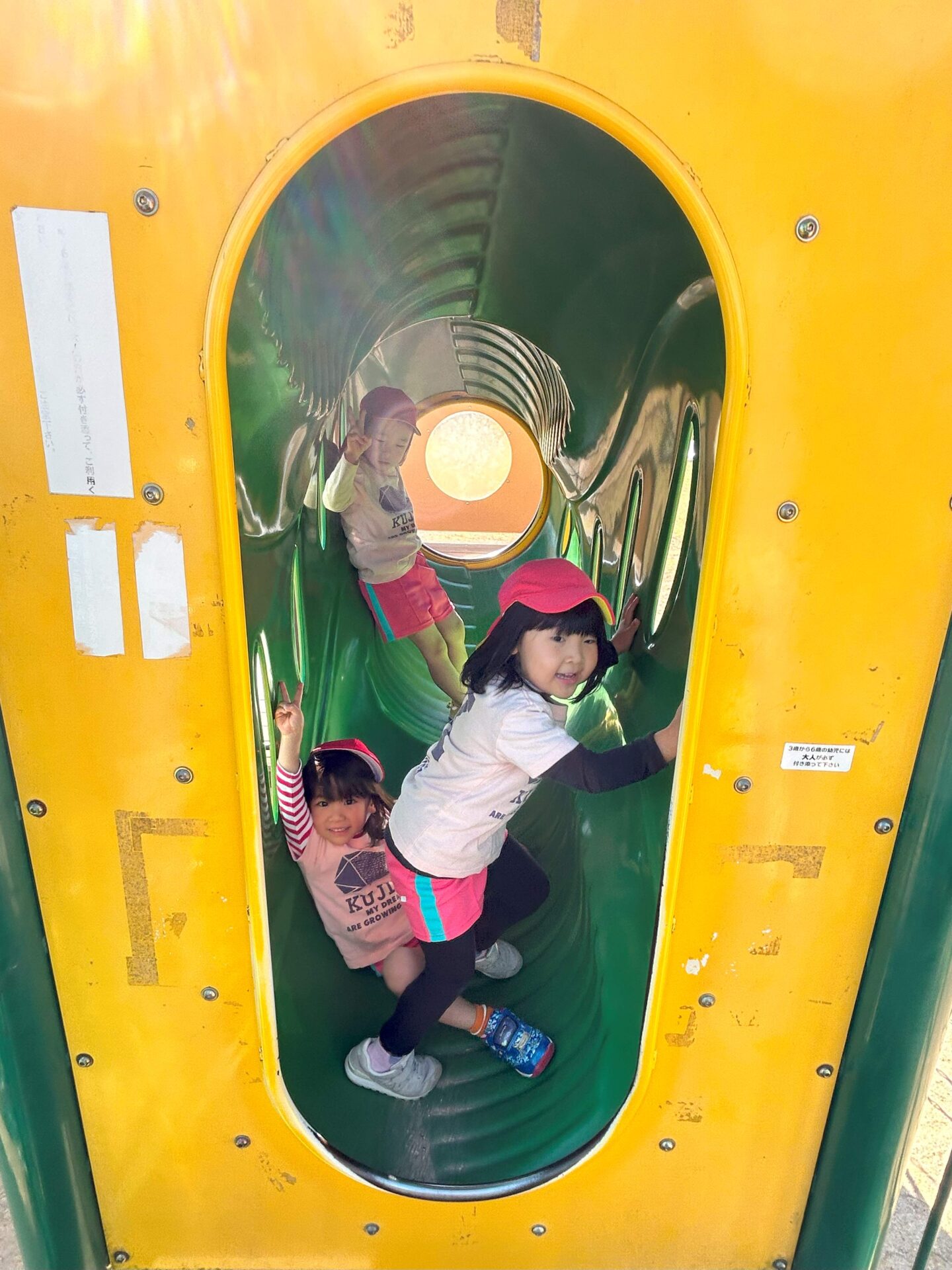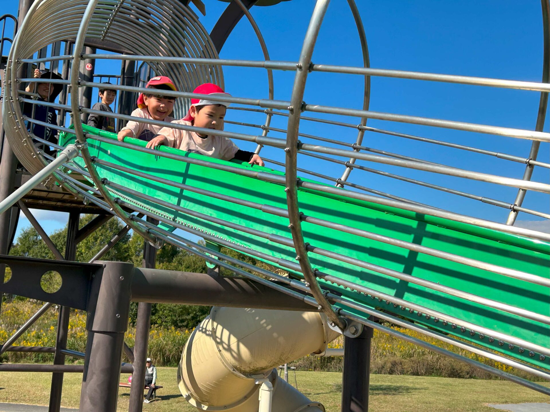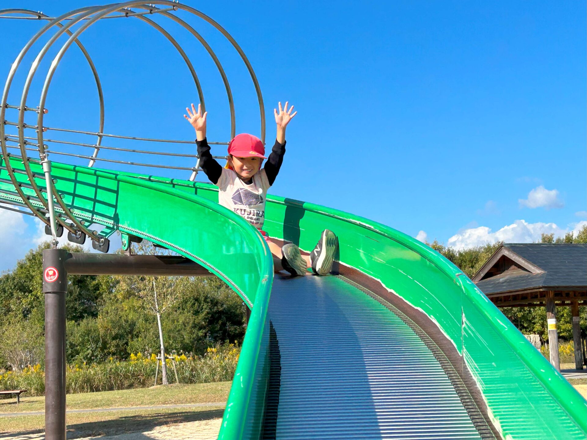 長いローラー滑り台は、子どもたちに大人気✨ 安全のため、両手をあげて滑ります。