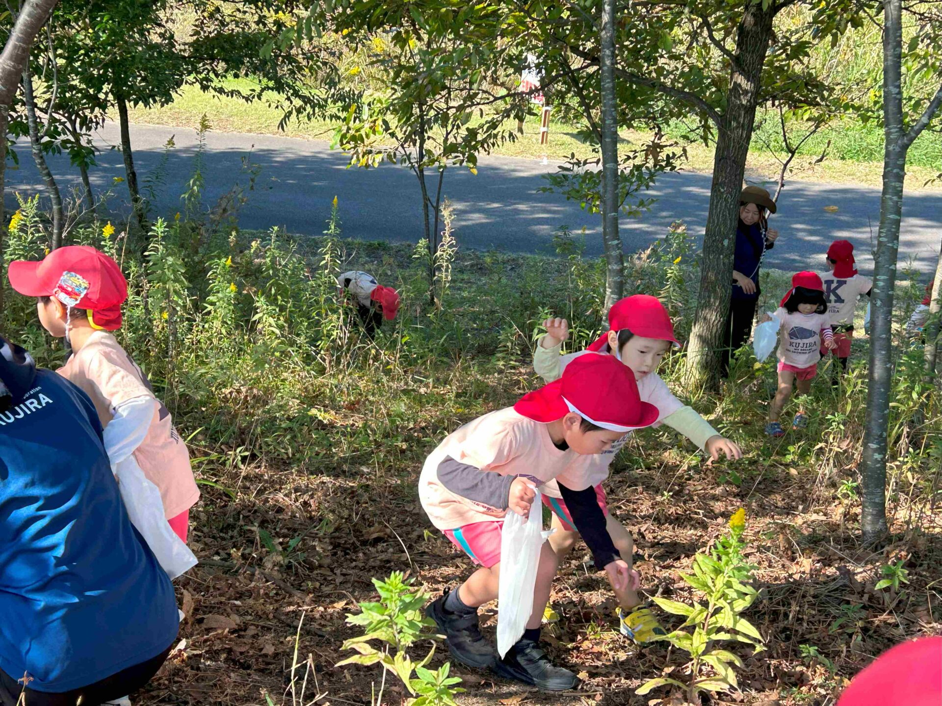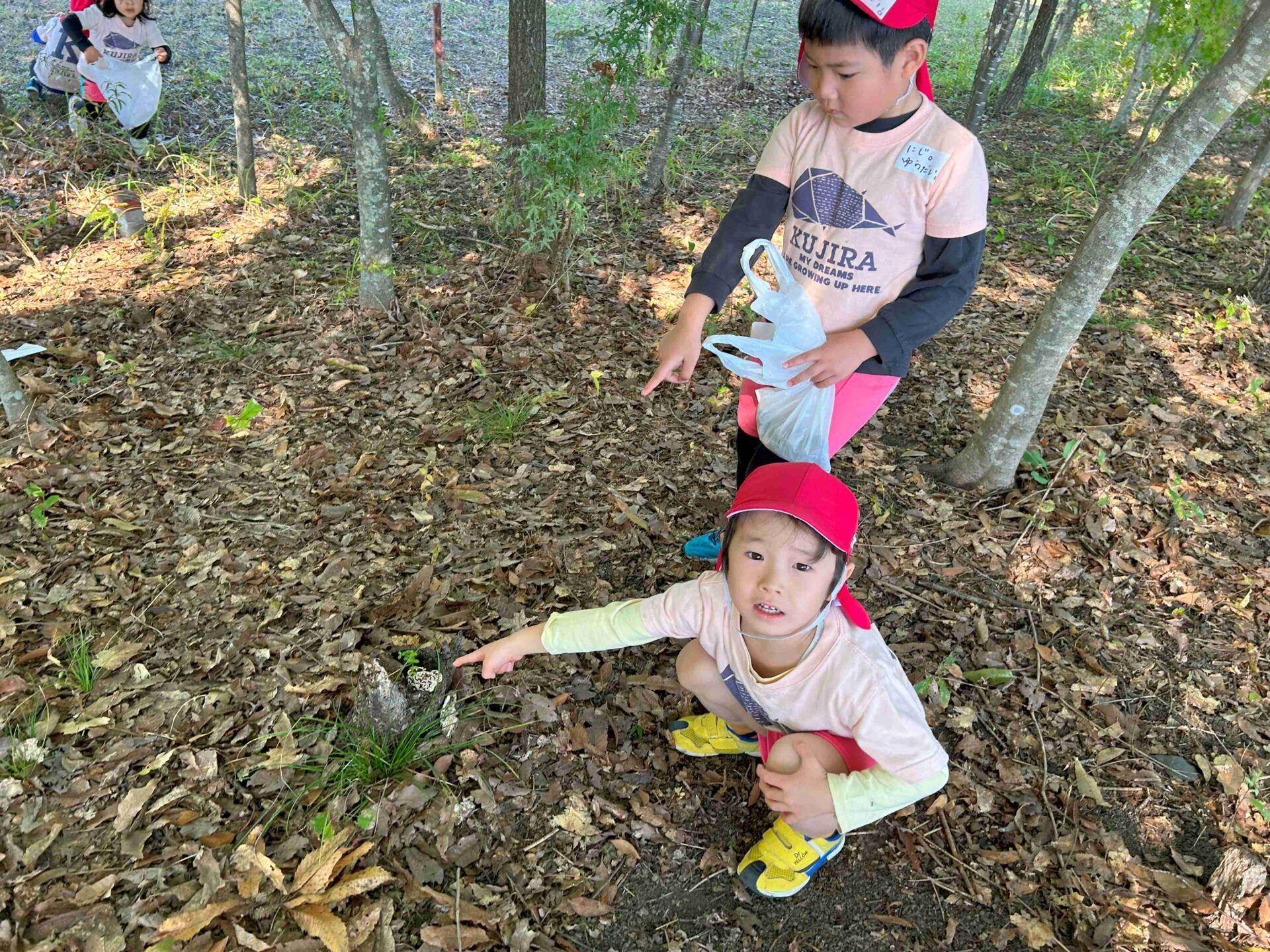近くに森があったので、どんぐりを探しをすることに。たくさんのどんぐりが落ちていてみんな夢中で拾っていました。