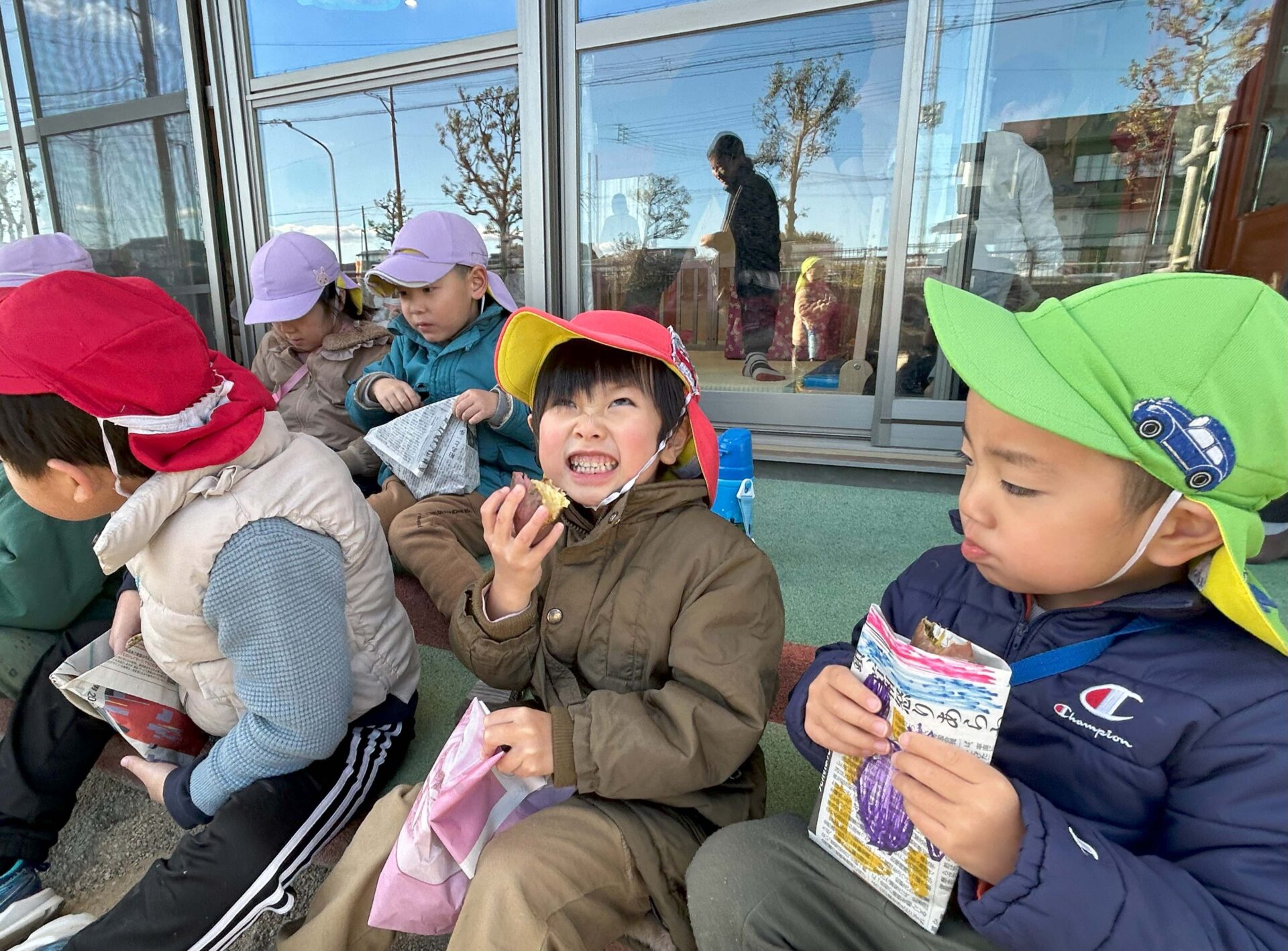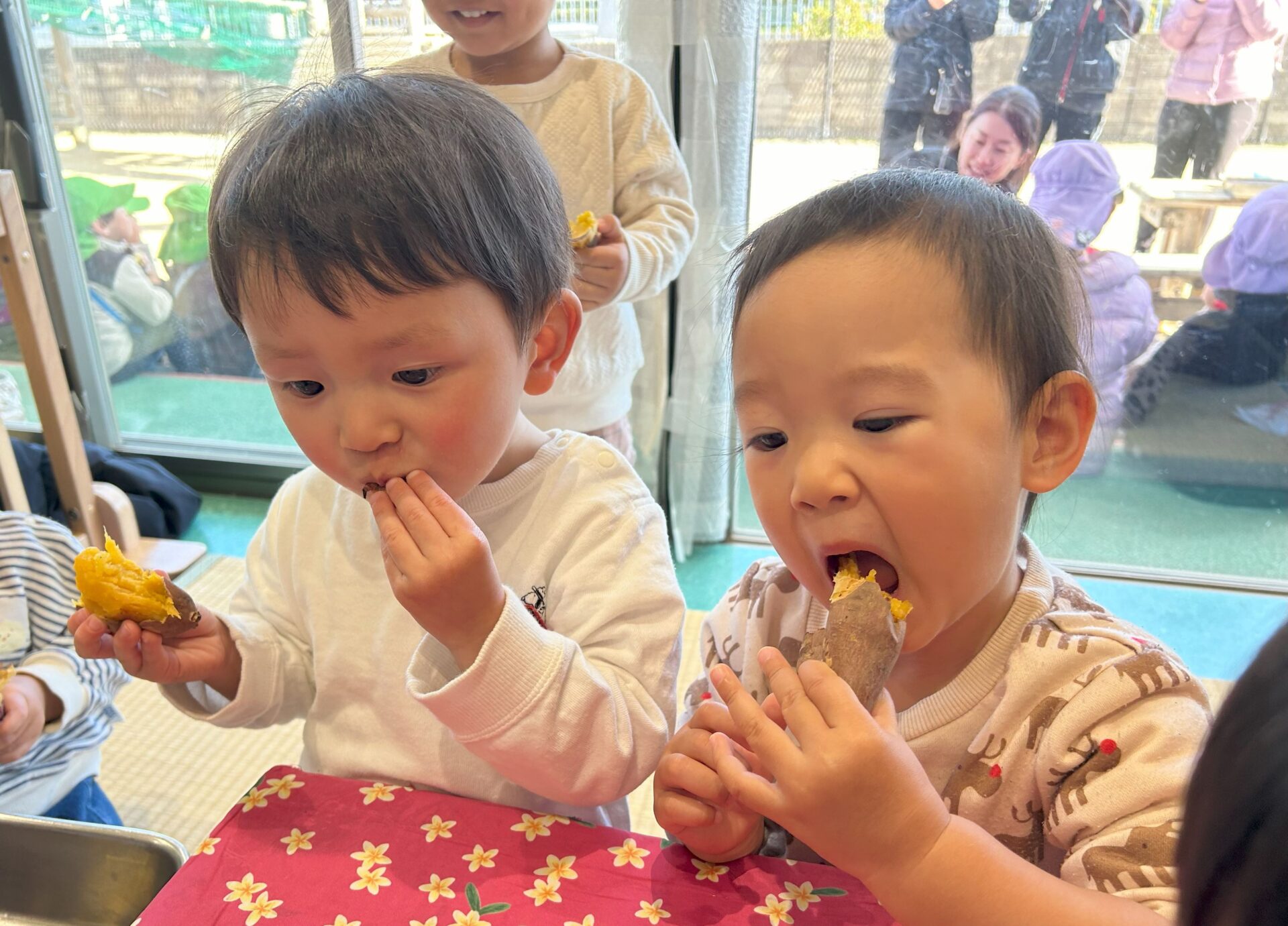 手作りのチケットやお金を持って焼き芋を買ってから、テラスで食べました🍠