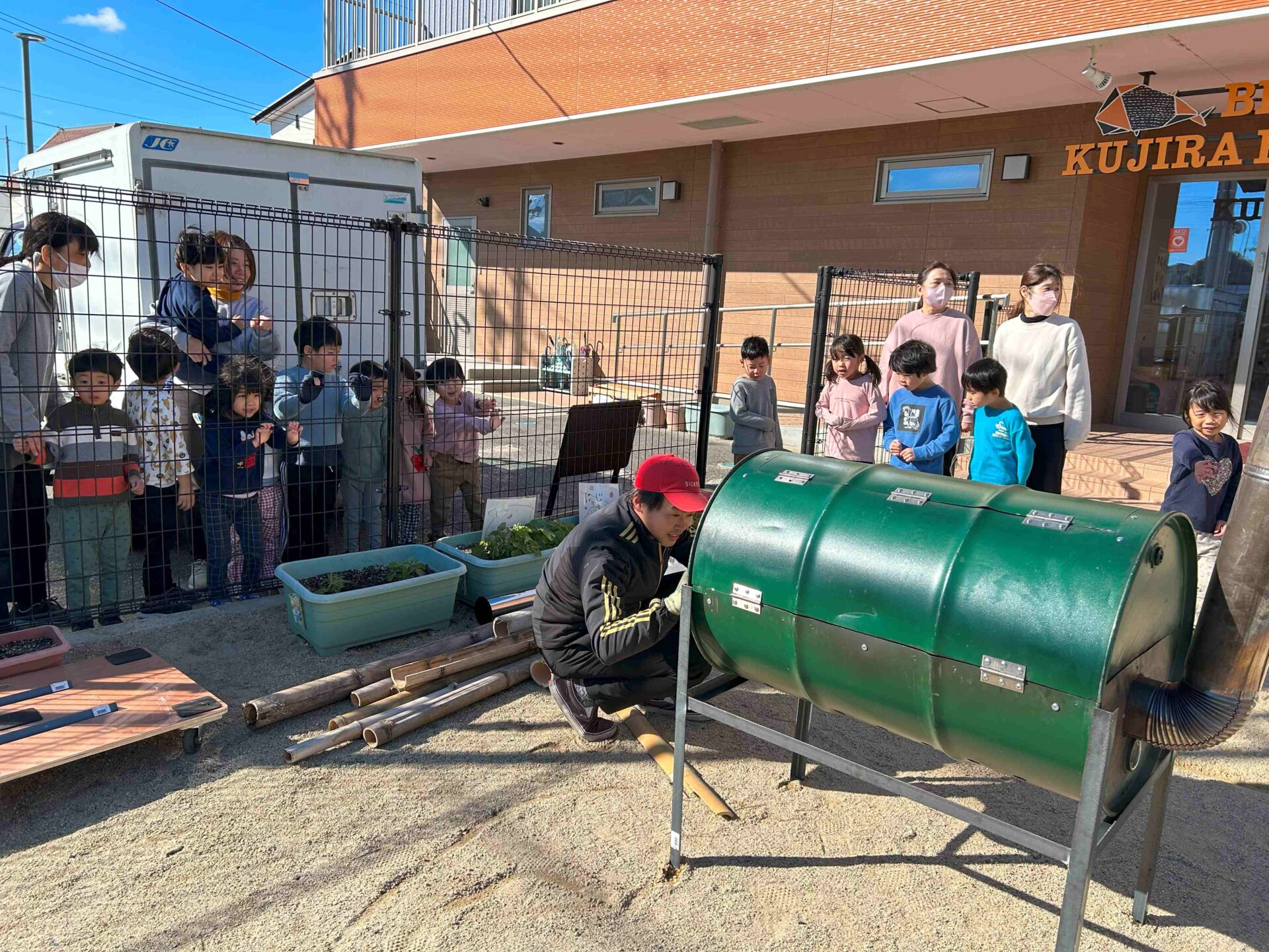 持って来て頂いたお手製の焼き芋マシーンを組み立てるために、栗東くじら保育園の園長先生にお手伝いしていただきました!