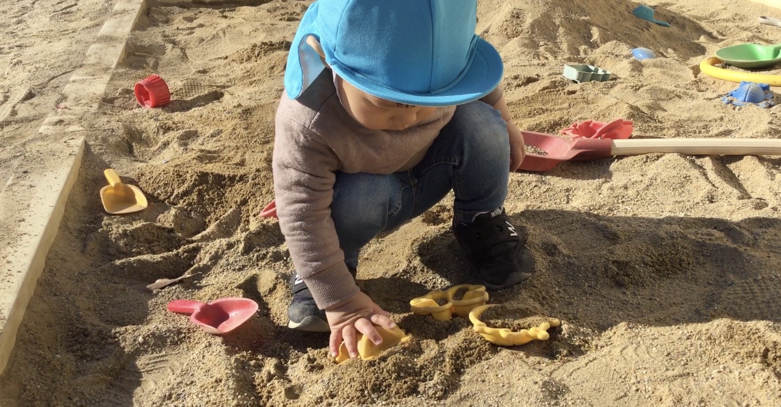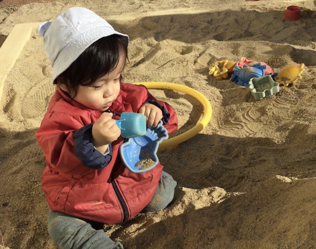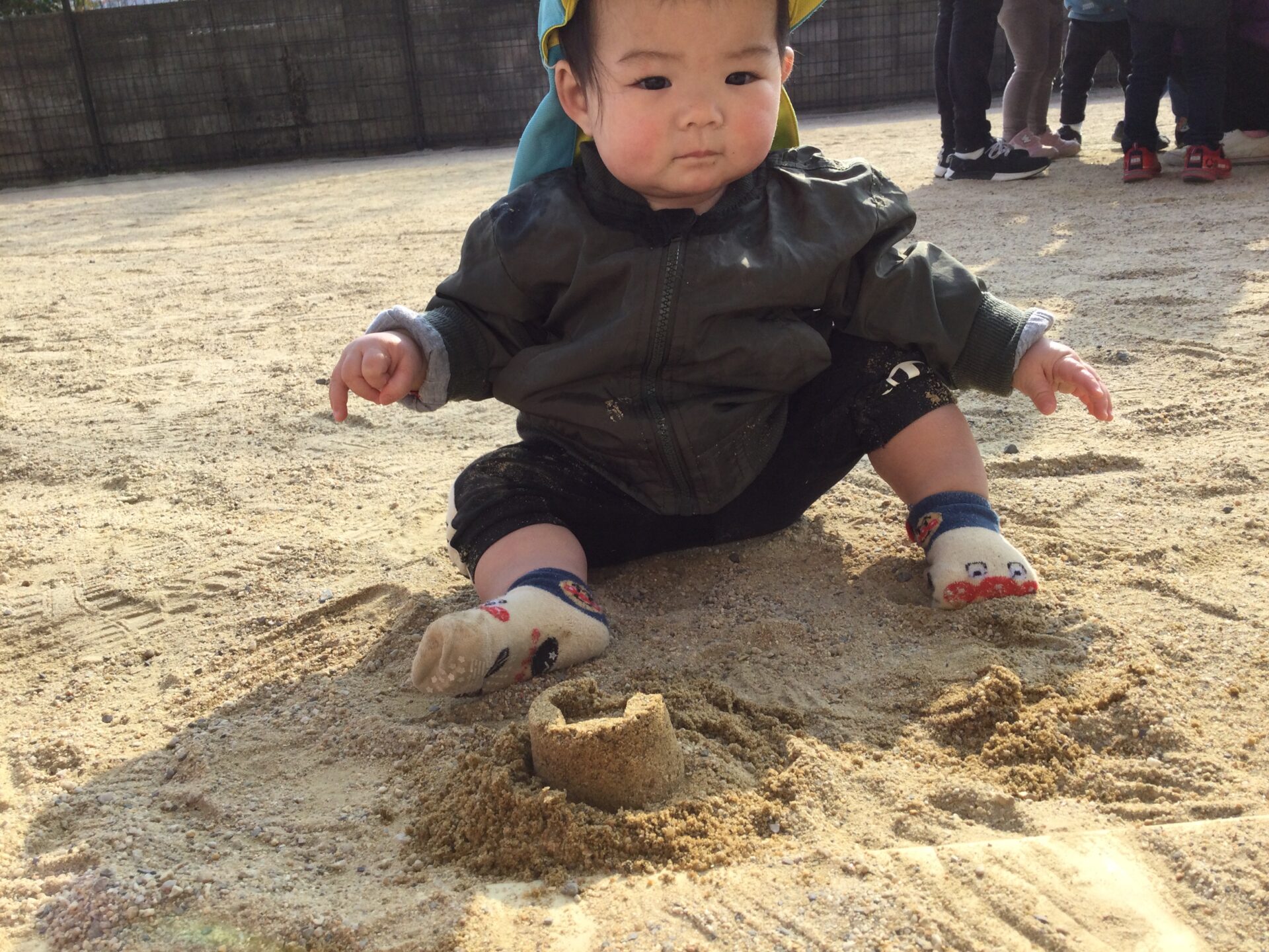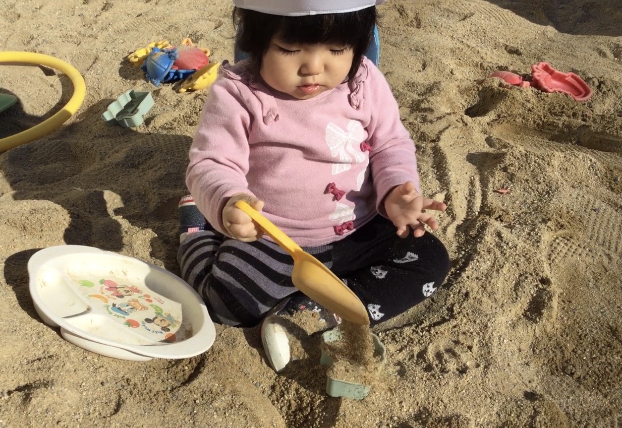 砂場ではスコップで砂をすくって容器をいっぱいにしてみたり、型抜きをしようとひっくり返してみたりして遊んでいます。また、砂のお山があるとハイハイで登ろうとしたり、砂を握り、手を開いて手からこぼれていく感触を楽しむなど、砂にいっぱい触れて楽しんでいます。