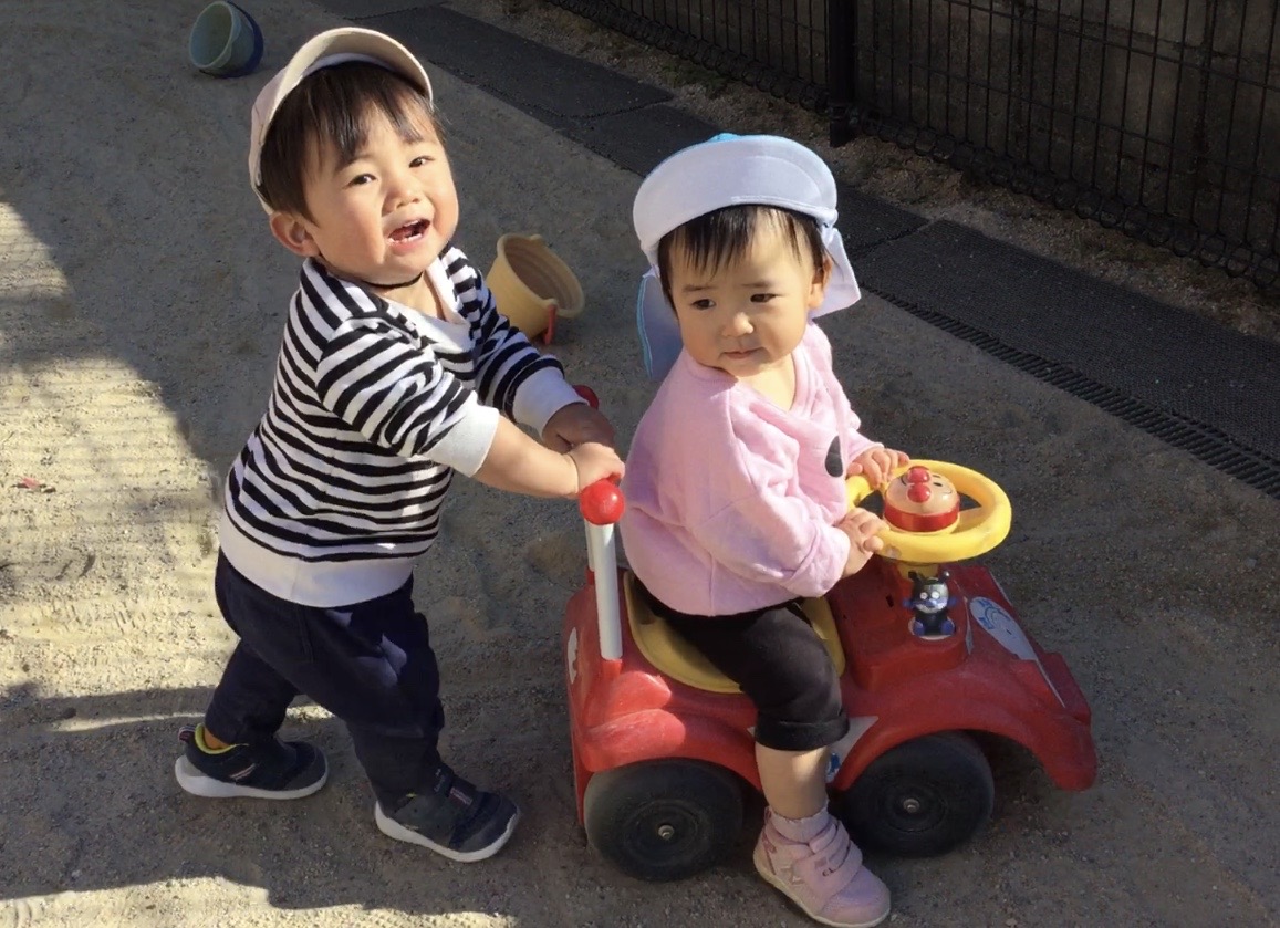 子どもたちはコンビカーに乗るのが好きです。自分で蹴って進んだり、押したりして楽しんでいます。お友だちが乗っているコンビカーを押すこともあり、関わりがとても可愛いです。