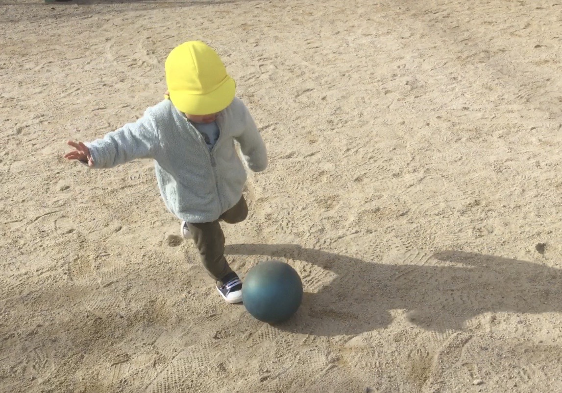 ボール遊びでは、保育者と一緒にボールを投げたり追いかけたりを繰り返し元気いっぱいに遊んでいます。サッカーをするように蹴る子もいて園庭をかけまわっています⚽