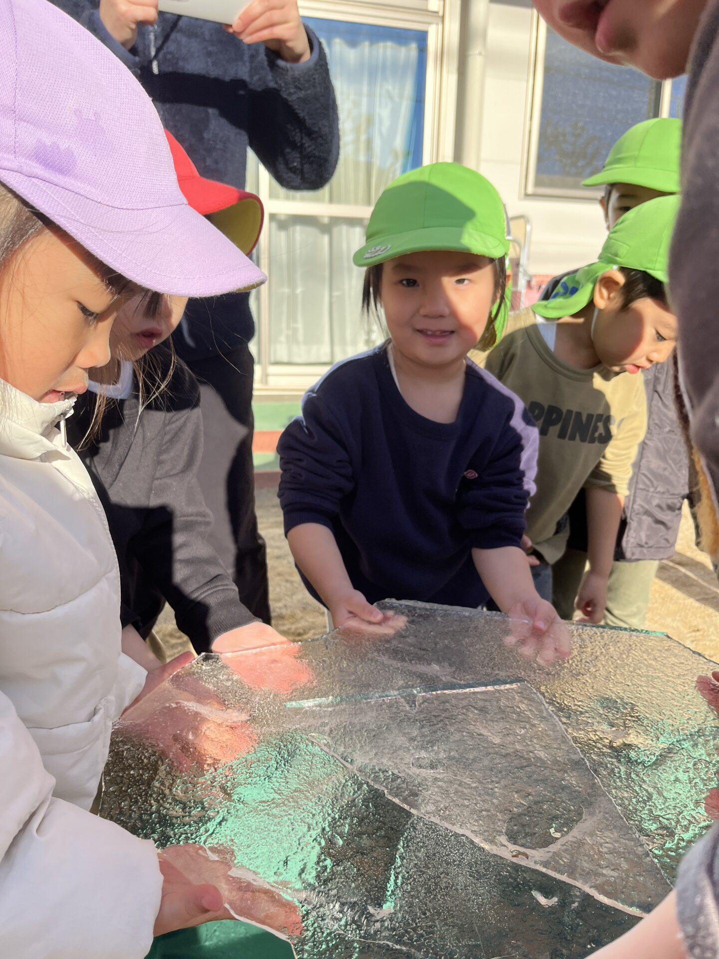 みんなで持ち上げてみます。思っていたより分厚くてしっかりした氷です。