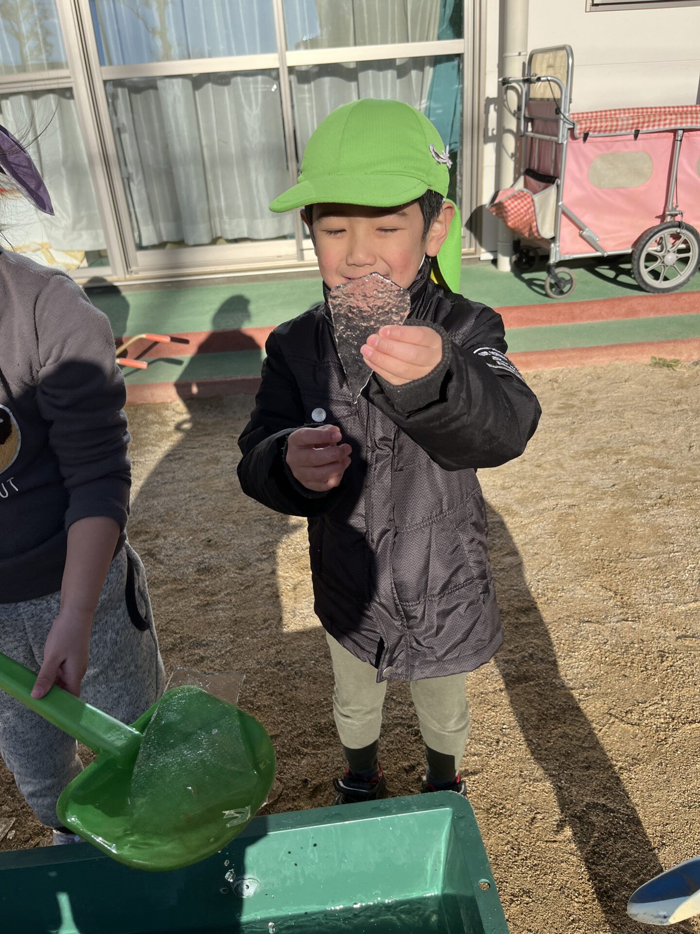 あまりに冷たいのでスコップですくってみたりザルですくってしっかり氷だけ手に入れる子も( *´艸`)