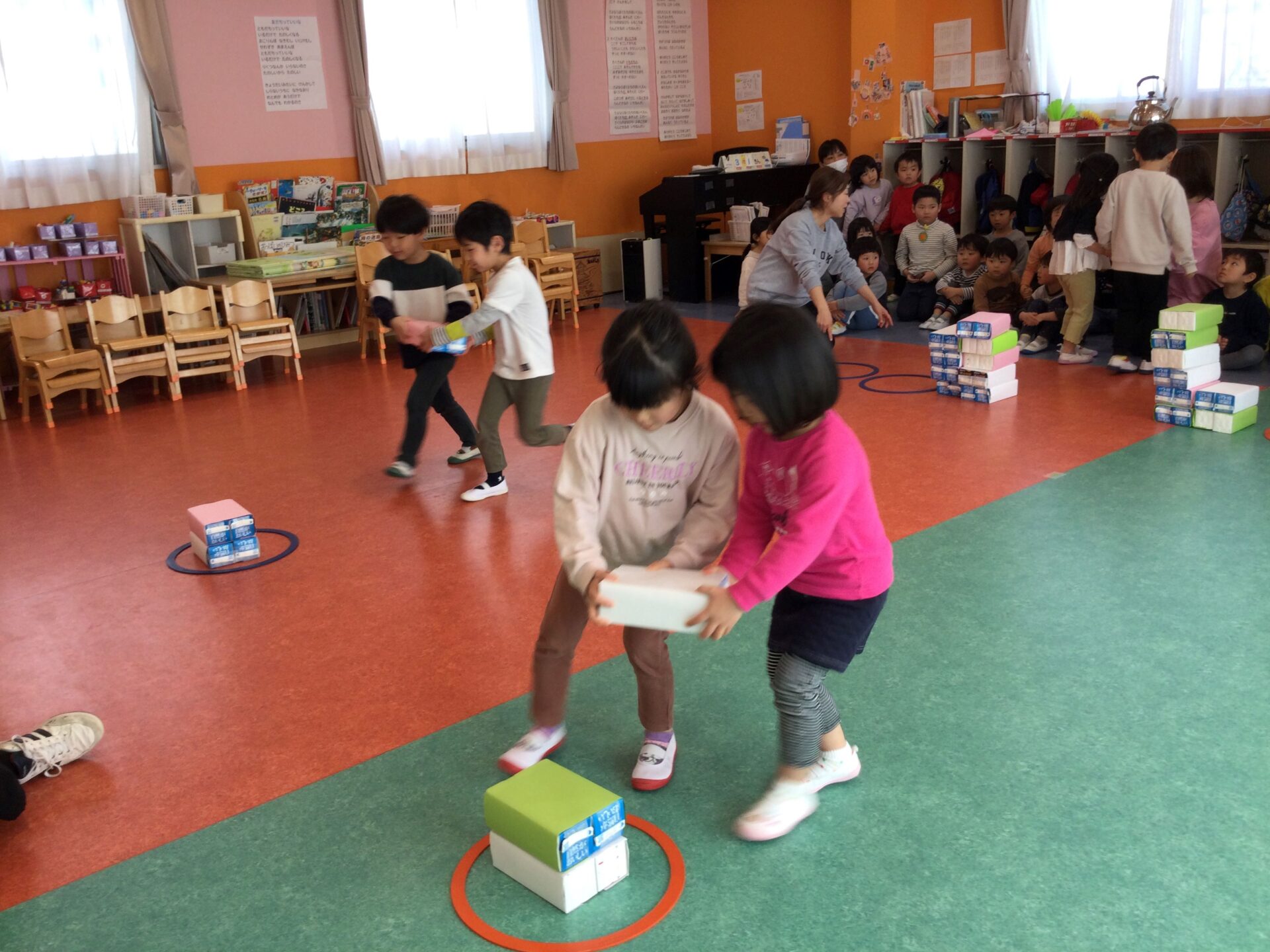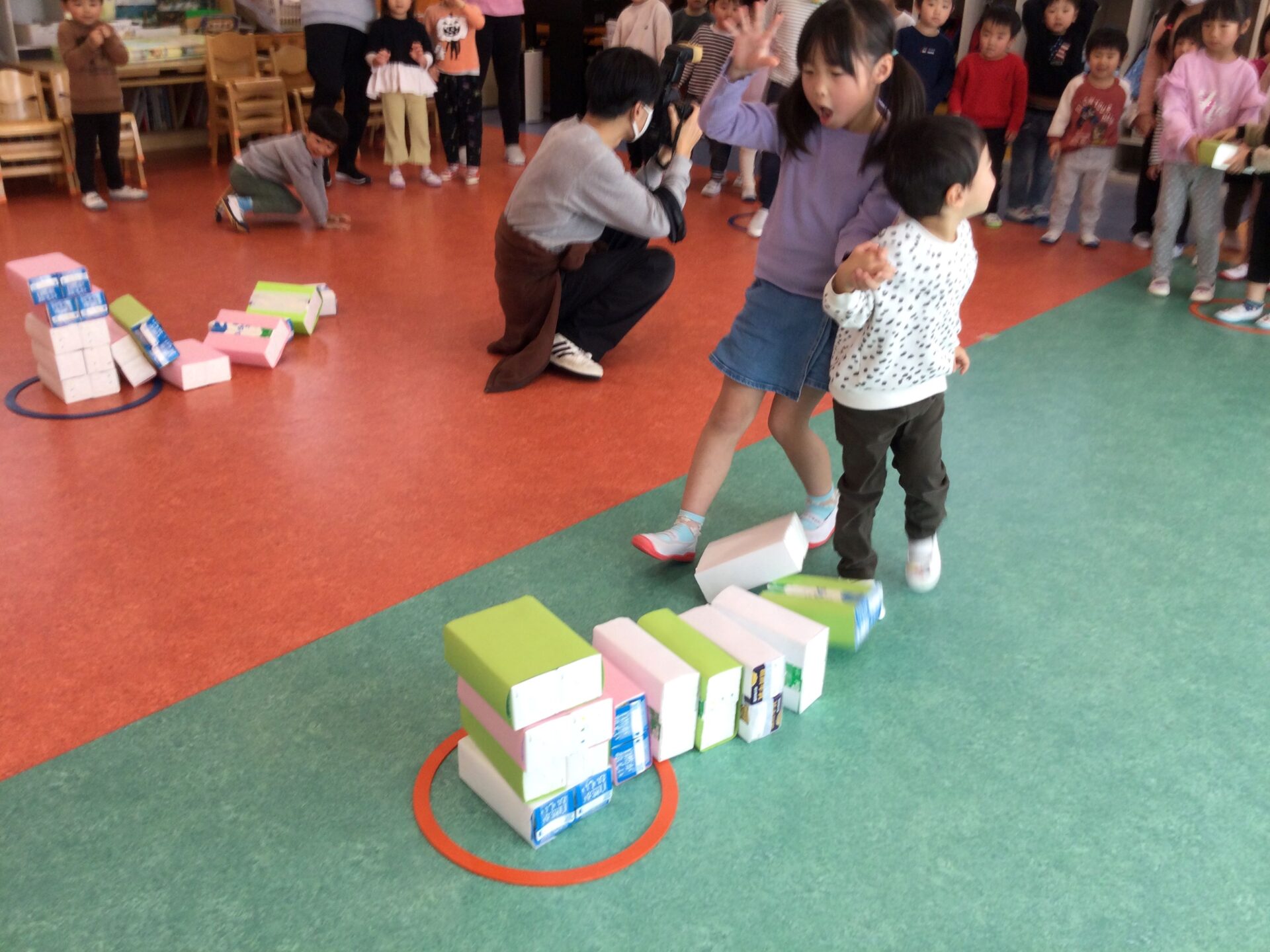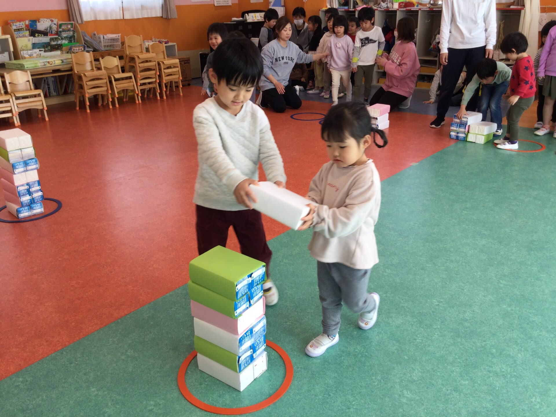 最後は、菱餅を積むゲームをしました。あめ・くじらチームとにじ・そらチームの2チームにわかれて挑戦します🙂