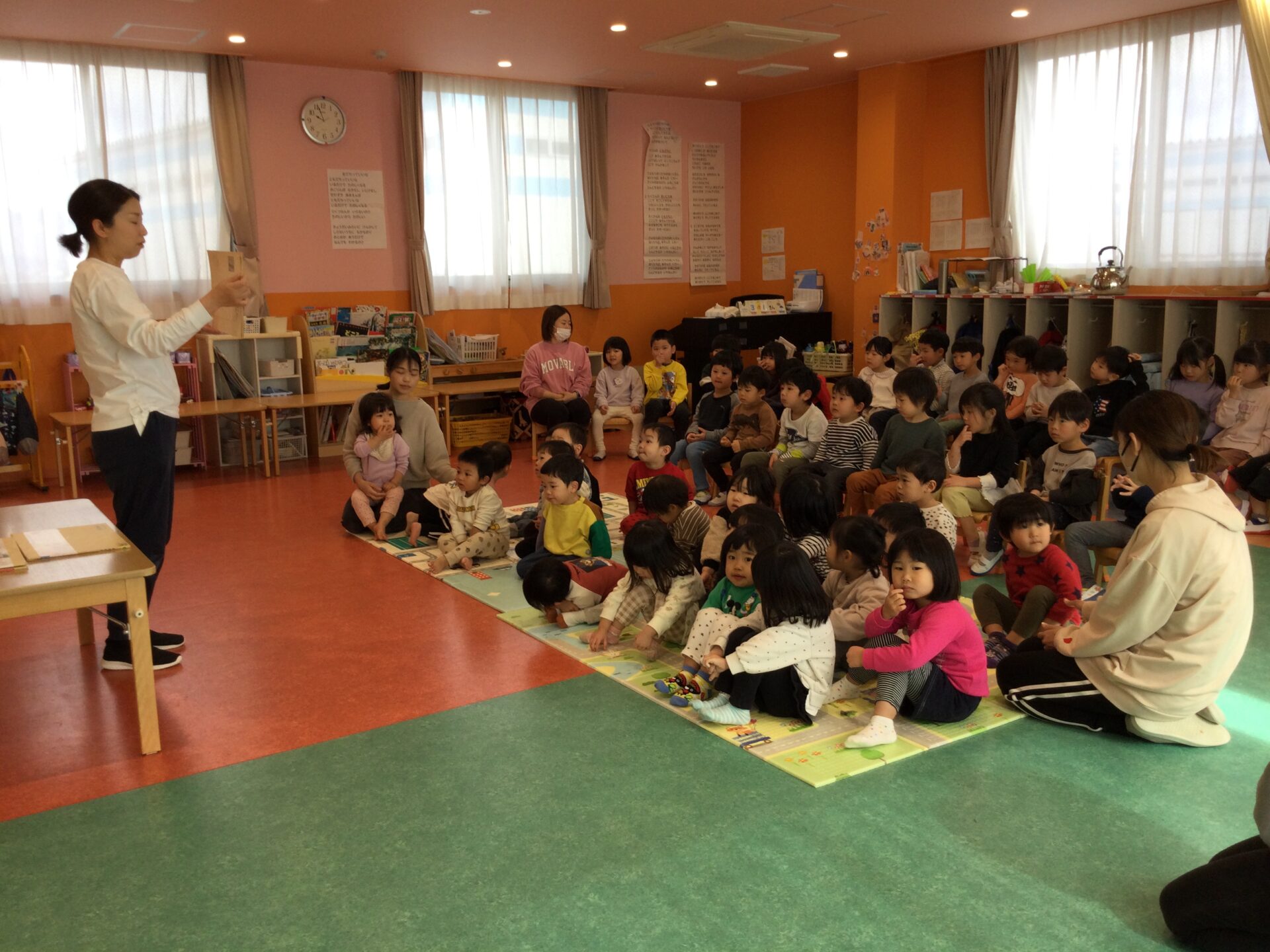 今日はひな祭りの集会があり、だいちチーム(1歳児)~くじらチーム(5歳児)までが集会に参加しました。