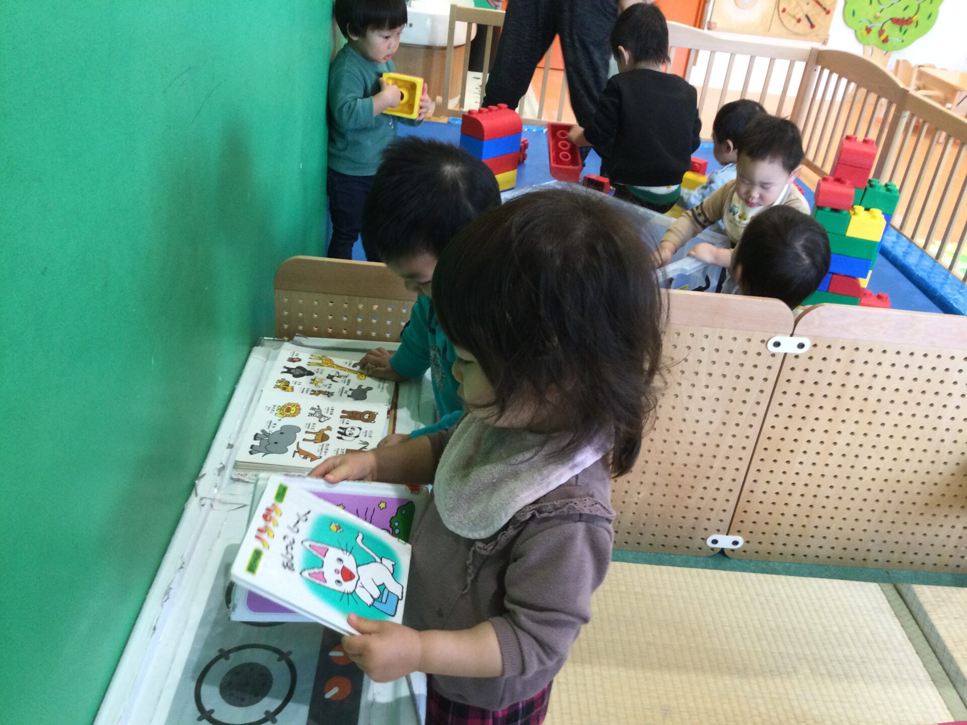 お友だちが絵本を見ていると、同じように絵本を持って来て、となりで絵本タイム😌