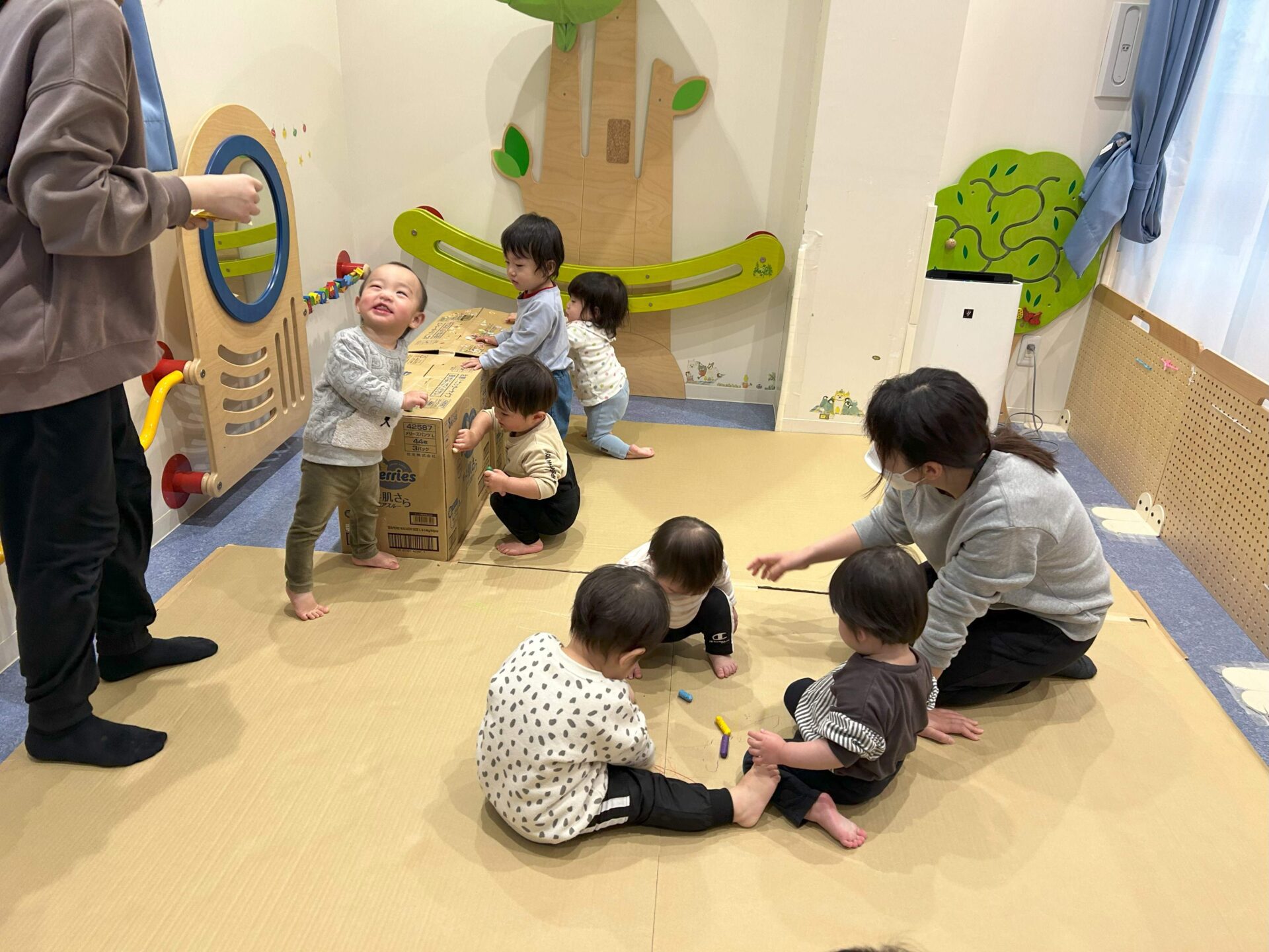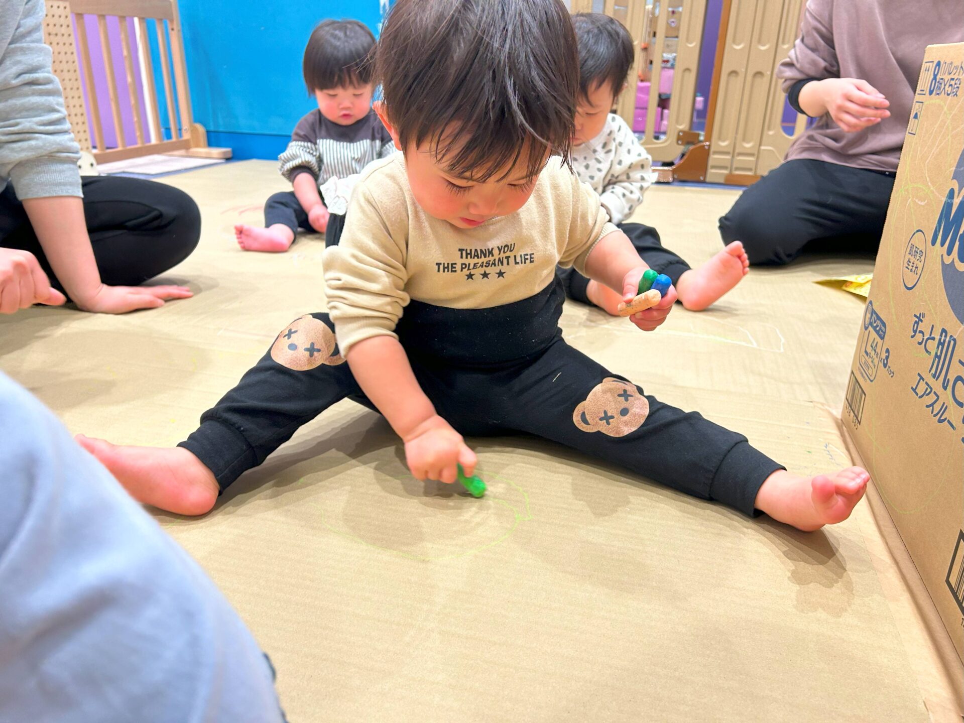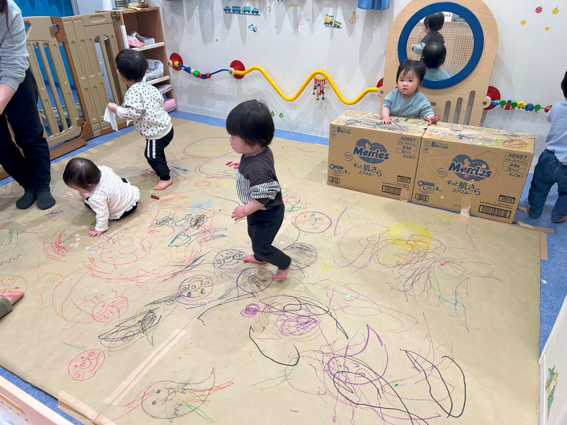 床一面に段ボール紙を貼ってみんなでお絵描き✐