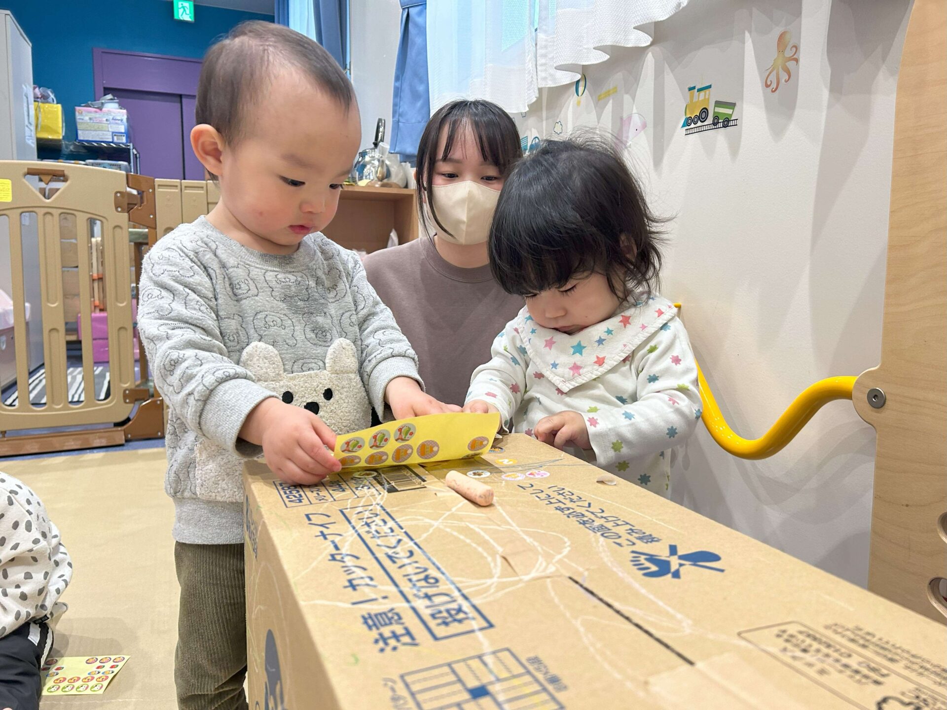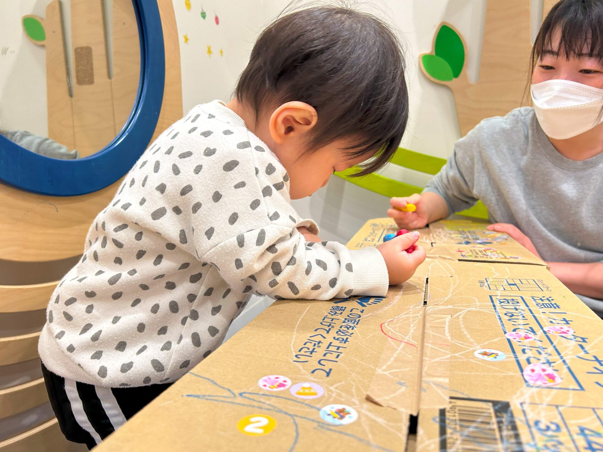 段ボール紙のフカフカする感触を楽しんでから、シールとクレヨンを出すと・・・