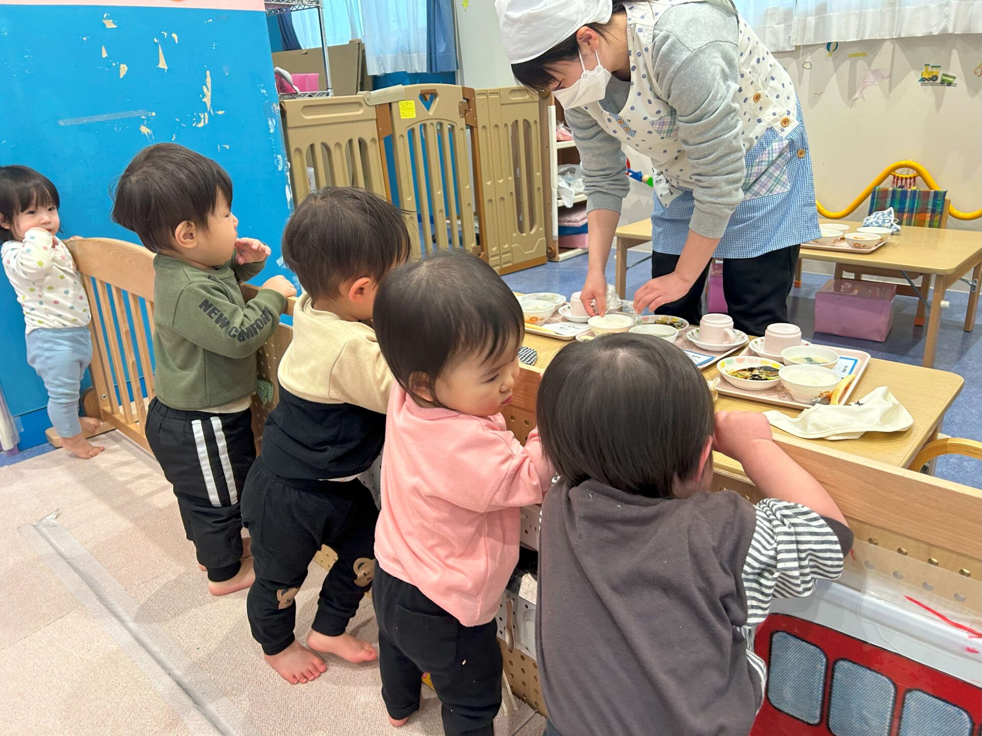 給食が待ちきれなくて、準備の様子をじ~っとながめている子ども達。