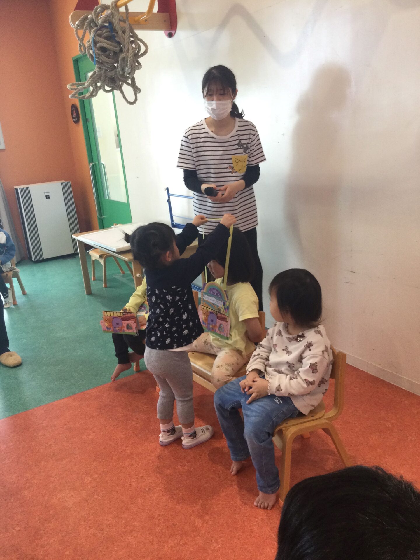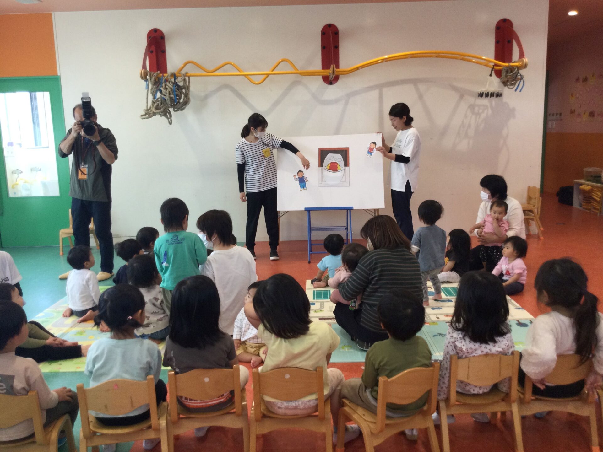 保育者からの出し物は、「まほうのでんしレンジ」のパネルシアターです。