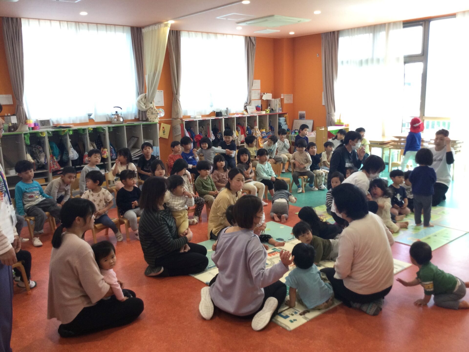 昨年までは、コロナウィルスの影響で0歳~2歳、3歳~5歳と別れて誕生日会をしていましたが、今年度は全園児が集まって、みんなでお祝いすることになりました😊