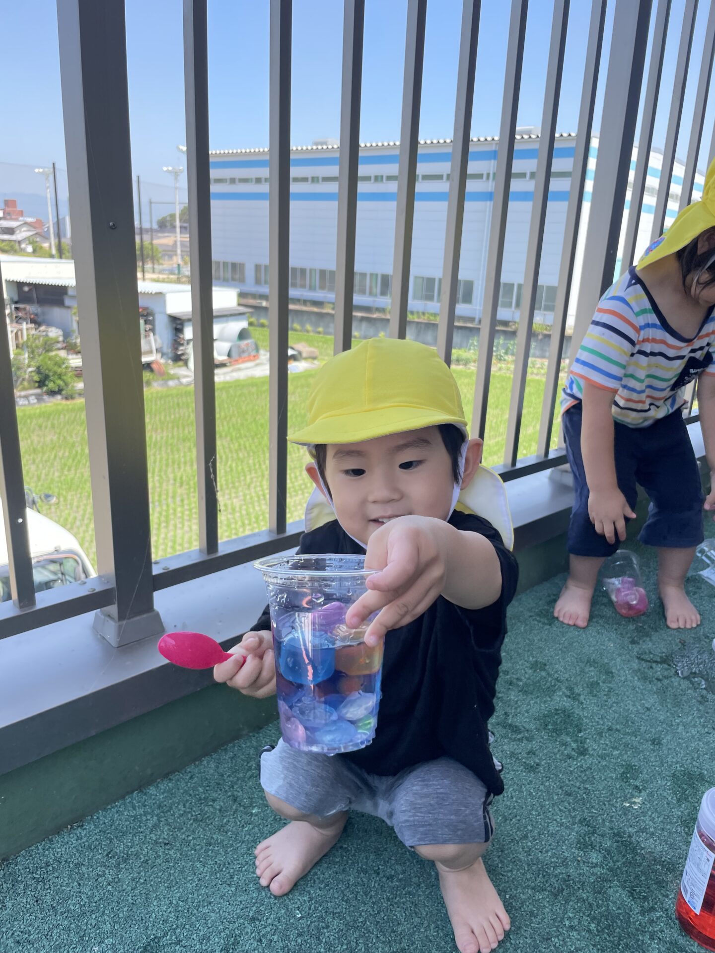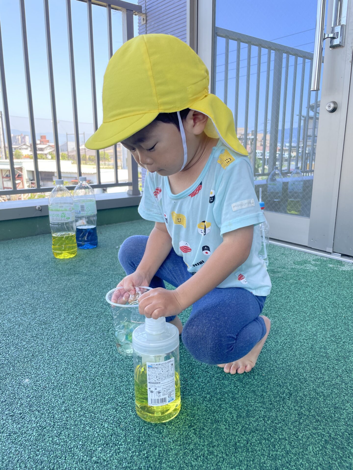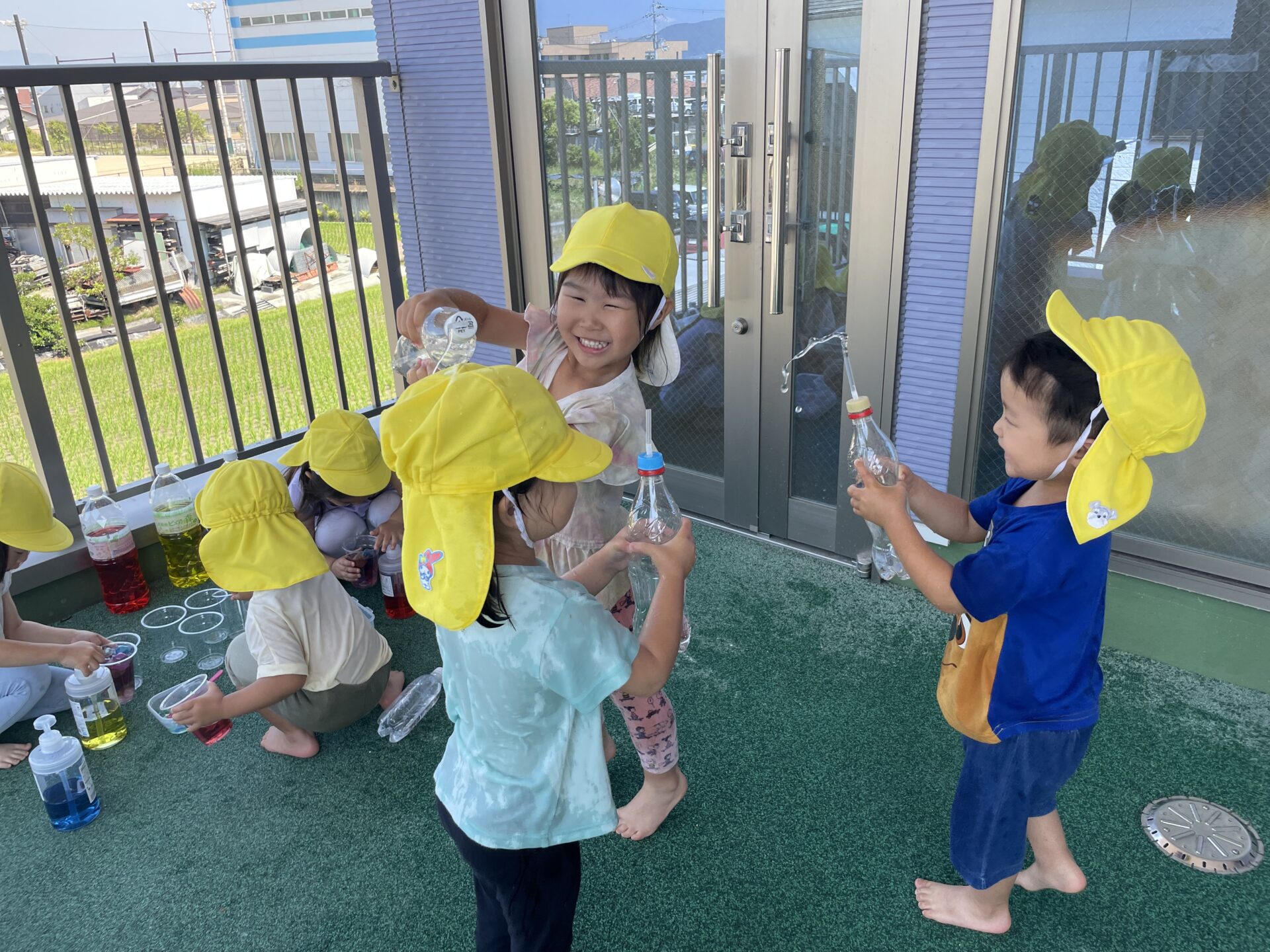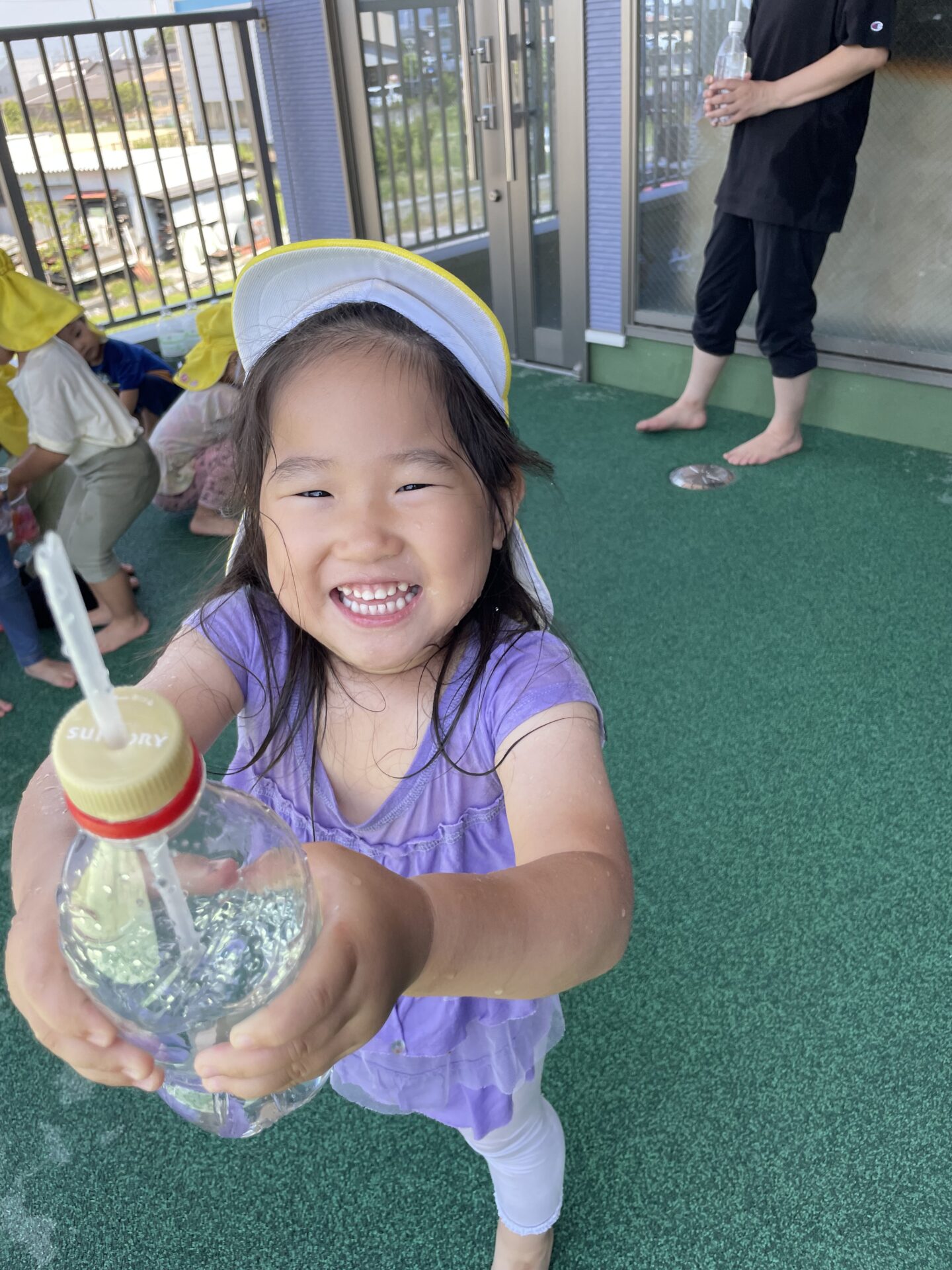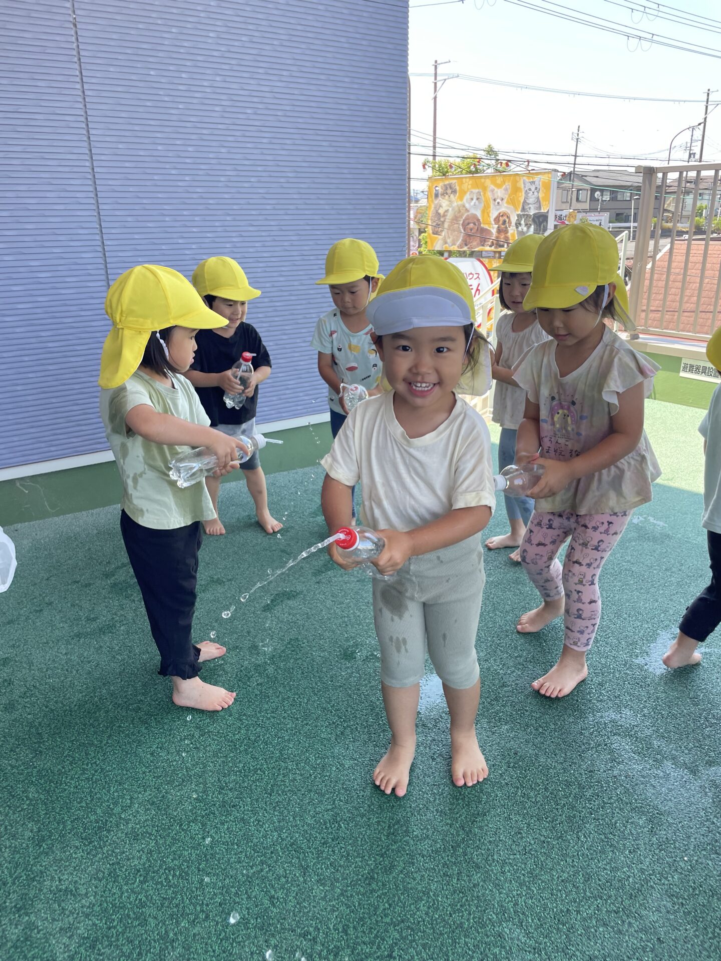 水鉄砲に水を入れてお友だちや保育者と水の掛け合いっこ😁
