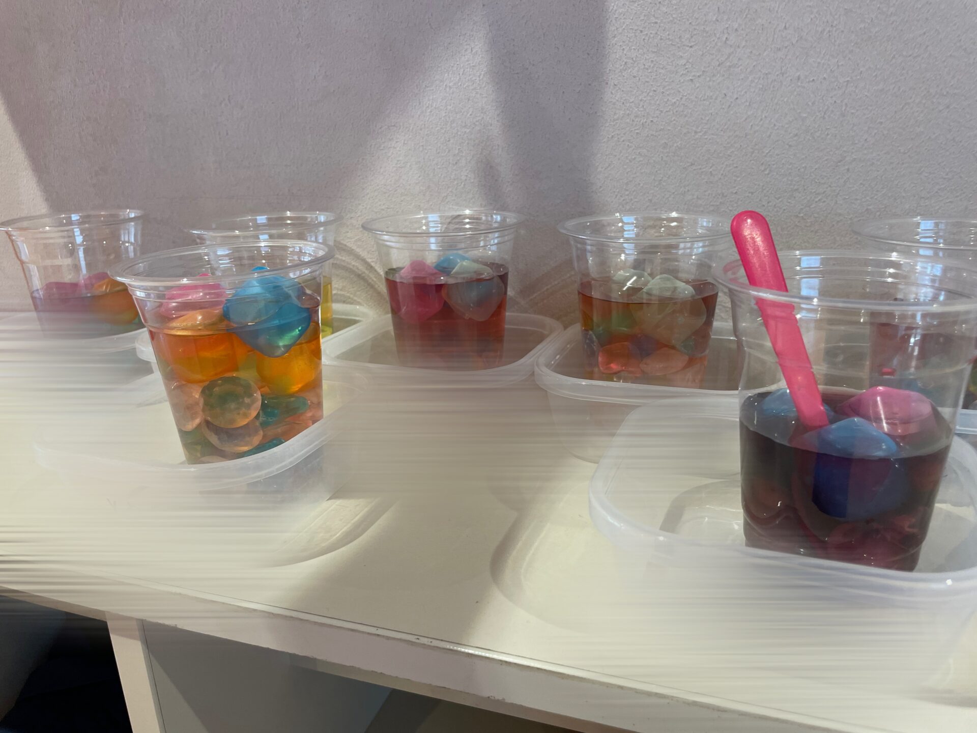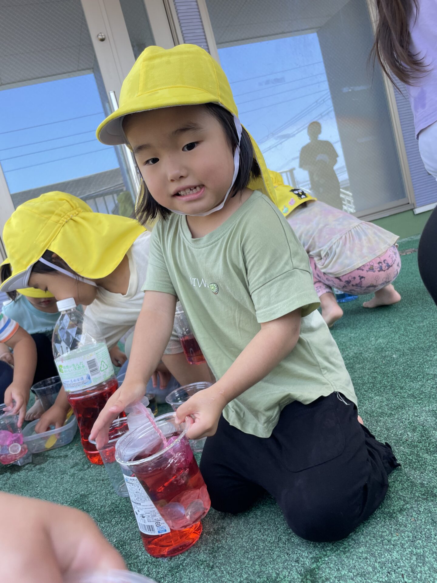 色水遊びもして、赤青黄の3色を混ぜてオリジナルジュース作り🍹