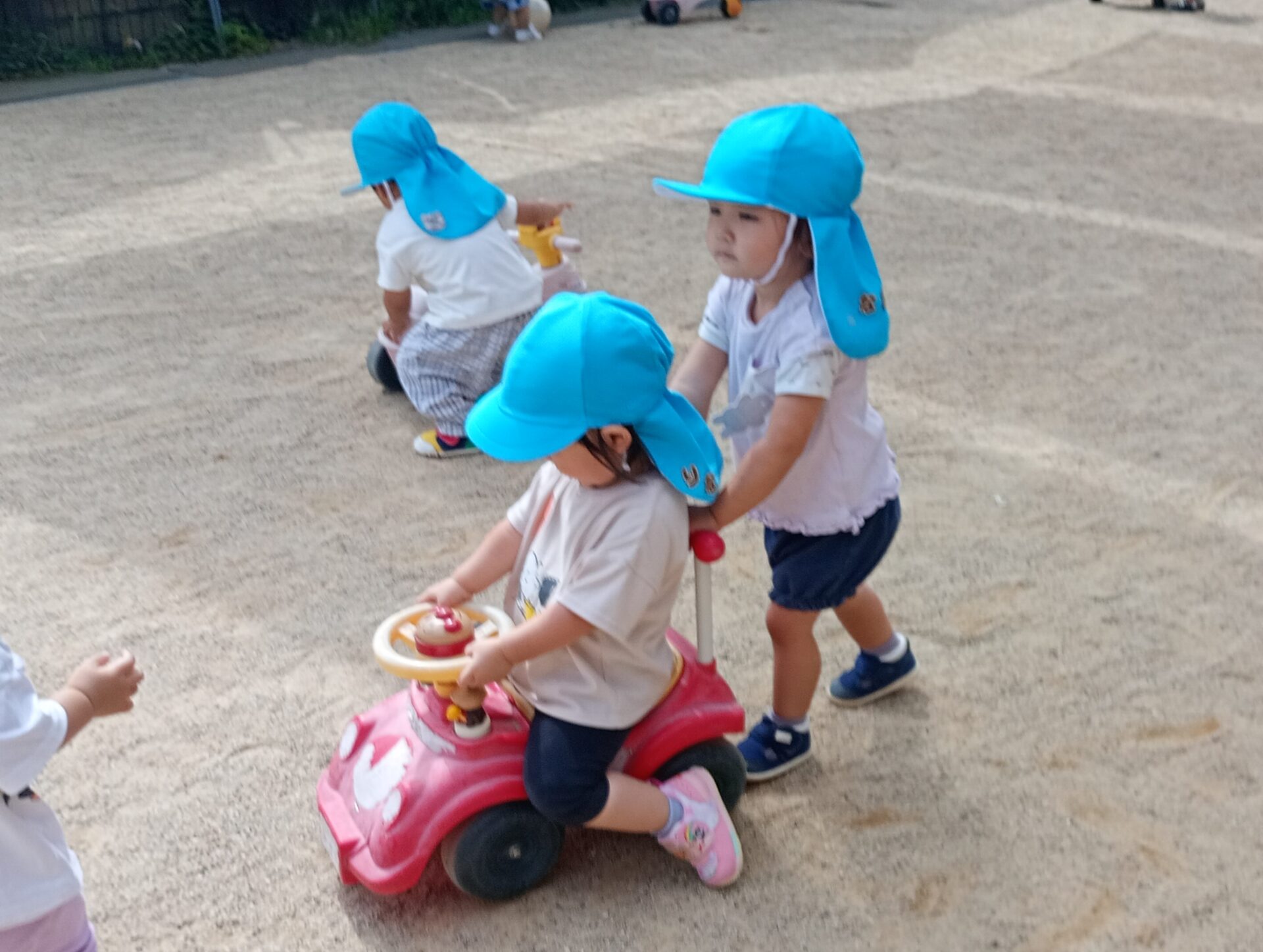 自分が乗るだけでなく、友だちの乗るコンビカーを後ろから押すことも