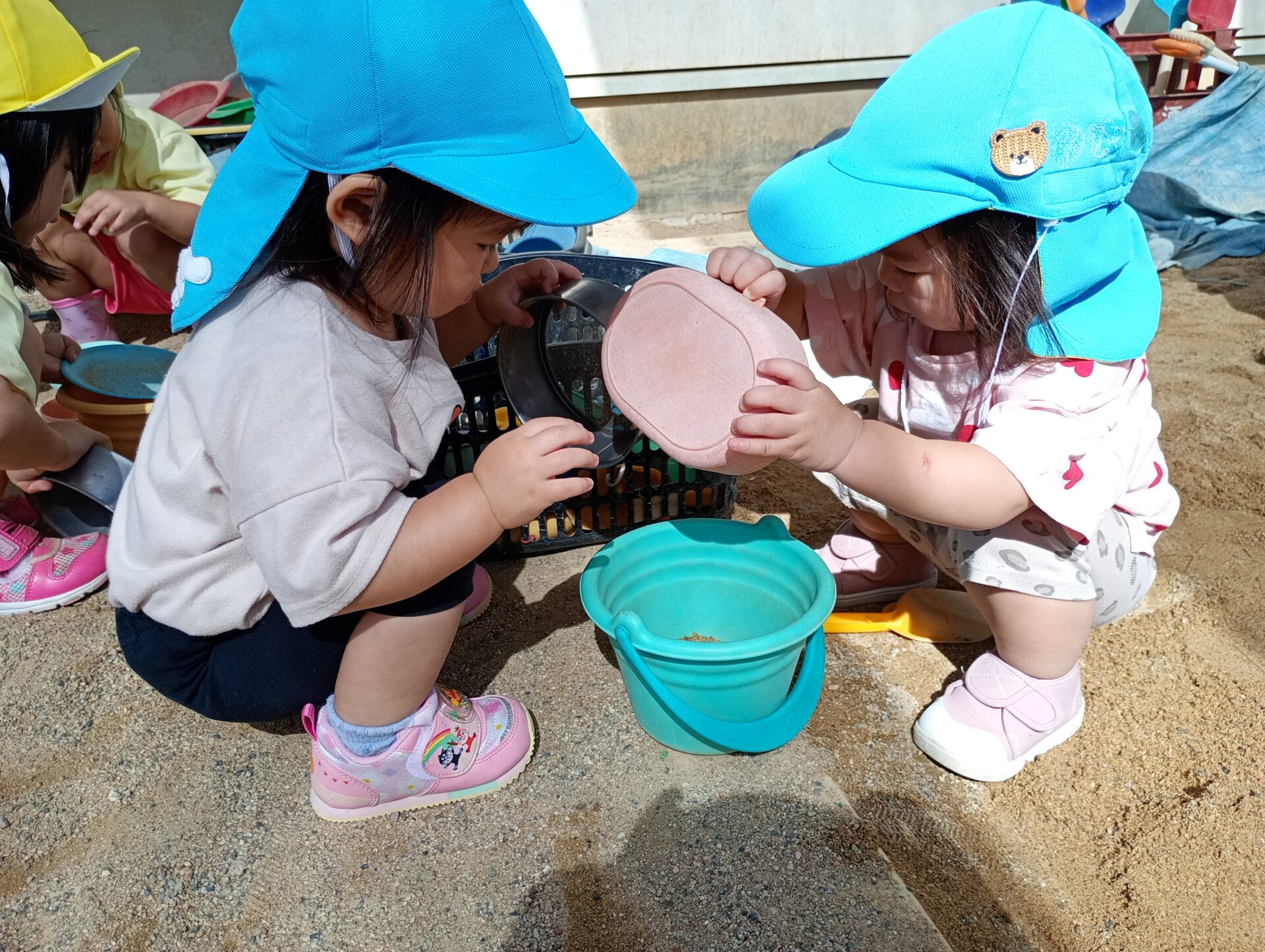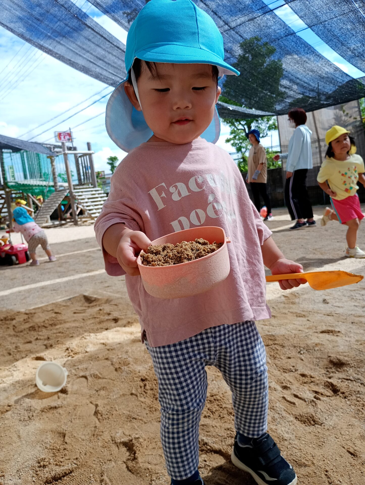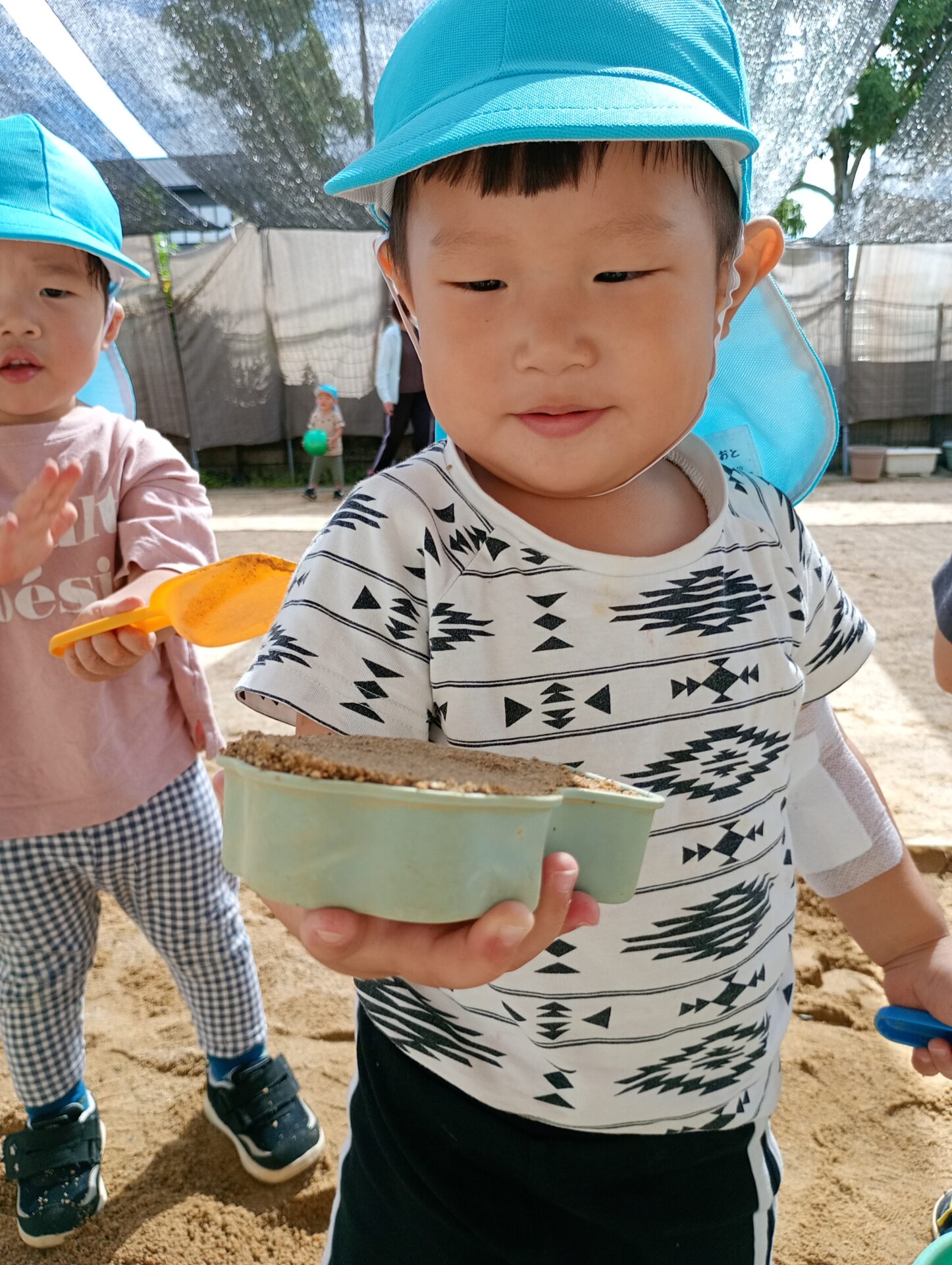 砂場では、ただ砂に触れるだけではなく、お皿やお弁当箱に入れて