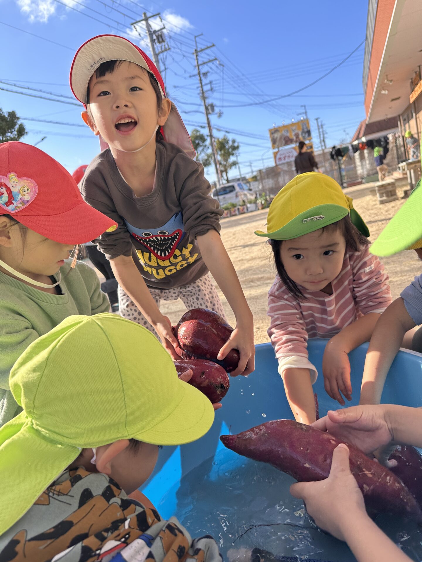 まず、そらチーム、くじらチームで、先月収穫したさつまいもを、丁寧に洗います。
