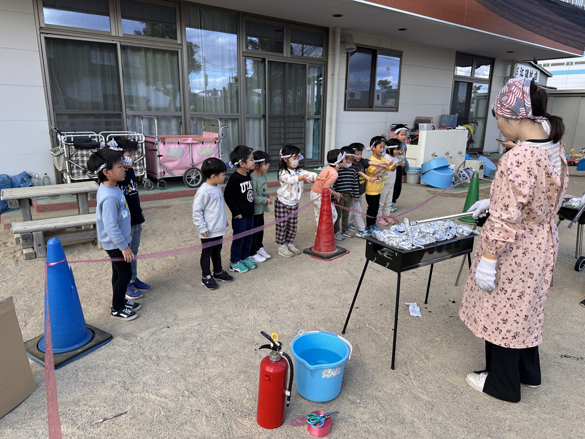 園庭では、園長先生と主任先生が、炭火の準備をしてくれています。