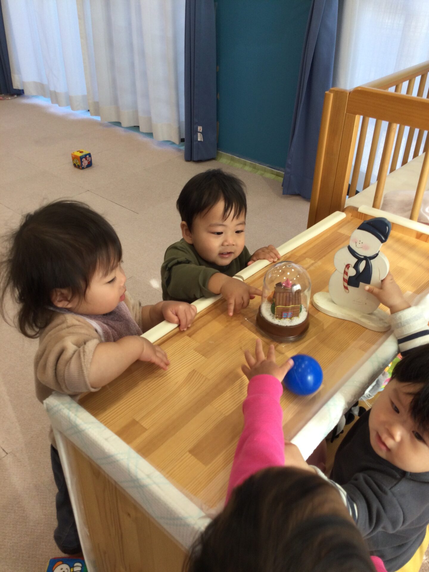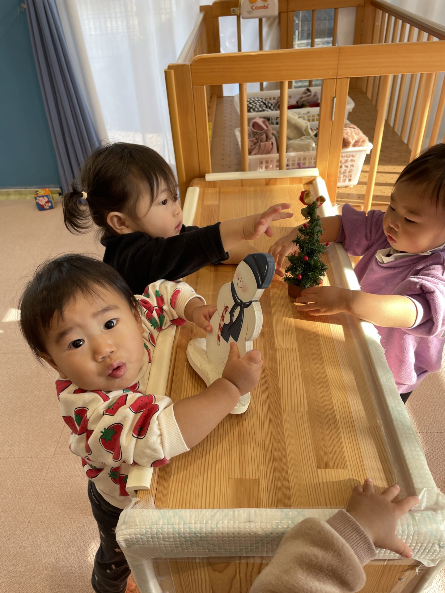 部屋に飾ってあるクリスマスの置き物にも興味津々です!