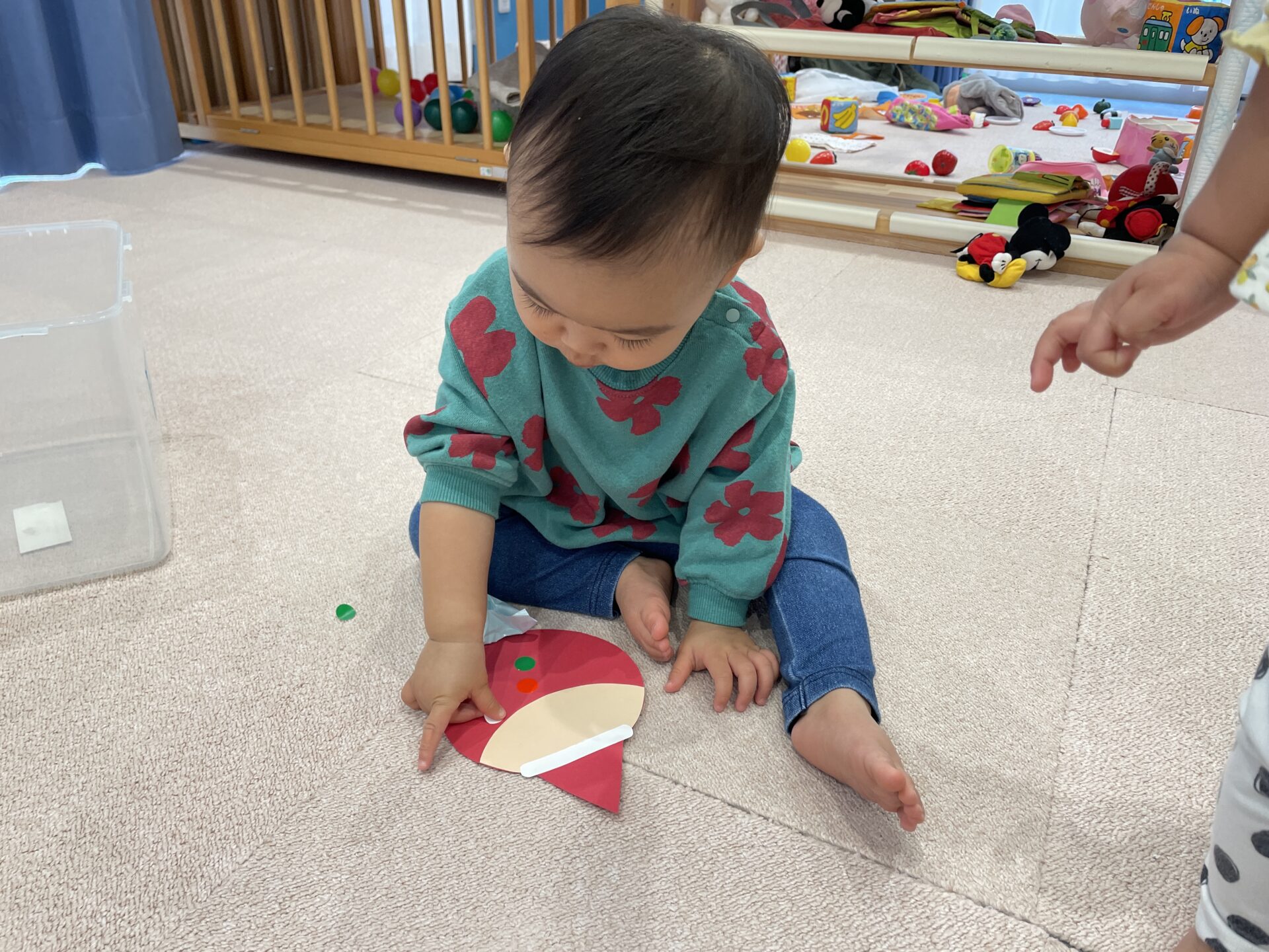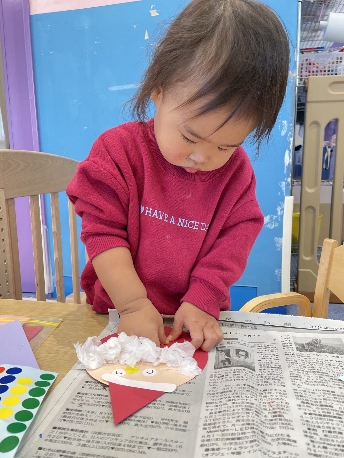 お部屋では花紙をくしゃくしゃ丸めて、サンタクロースのお顔に貼りました。
