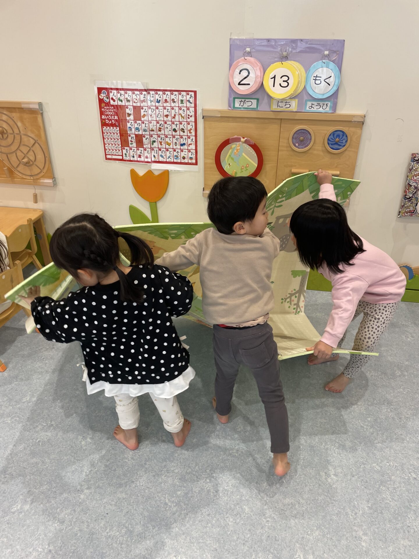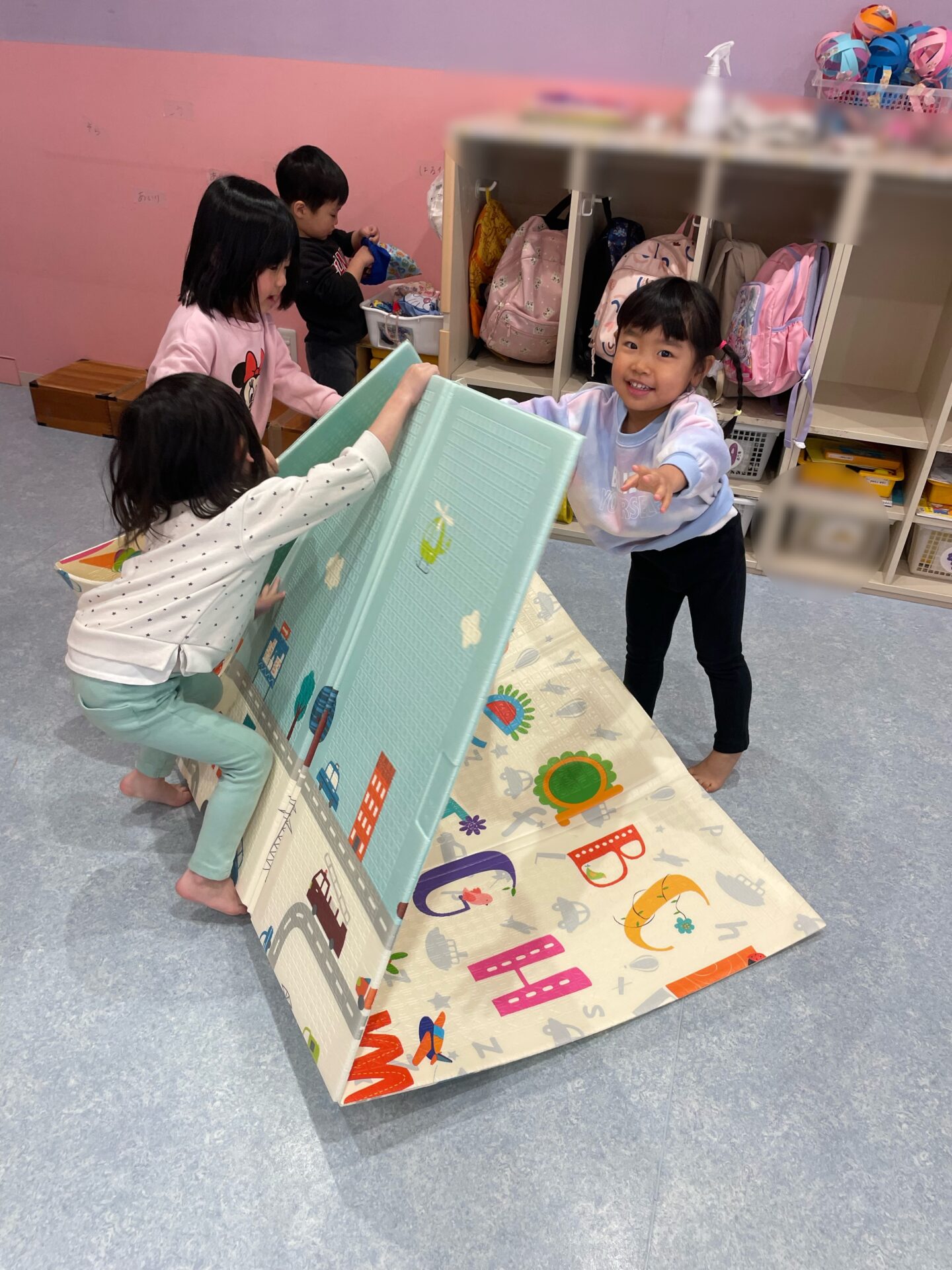 大きなマットを「ちょっとてつだって~」「こっちもって~!」と声をかけ合いながら