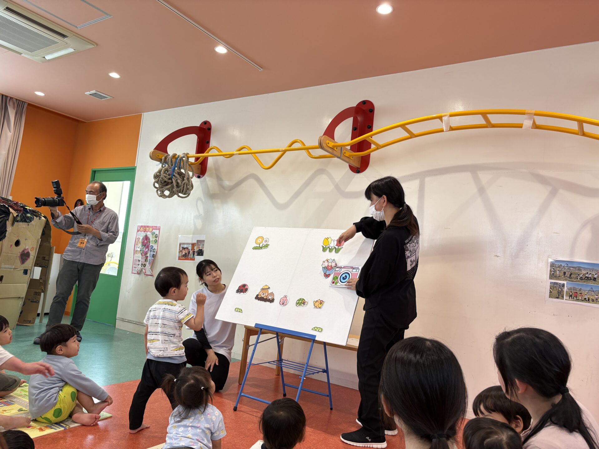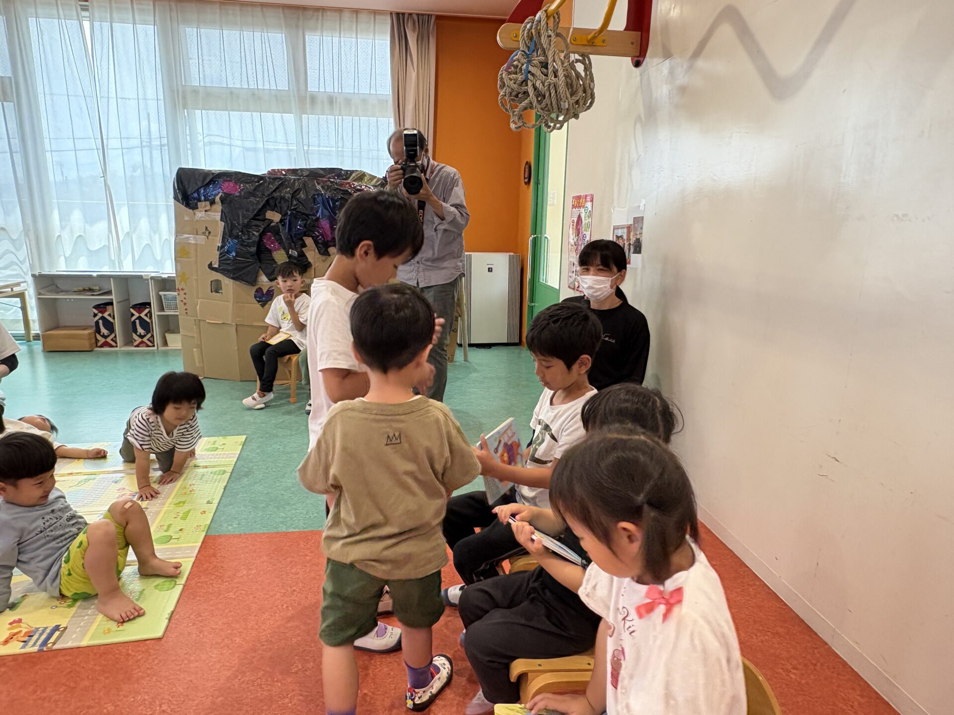 保育者からの出し物は「魔法のカメラ」です。パシャ!魔法のカメラで写すと…あれ?お花が花束に変わったよ!不思議だね😝