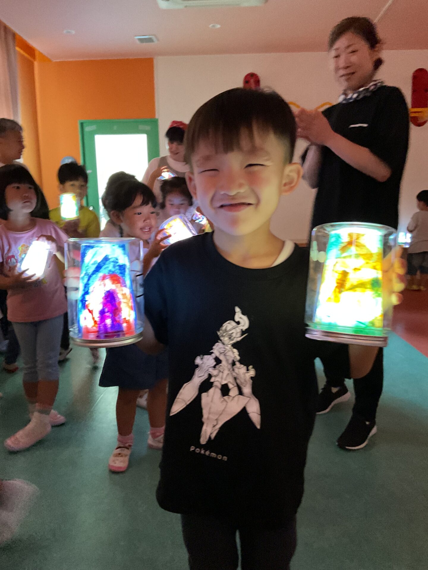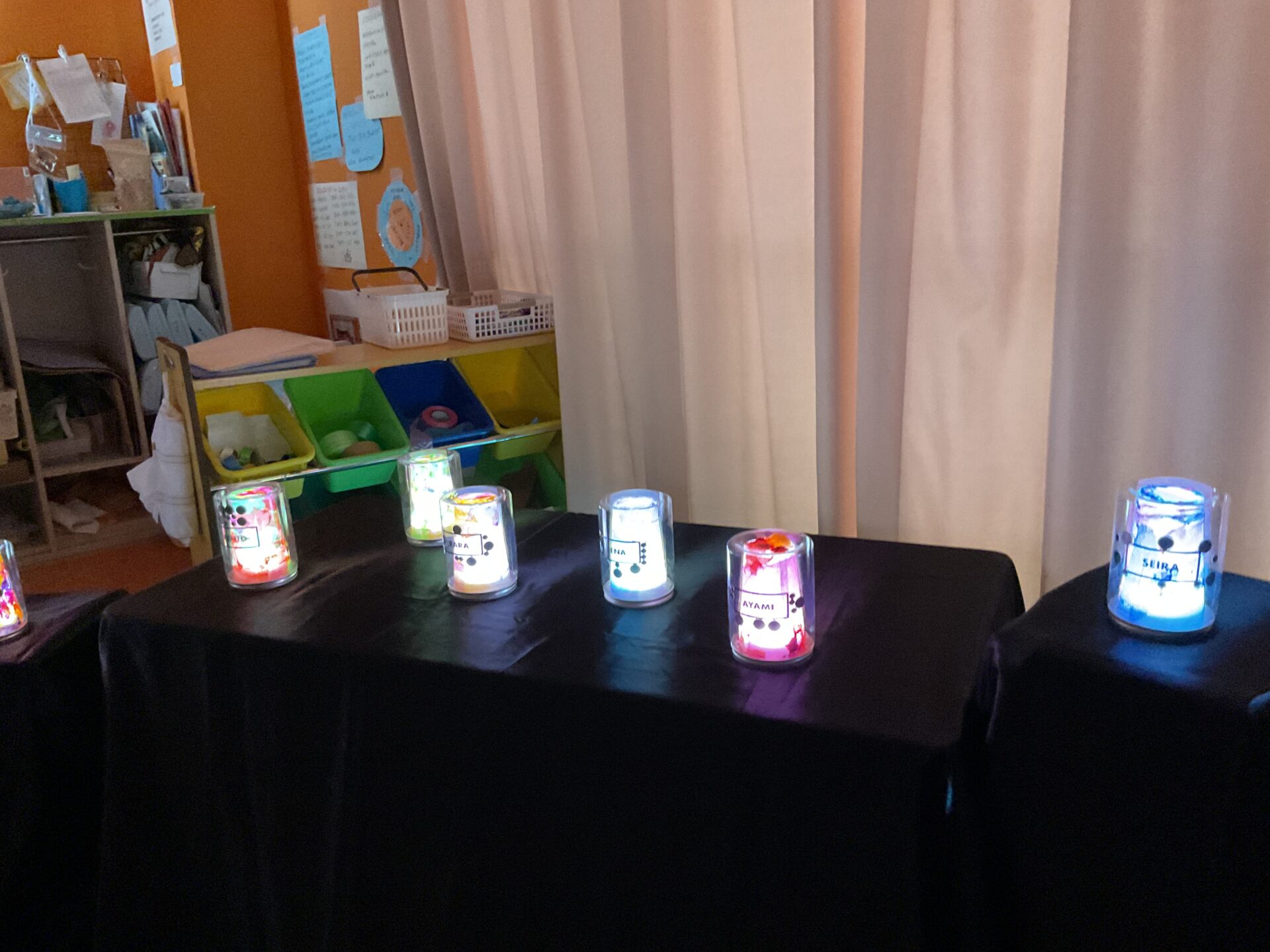 子ども達が入室しまーす。ドキドキ、ワクワク。入室すると思わず「わーぁっ。」と歓声があがりました。目を輝かせ見つめるまなざしの先には、ステンドグラスのような輝きの手作りランプ。