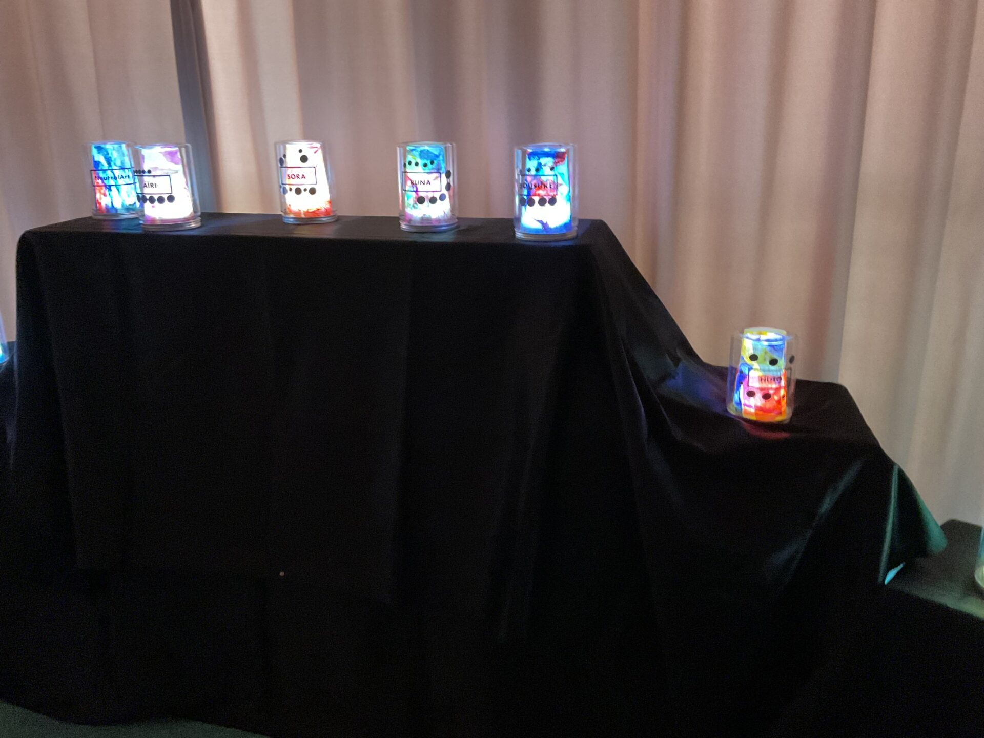 ここからはなお先生と保育者が子ども達の作品を素敵に飾るためにひと工夫。カーテンを閉め、カップとケースとライトをセットして、作品と対面した時の子ども達の反応を想像しながら、大人は部屋のセッティングにいそしみます。