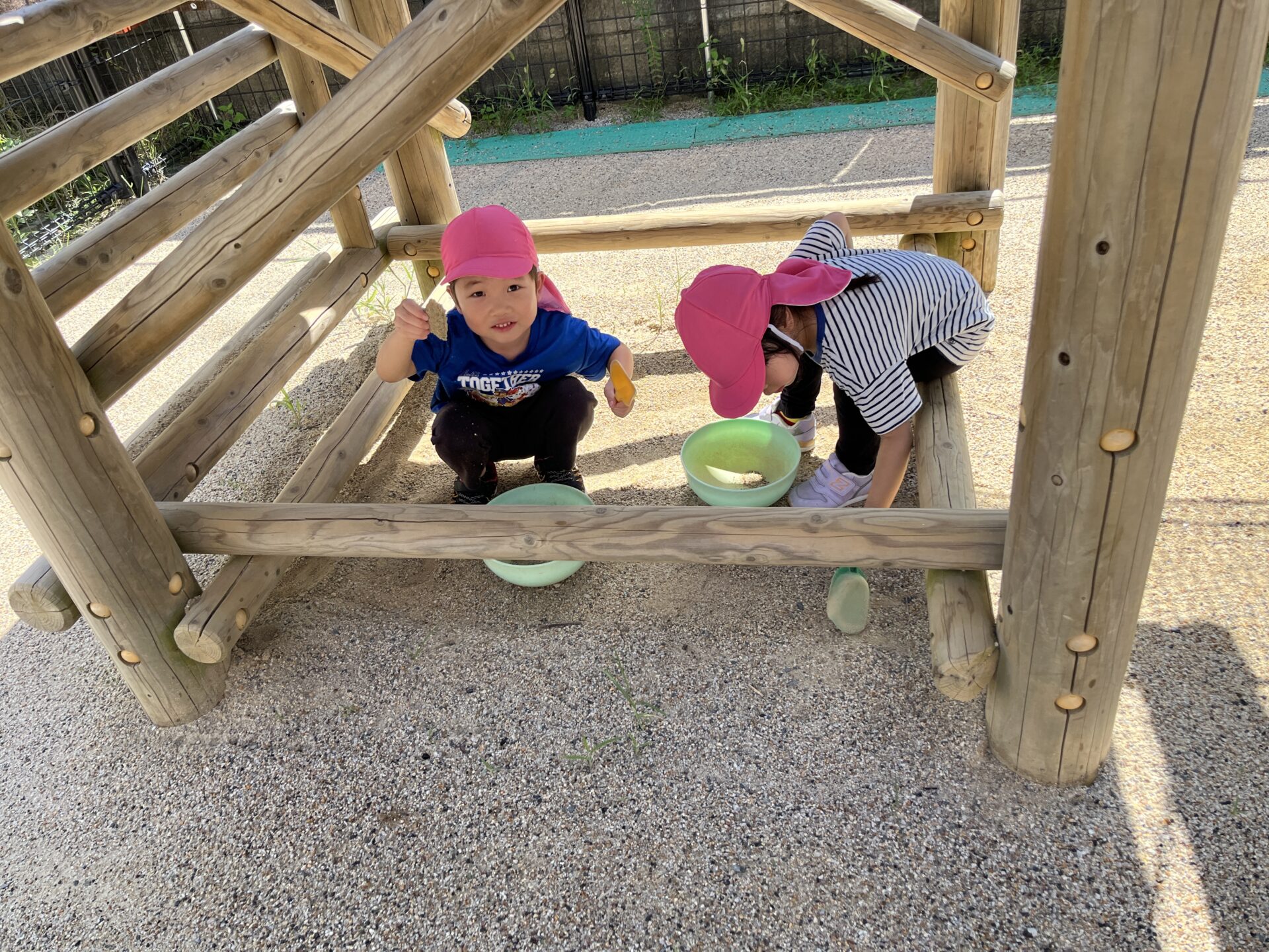 暑さを避けて、遊具の下の日陰でごちそう作りの始まり~🥄