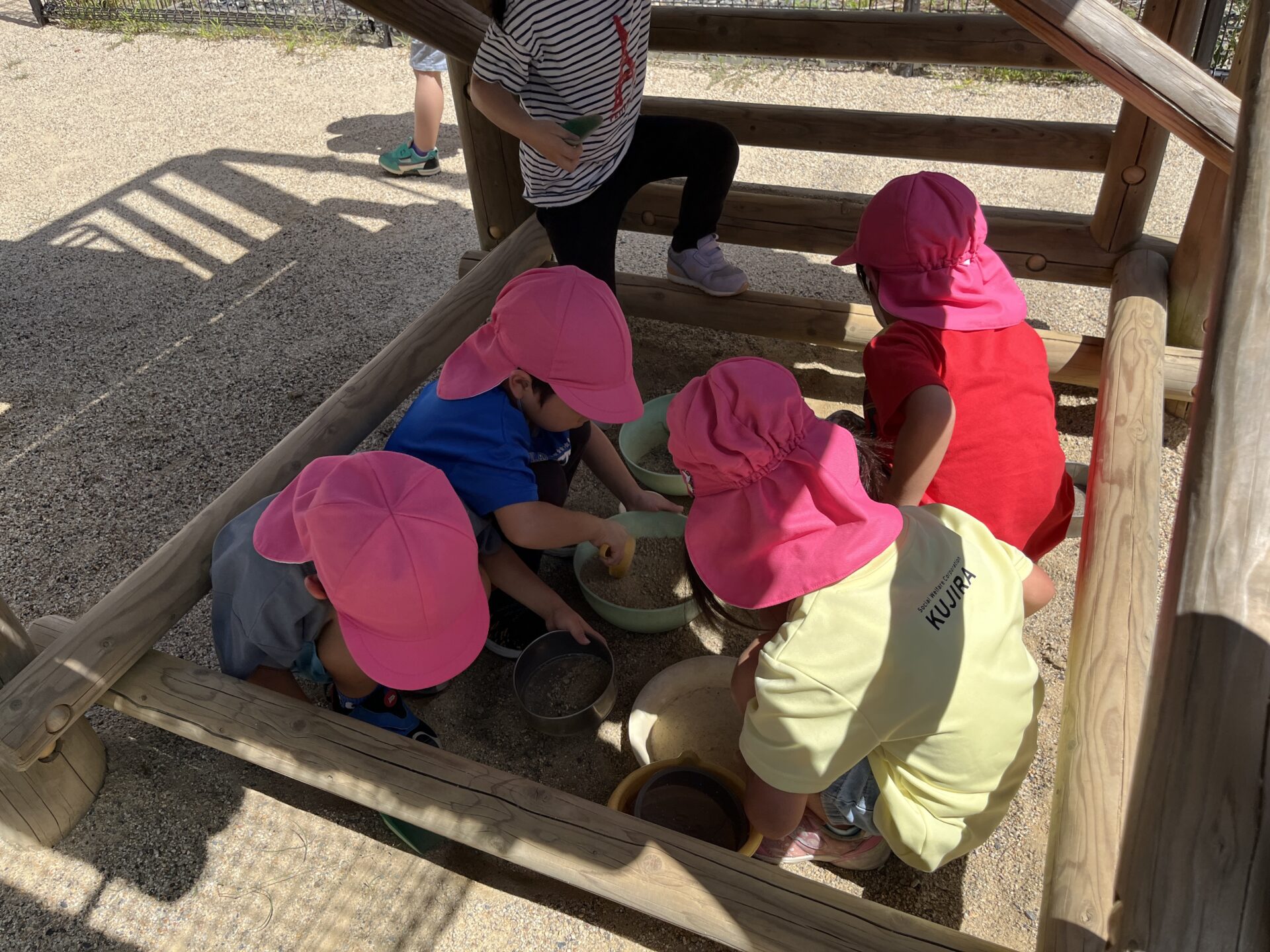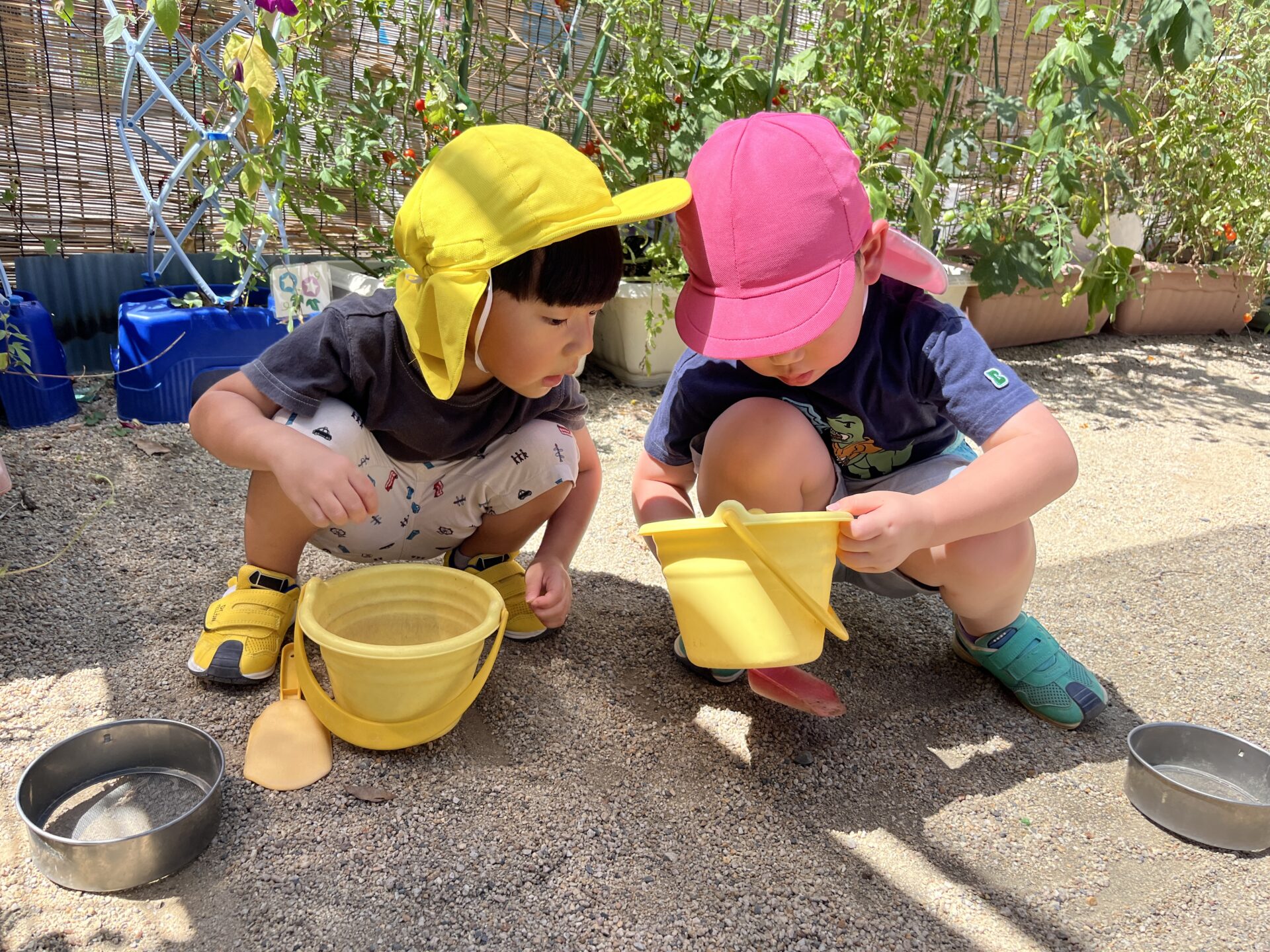 「さっき捕まえたダンゴムシいる❓」「ちょうだい‼️バケツに入れて~!」「お砂も入っちゃうけど、いい❓」「うん‼️いいよー」と、可愛らしいやり取りが見られました☺️