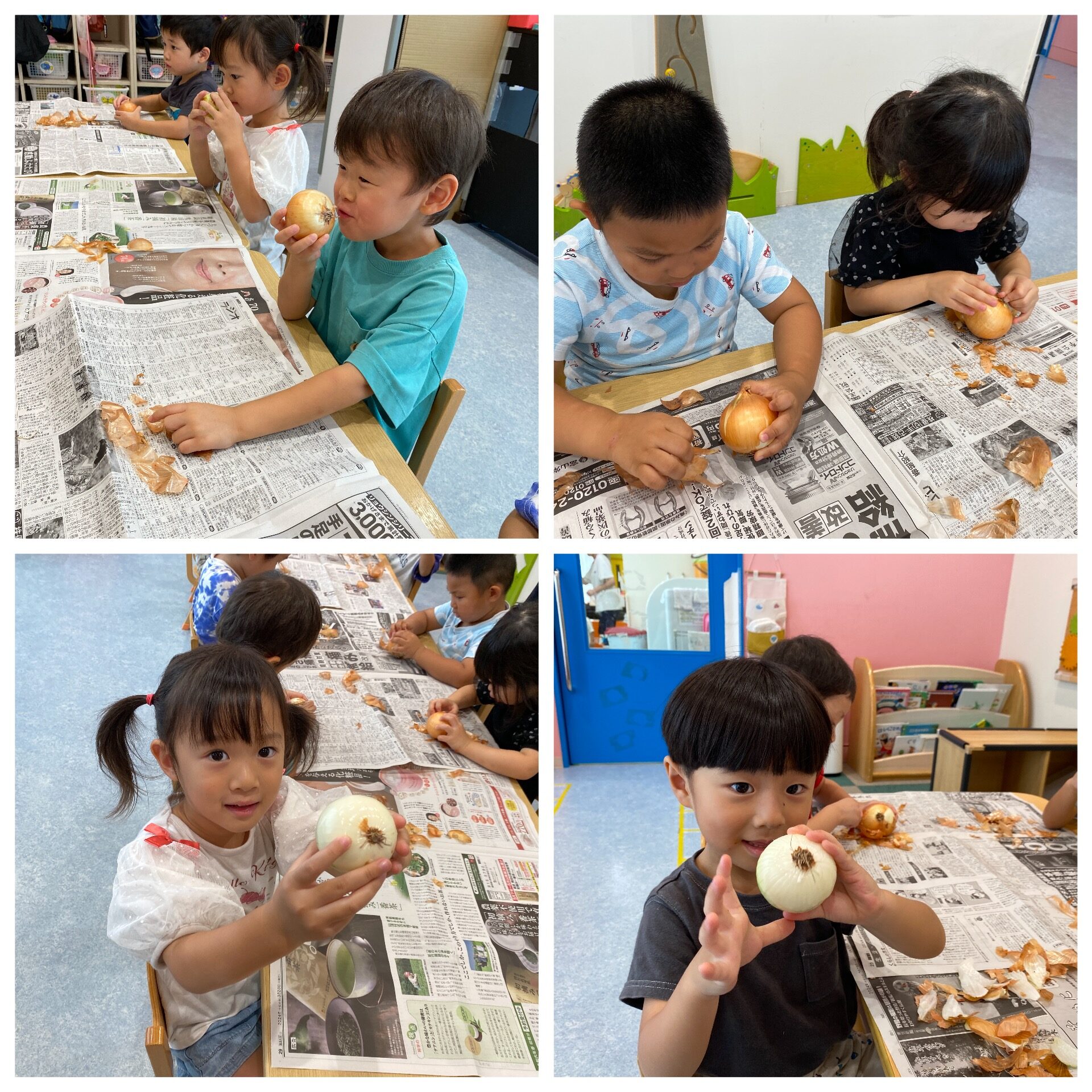 別日には、給食室のお手伝いで玉ねぎの皮をむきました。