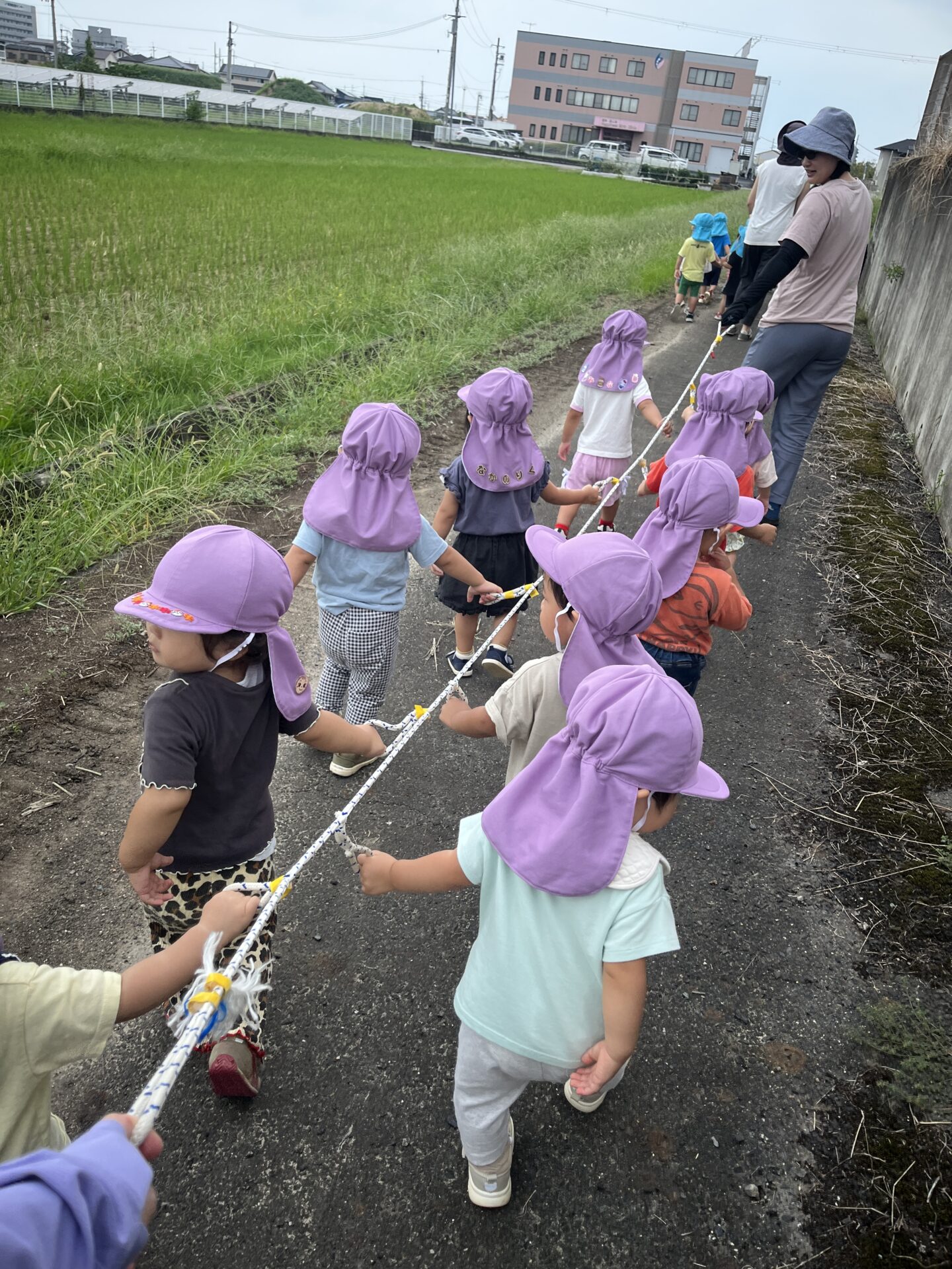 まだ長い距離を歩けないお友だちはお散歩車に乗って、歩くお友だちを見守ります。